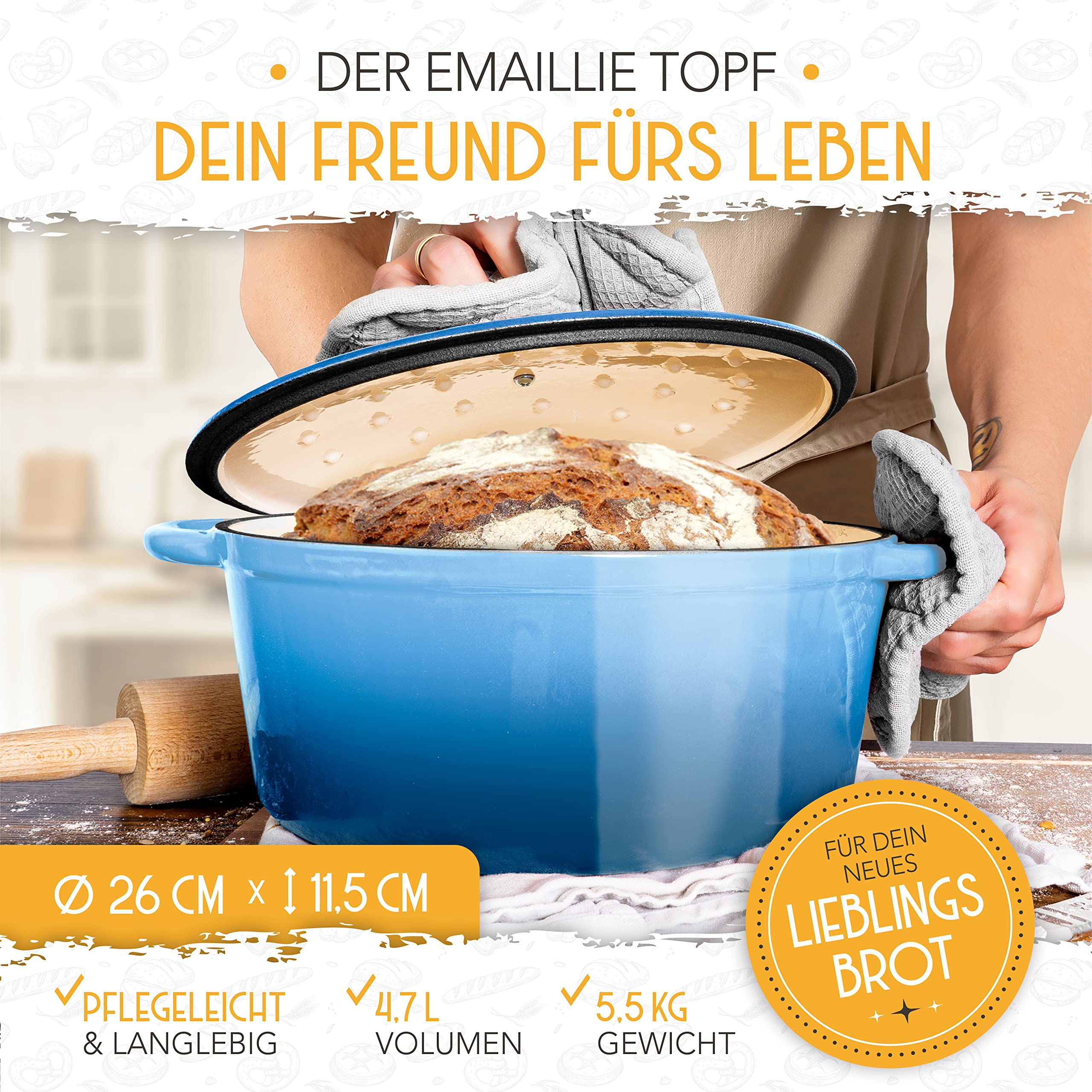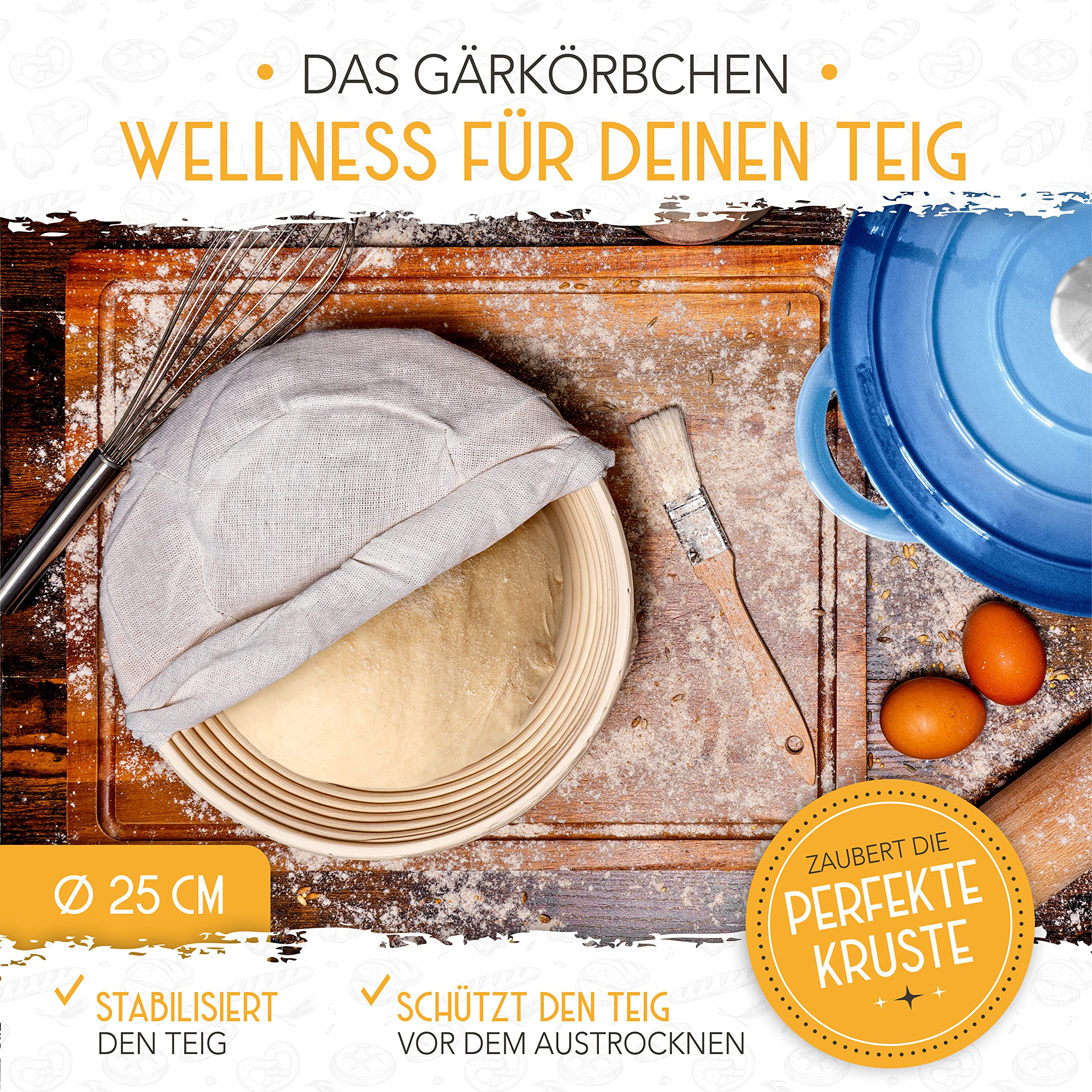 KRUSTENZAUBER Gusseisen Topf Brot Backen [inkl. Gärkorb] - Hochwertiger Emaille Topf 26cm - Idealer gusseiserner Brottopf zum Backen, Gusseisentopf Brotbacken, Brot Backen Zubehör
