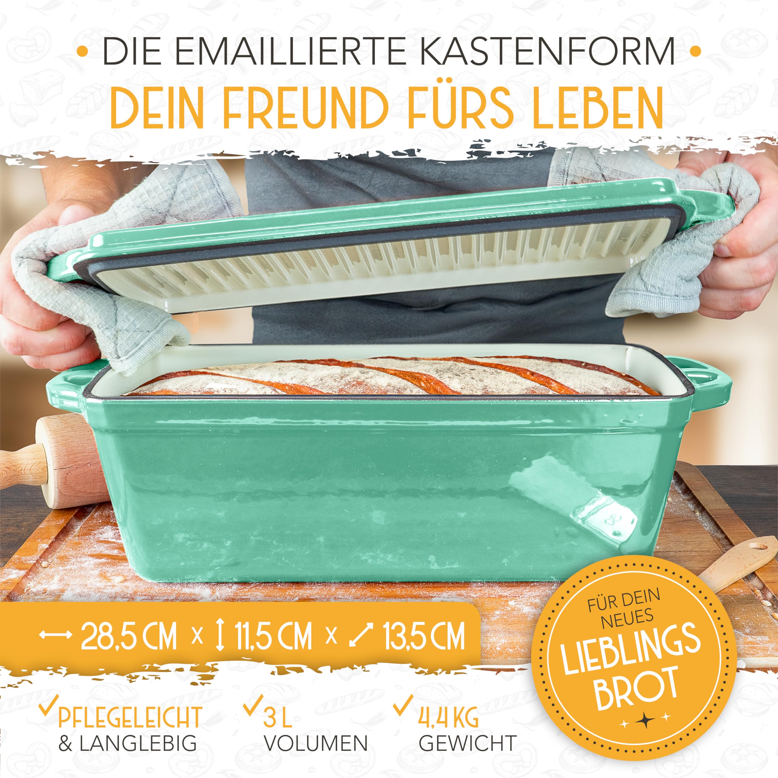 KRUSTENZAUBER Emaille Brotbackfrom mit Deckel inkl. Gärkorb - Robuste 28cm Backform aus Gusseisen - Ideal als Kastenform, Toastbrot Backform, Brotform, Gusseisen Topf Brot backen Zubehör, Brottopf