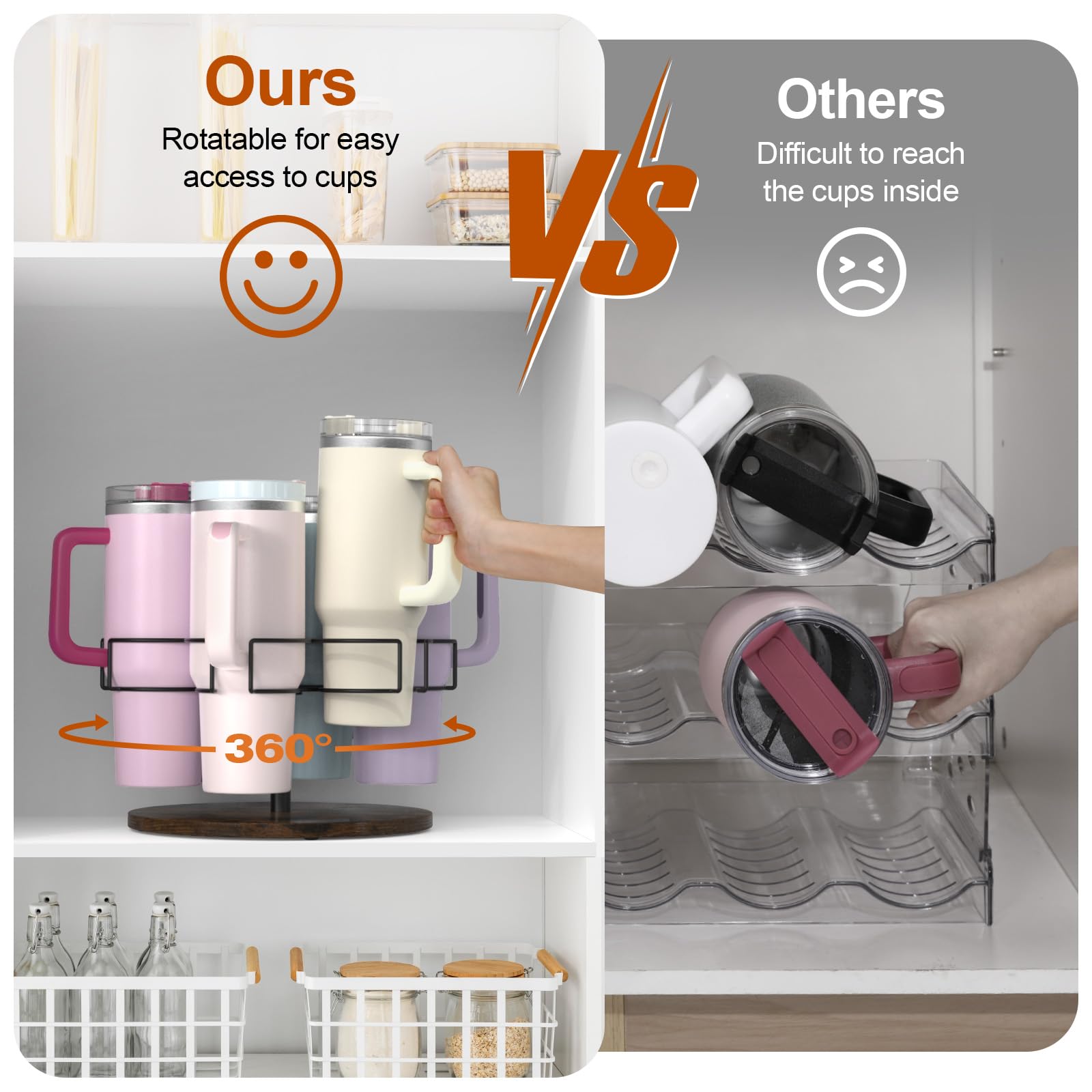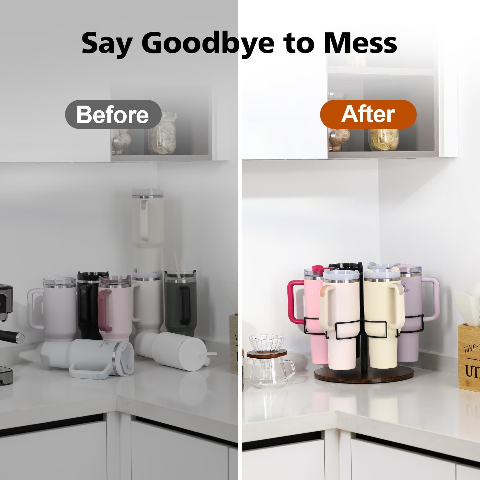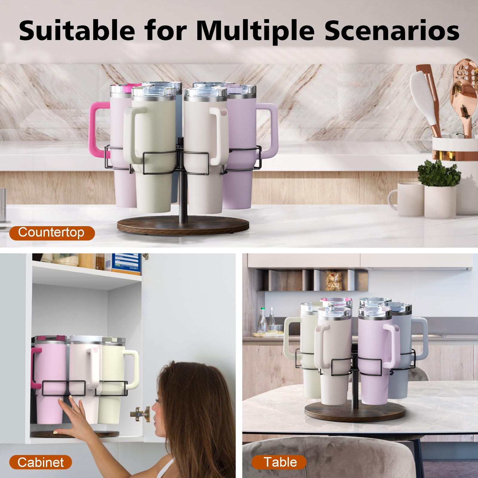 Drehbares Design: Mit dem drehbaren Design kann der Wasserflaschenhalter durch leichtes Drehen des 6-Ring-Becherhalters gedreht werden. Die Becher sind leicht zu erreichen, sehr praktisch und perfekt für die Aufbewahrung im Schrank.