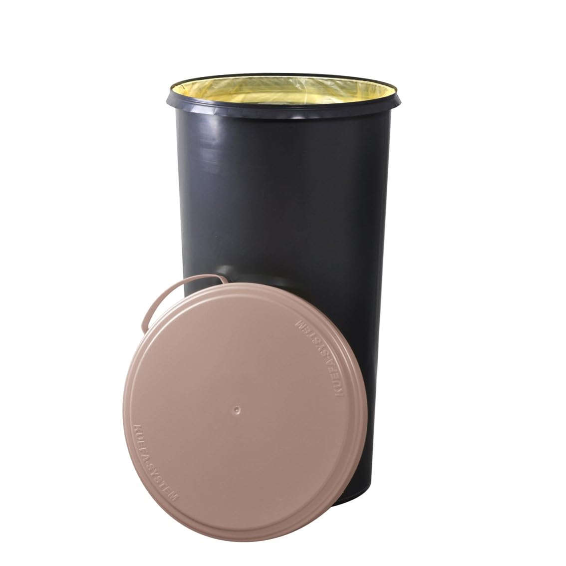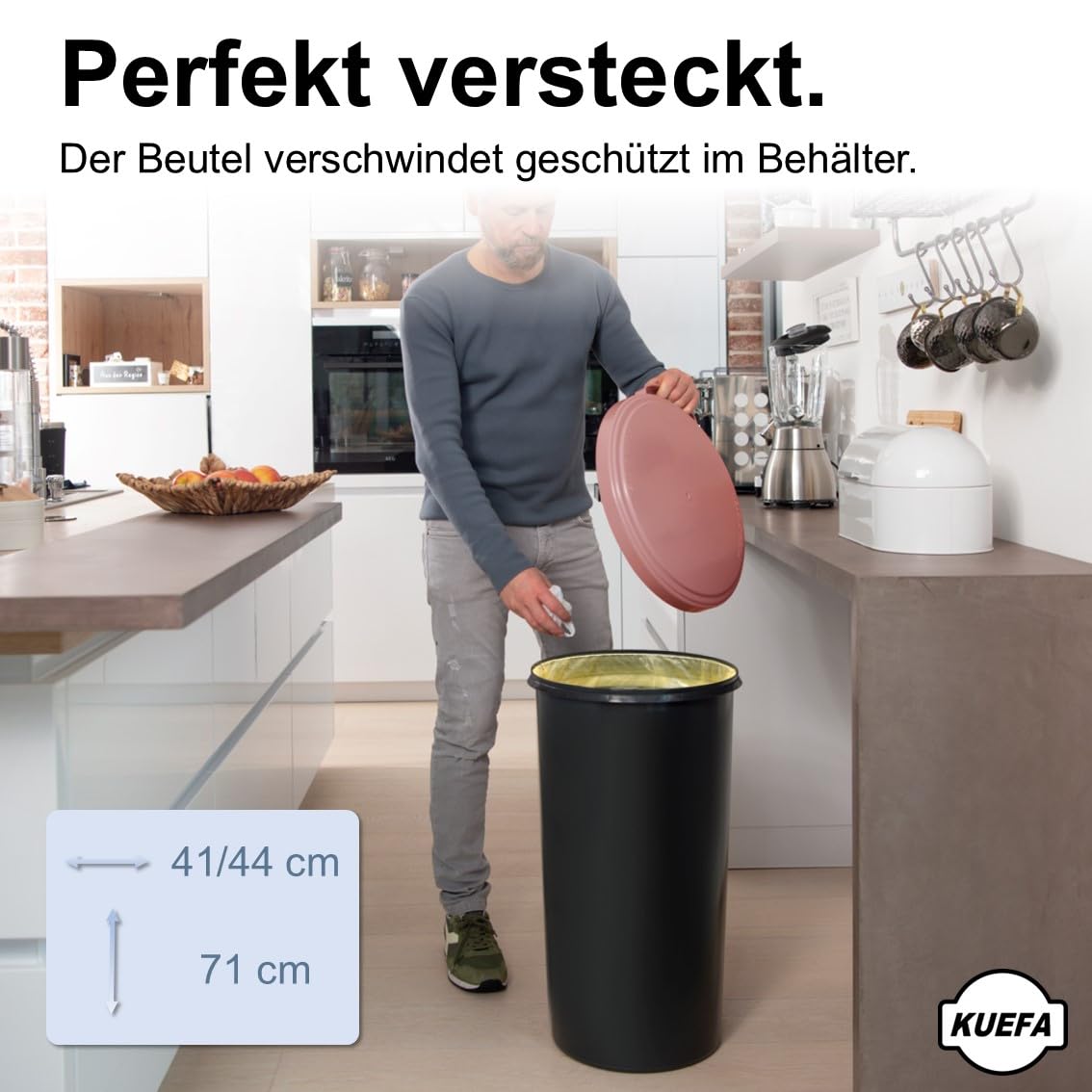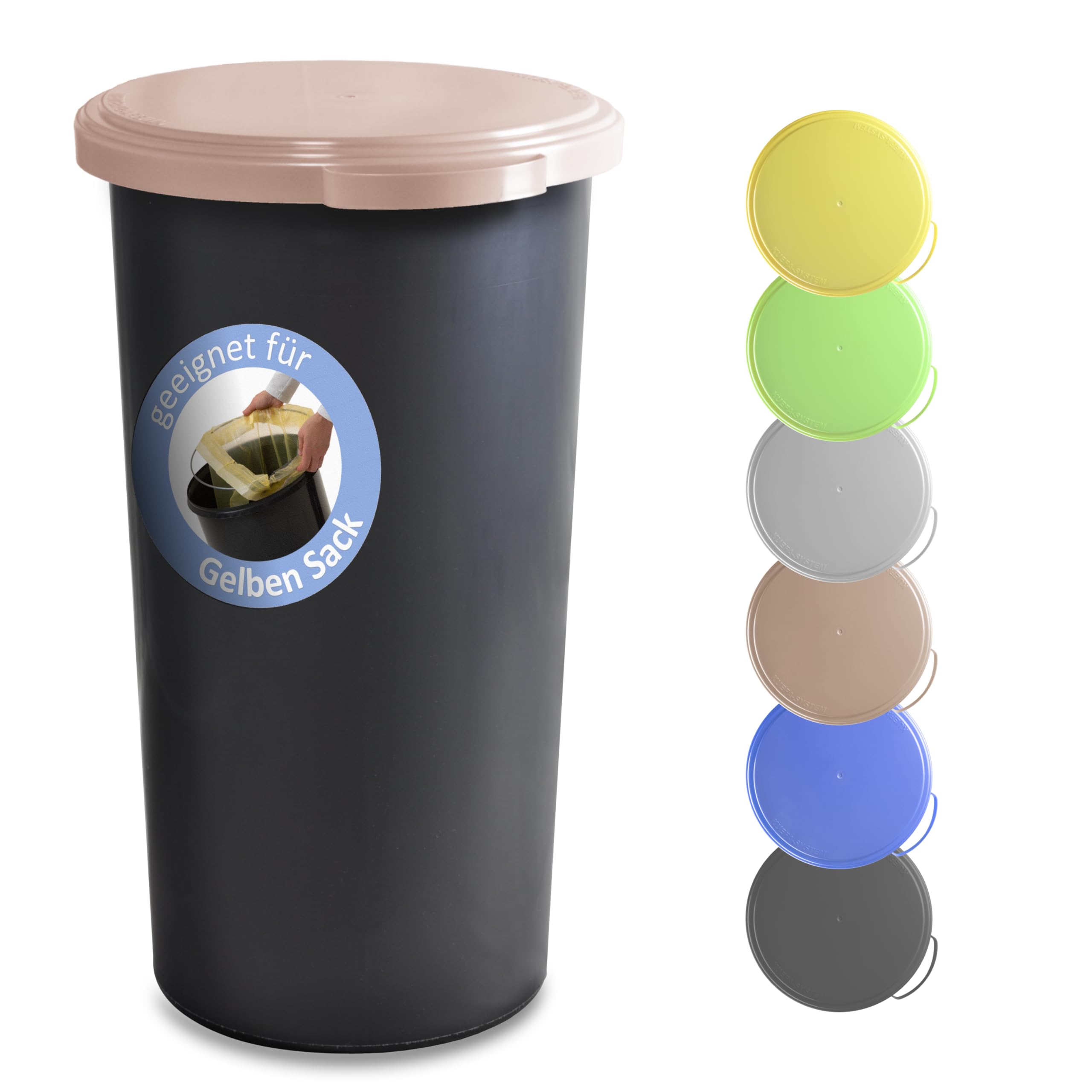 Der hochwertige KUEFA 60L Sammelbehälter besteht aus einer geschlossenen Kunststofftonne, einem beschichteten Stahlring (zur Fixierung des Abfallbeutels) und einem eleganten, geruchsdichten & UV-beständigen Kunststoffdeckel. Durch die einfache und effektive Halterung verschwindet der Müllsack vollständig im Unterteil und ist im geschlossenen Zustand nicht mehr zu sehen. Der Sammelbehälter ist für Säcke des Dualen Systems Deutschland mit einer Breite grösser 59 cm ausgelegt und kann aber auch mit anderen Müllbeuteln entsprechender Grösse verwendet werden. Der KUEFA Sammelbehälter ist universell einsetzbar und eignet sich aufgrund der unterschiedlichen Deckelfarben bestens zum Trennen, Sammeln und Aufbewahren von Pfandflaschen, Leergut, Altpapier, Streusalz, Grillkohle und Katzenstreu.