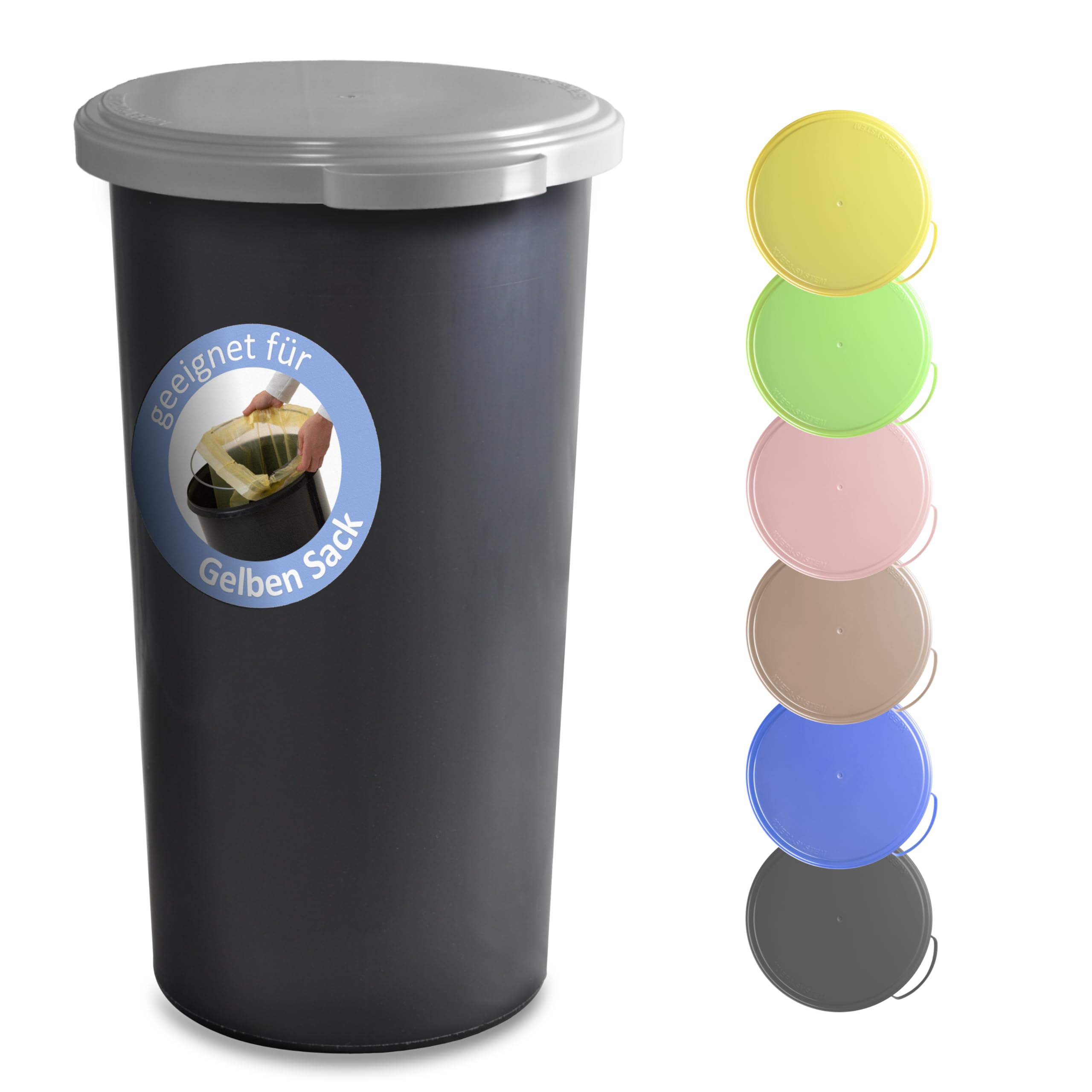 Der hochwertige KUEFA 60L Sammelbehälter besteht aus einer geschlossenen Kunststofftonne, einem beschichteten Stahlring (zur Fixierung des Abfallbeutels) und einem eleganten, geruchsdichten & UV-beständigen Kunststoffdeckel. Durch die einfache und effektive Halterung verschwindet der Müllsack vollständig im Unterteil und ist im geschlossenen Zustand nicht mehr zu sehen. Der Sammelbehälter ist für Säcke des Dualen Systems Deutschland mit einer Breite grösser 59 cm ausgelegt und kann aber auch mit anderen Müllbeuteln entsprechender Grösse verwendet werden. Der KUEFA Sammelbehälter ist universell einsetzbar und eignet sich aufgrund der unterschiedlichen Deckelfarben bestens zum Trennen, Sammeln und Aufbewahren von Pfandflaschen, Leergut, Altpapier, Streusalz, Grillkohle und Katzenstreu.