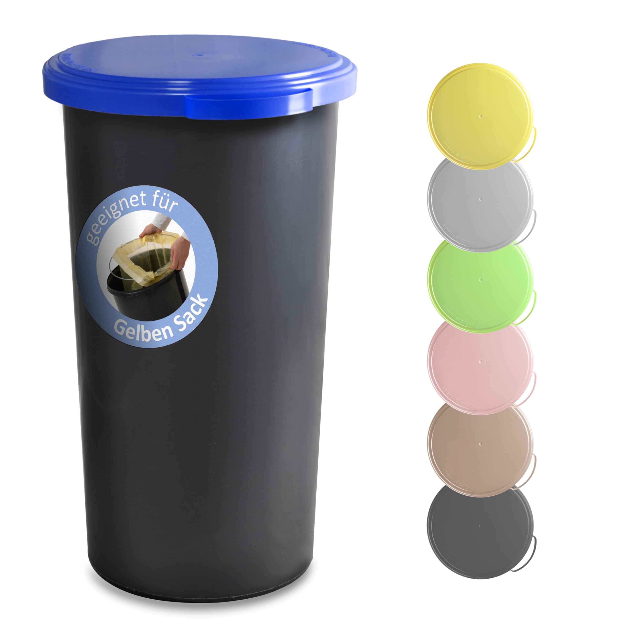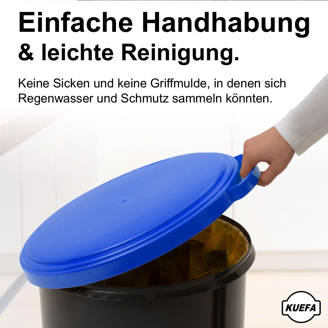 Der hochwertige KUEFA 60L Sammelbehälter besteht aus einer geschlossenen Kunststofftonne, einem beschichteten Stahlring (zur Fixierung des Abfallbeutels) und einem eleganten, geruchsdichten & UV-beständigen Kunststoffdeckel. Durch die einfache und effektive Halterung verschwindet der Müllsack vollständig im Unterteil und ist im geschlossenen Zustand nicht mehr zu sehen. Der Sammelbehälter ist für Säcke des Dualen Systems Deutschland mit einer Breite grösser 59 cm ausgelegt und kann aber auch mit anderen Müllbeuteln entsprechender Grösse verwendet werden. Der KUEFA Sammelbehälter ist universell einsetzbar und eignet sich aufgrund der unterschiedlichen Deckelfarben bestens zum Trennen, Sammeln und Aufbewahren von Pfandflaschen, Leergut, Altpapier, Streusalz, Grillkohle und Katzenstreu.