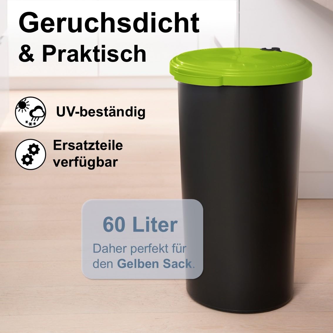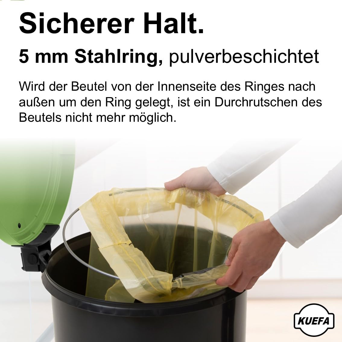 Der hochwertige KUEFA VL 60L Mülleimer besteht aus einer geschlossenen Kunststofftonne, einem beschichteten Stahlring (zur Fixierung des Abfallbeutels) und einem eleganten, geruchsdichten & UV-beständigen Kunststoffdeckel mit Scharnier. Durch die einfache und effektive Halterung verschwindet der Müllsack vollständig im Unterteil und ist im geschlossenen Zustand nicht mehr zu sehen. Der Sammelbehälter ist für Säcke des Dualen Systems Deutschland mit einer Breite grösser 59 cm ausgelegt und kann aber auch mit anderen Müllbeuteln entsprechender Grösse verwendet werden. Der KUEFA Sammelbehälter ist universell einsetzbar und eignet sich aufgrund der unterschiedlichen Deckelfarben bestens zum Trennen, Sammeln und Aufbewahren von Pfandflaschen, Leergut, Altpapier, Streusalz, Grillkohle und Katzenstreu.