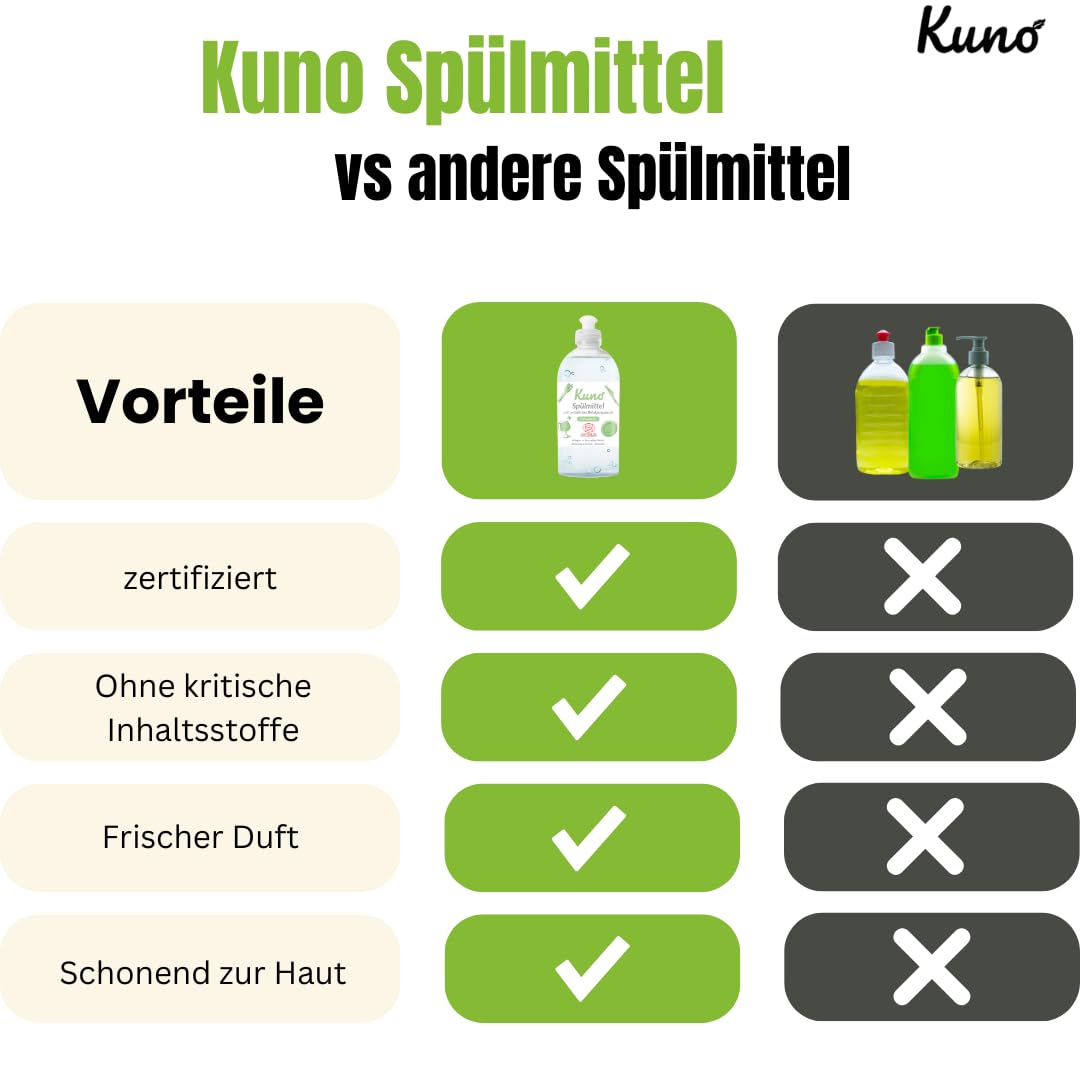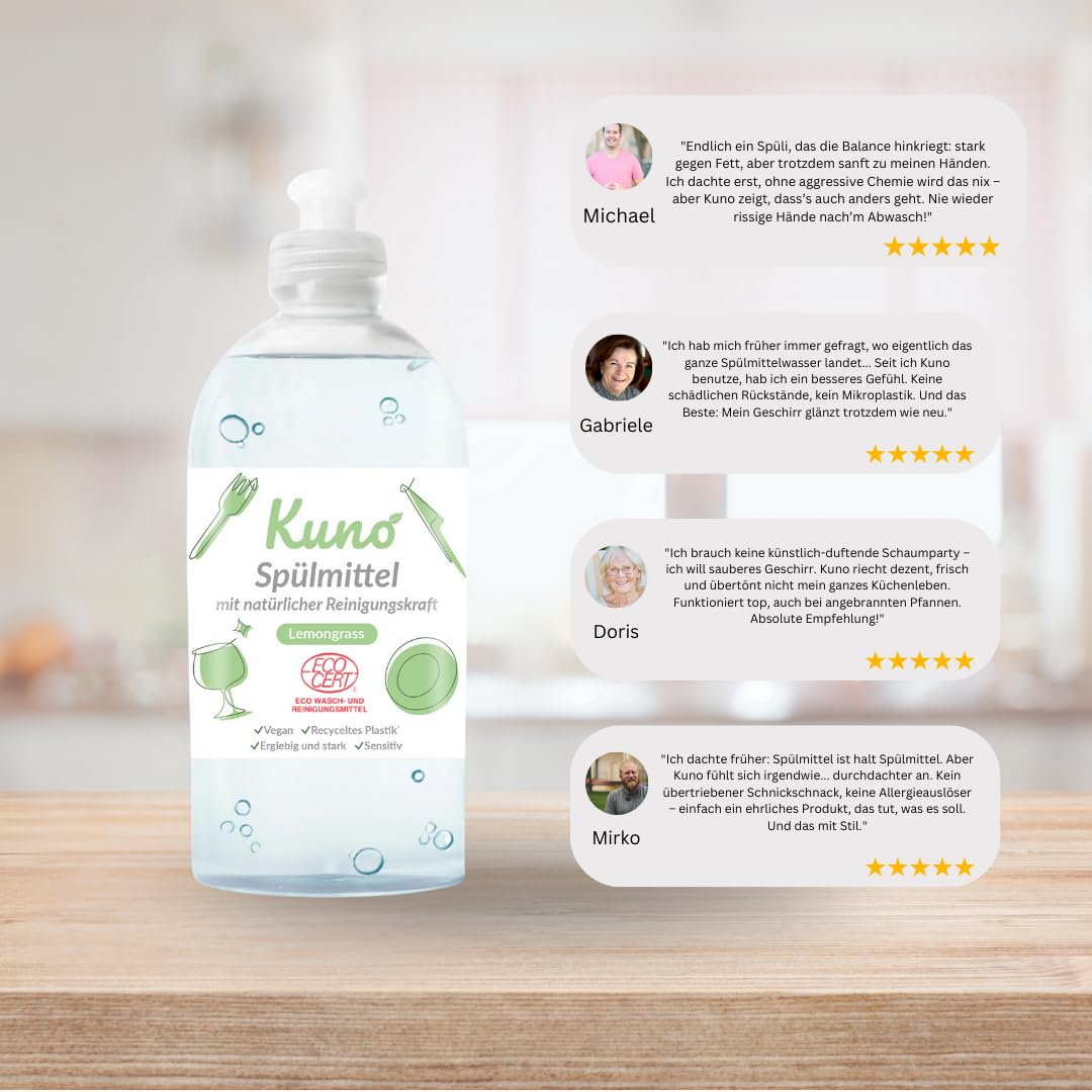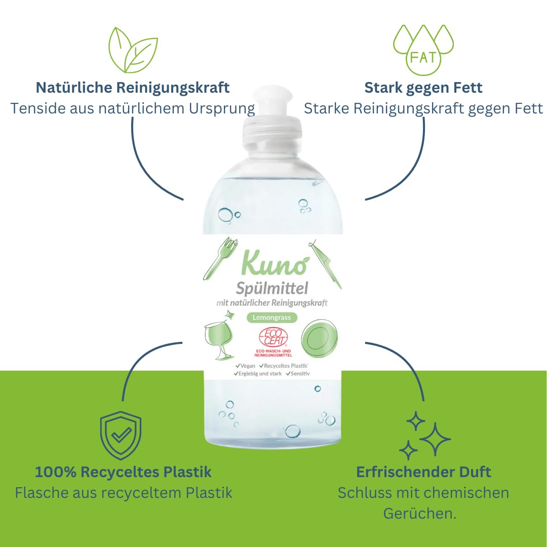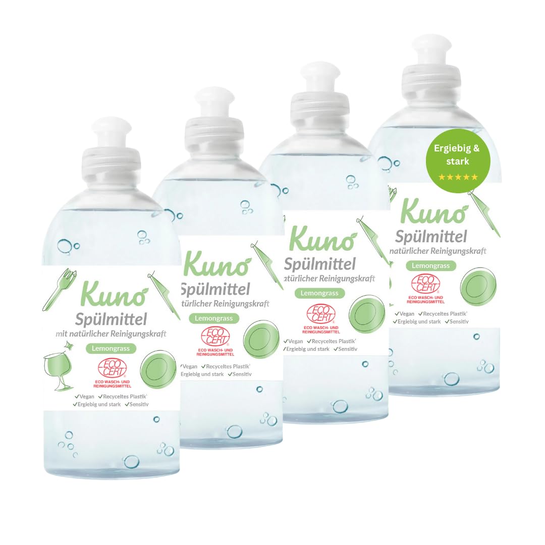 Kuno - Geschirrspülmittel, biologisch abbaubar, vegan, Lemongrass, hautpflegend durch Urea, entfettet, flüssig, ergiebig und stark (500 ml, 4er Pack)