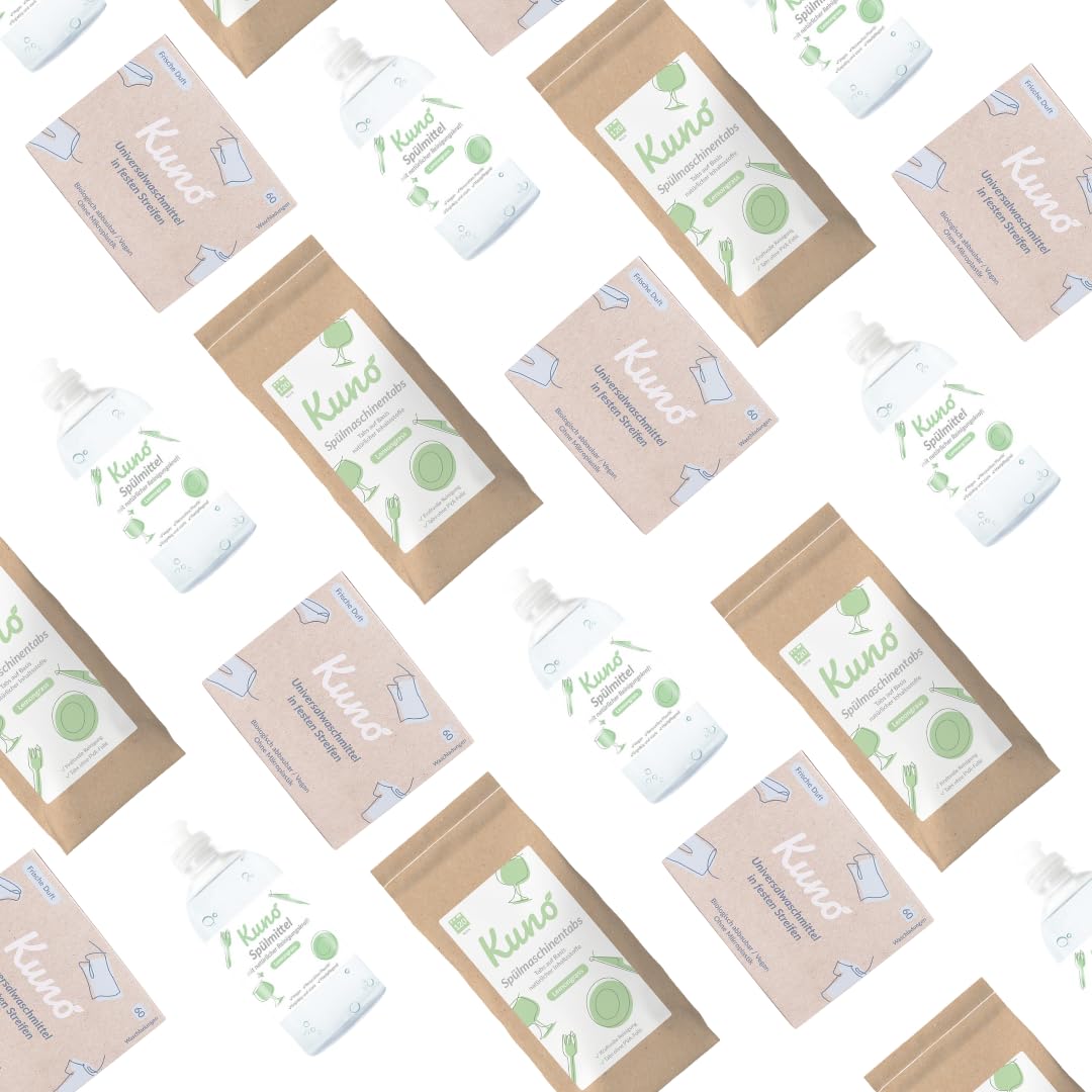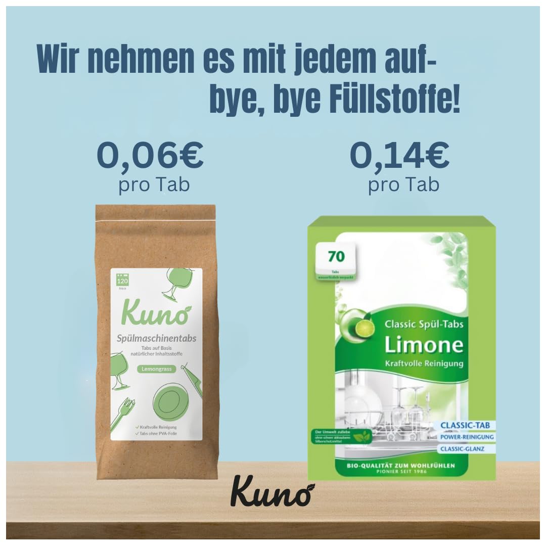 Kuno Spülmaschinentabs - 480 Tabs - Biologisch abbaubare Geschirrspültabs ohne Plastik - Effektive Reinigung - Frischer Lemongrass Duft (4er Pack, 480, stück)
