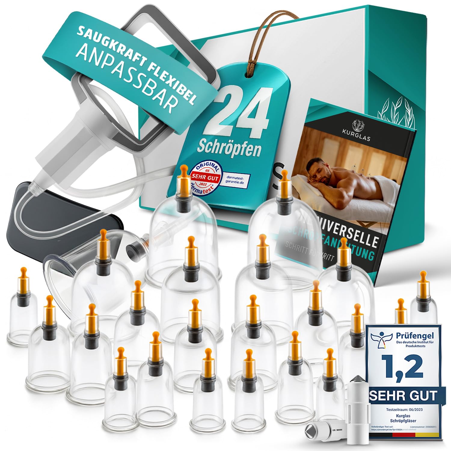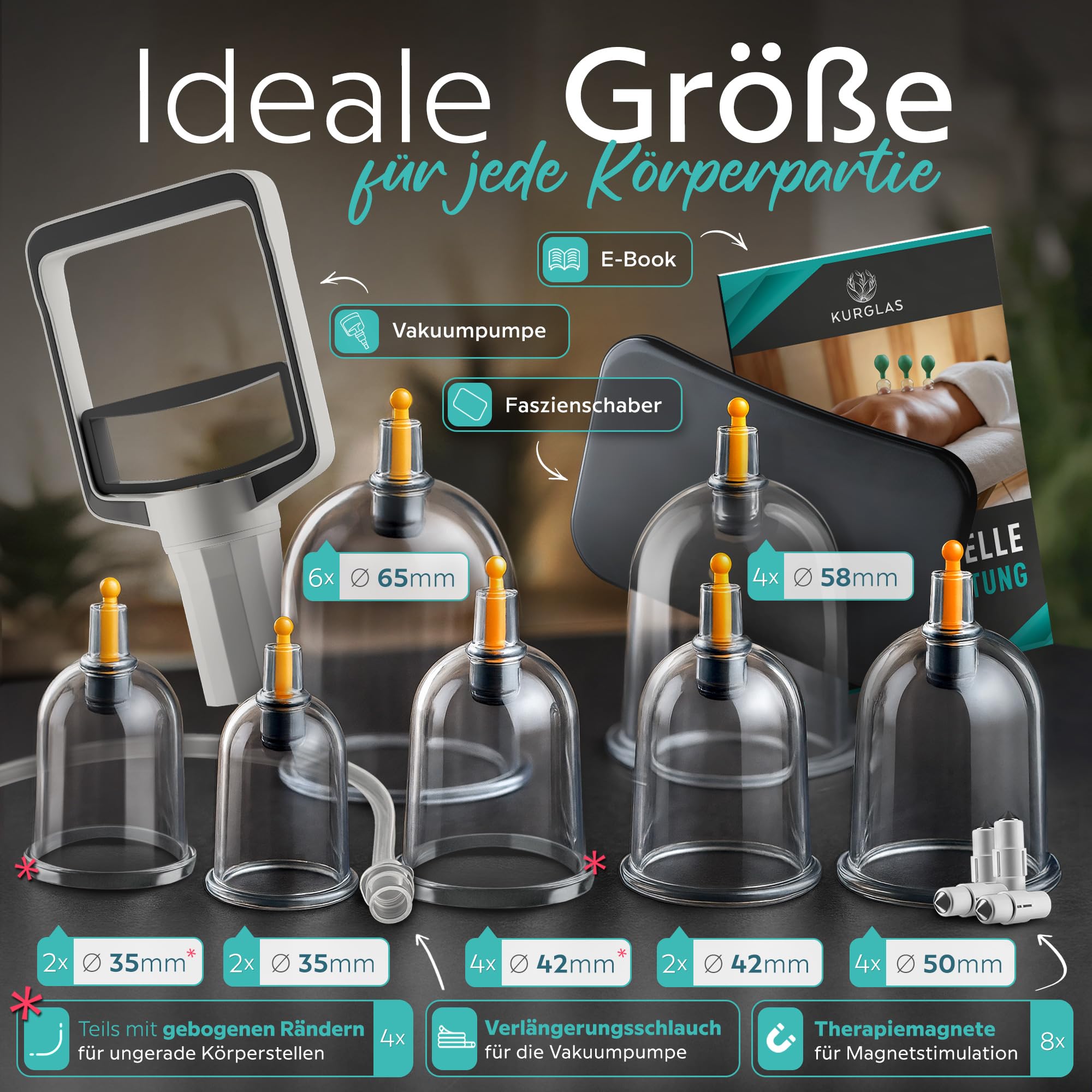 KURGLAS Schröpfgläser Set – 24-teilig mit Vakuumpumpe, Kunststoff, Therapiemagneten, Faszienschaber und e-Book, gegen Verspannungen & Cellulite