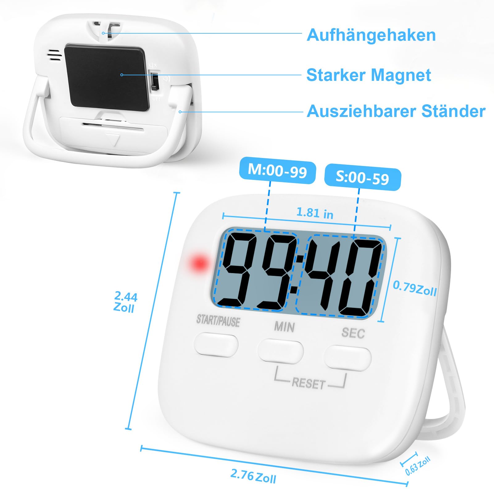 Multifunktion: Hoch und runter zählen; kann als normaler Wecker und Stoppuhr arbeiten