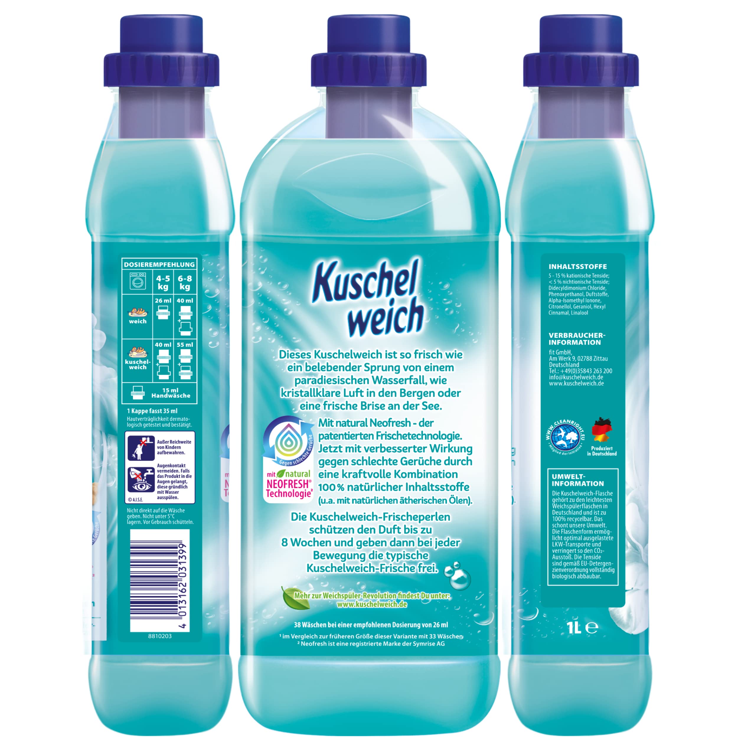 Kuschelweich Weichspüler Frischetraum, Hautverträglichkeit dermatologisch bestätigt, Weichspüler Kuschelweich ohne Mikroplastik, 1 Liter bis zu 38 Waschladungen, 1037.48 grams