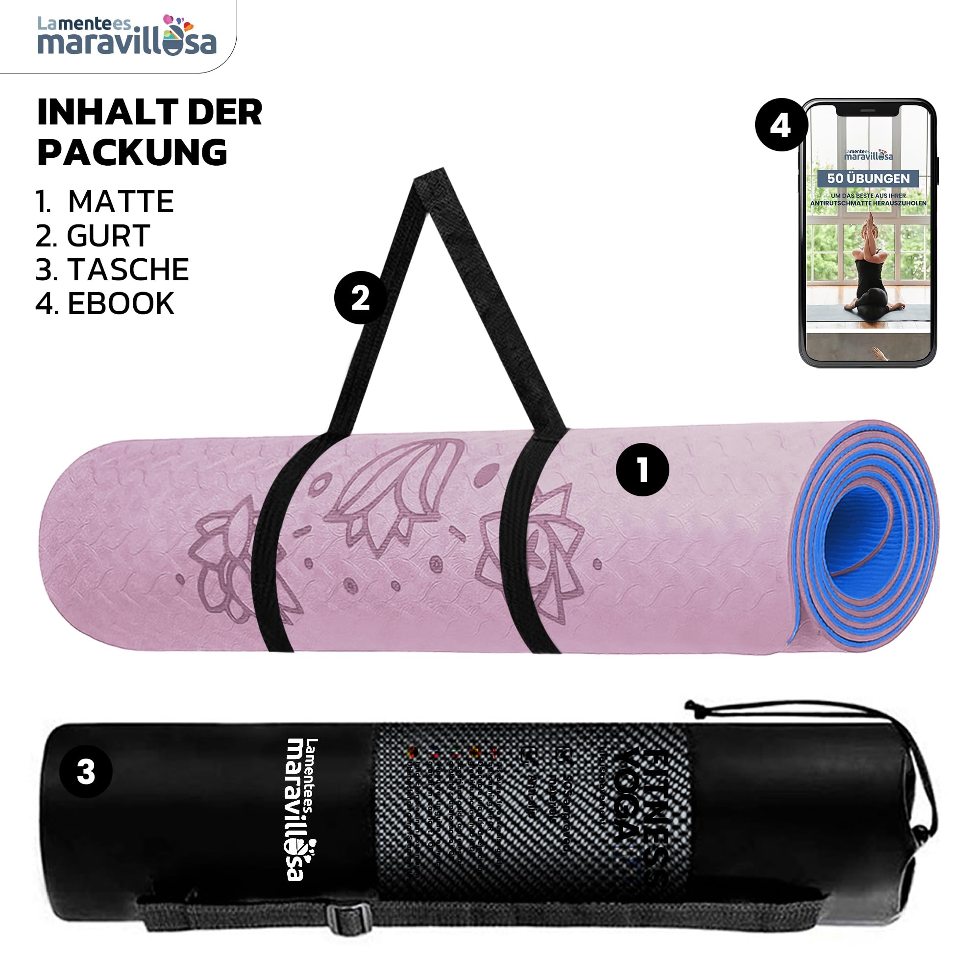 LA MENTE ES MARAVILLOSA - Gymnastikmatte Rutschfest【TPE | 183x61cm】Inkl Tragegurt + Tasche + Übungs-E-Book, Gelenkschonende Yogamatte für Fitness, Pilates | Indoor/Outdoor Geeignet
