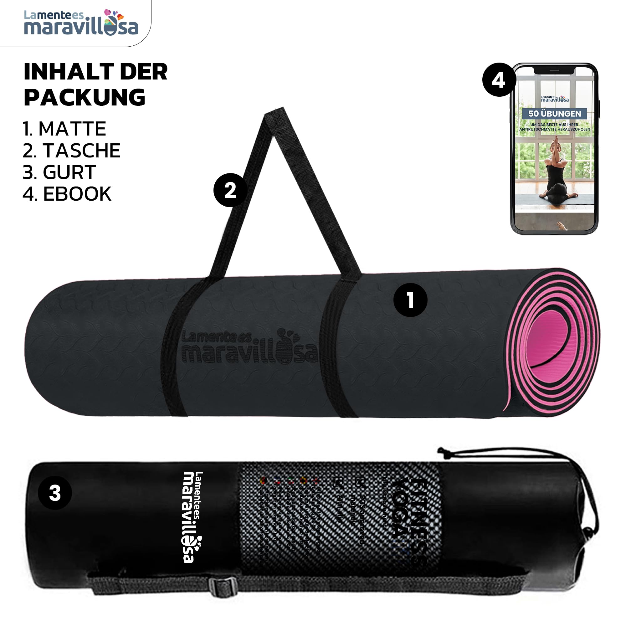 LA MENTE ES MARAVILLOSA - Gymnastikmatte Rutschfest【TPE | 183x61cm】Inkl Tragegurt + Tasche + Übungs-E-Book, Gelenkschonende Yogamatte für Fitness, Pilates | Indoor/Outdoor Geeignet