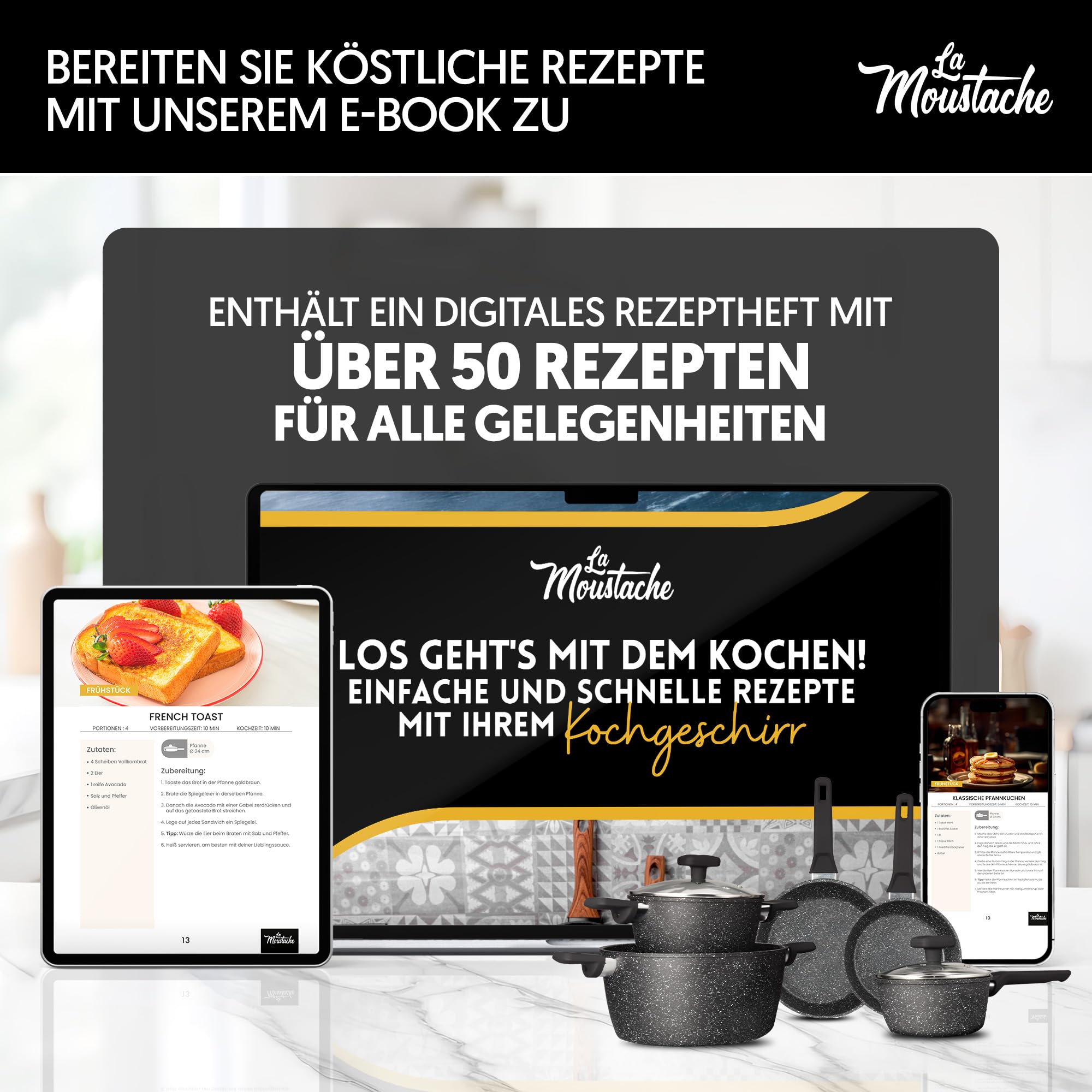 La Moustache - 8-Teiliges Kochgeschirr-Set aus Aluminium mit E-Book, Antihaftbeschichtet, 3 Töpfen, 3 Glasdeckeln und 2 Bratpfannen für Alle Herdarten Inklusive Induktion, PFOA/PFOS-Frei (Onix)