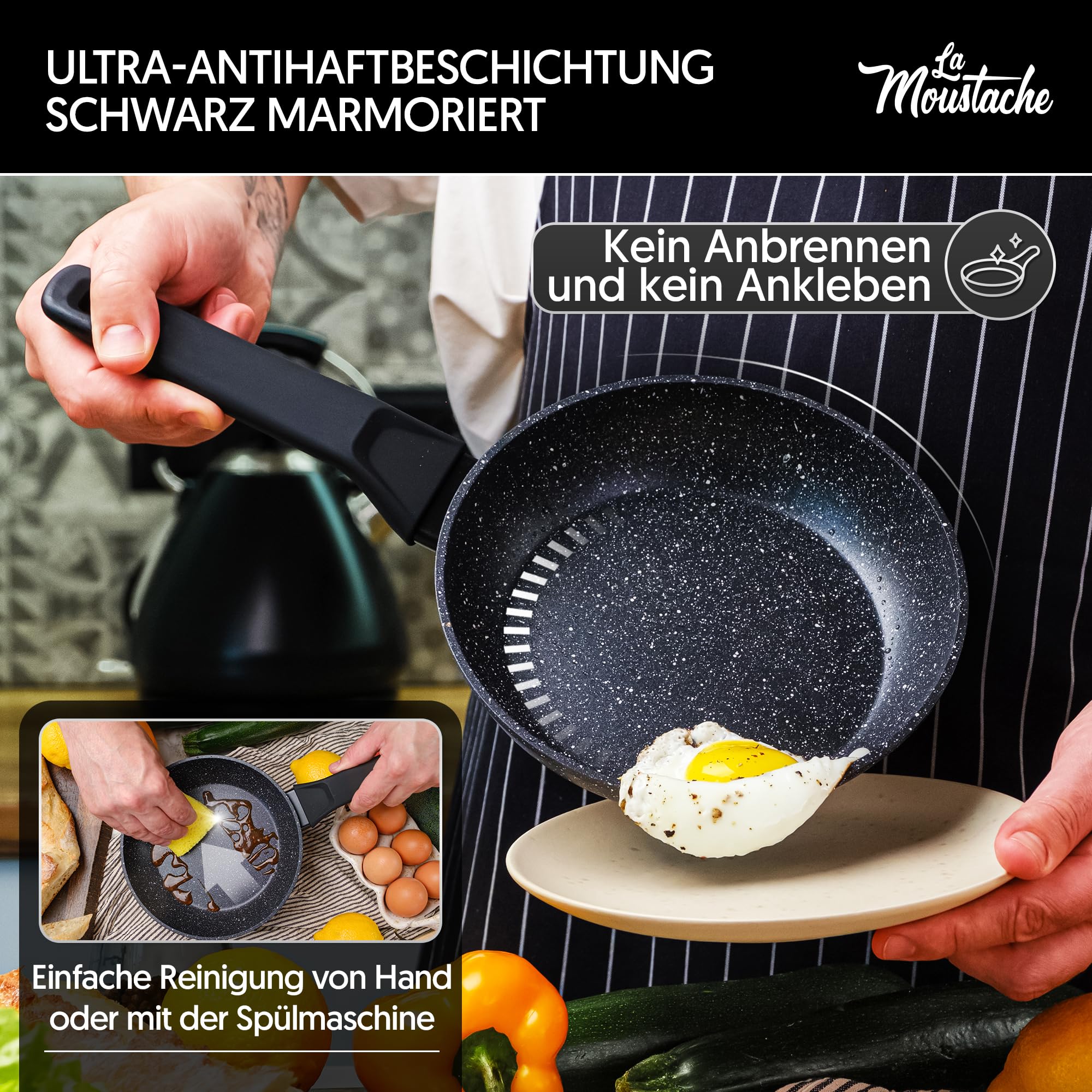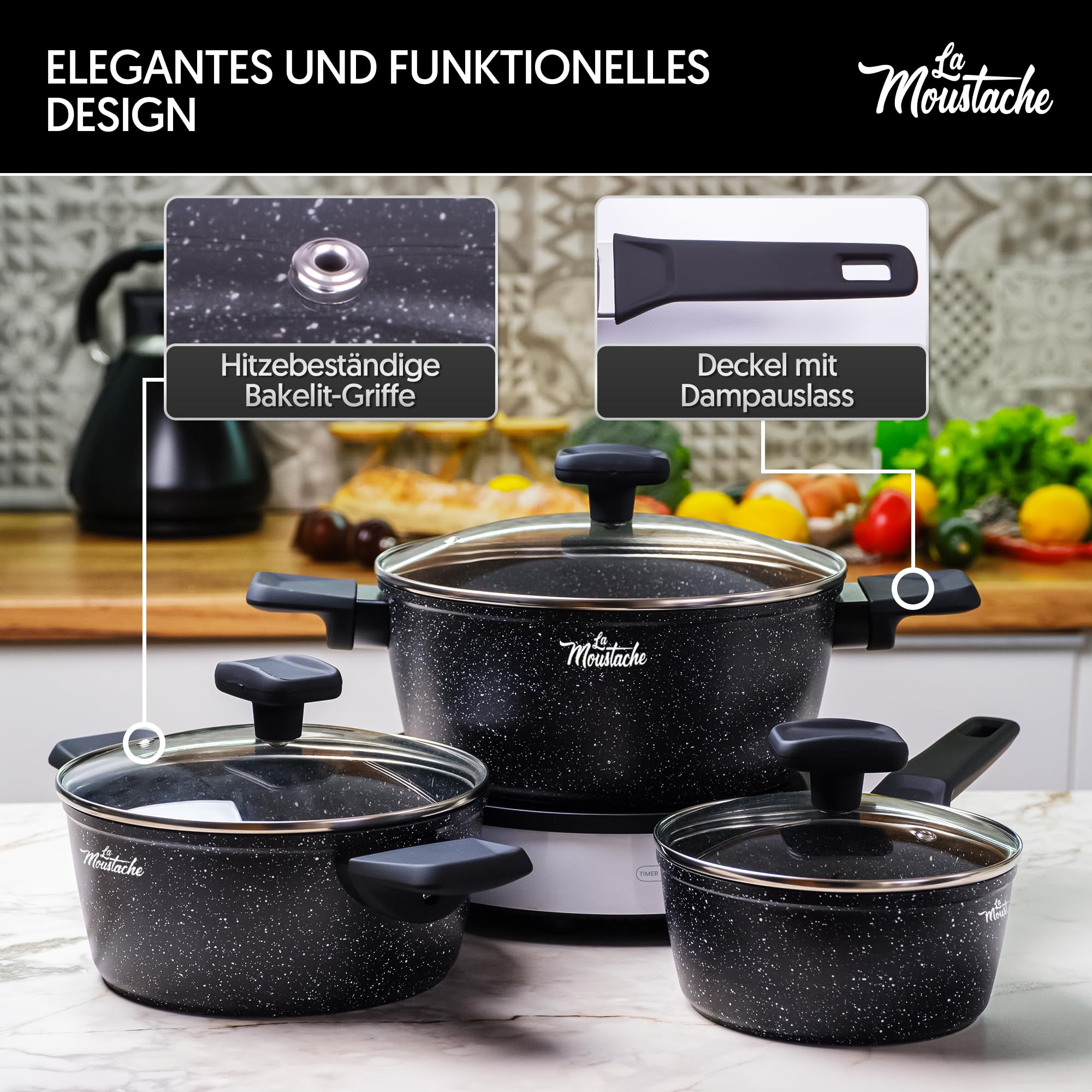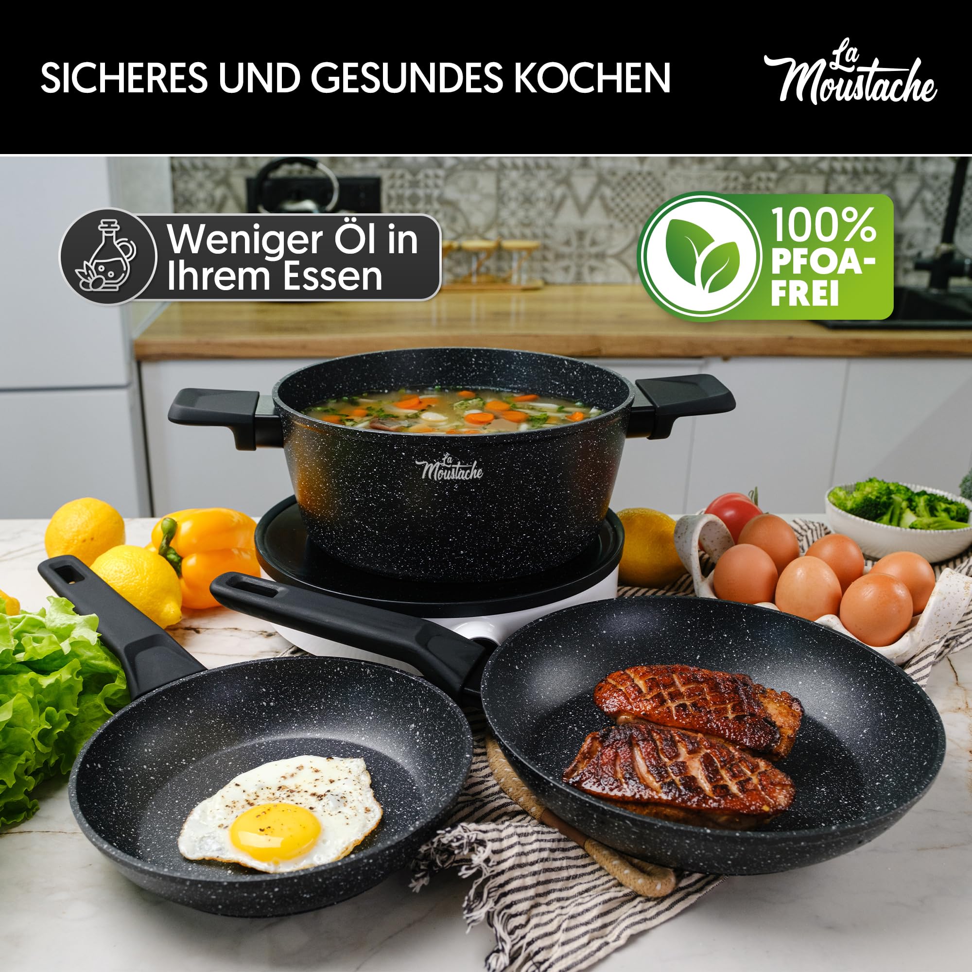 Machen Sie sich bereit, Ihre Kochkünste mit dem 8-teiligen Kochgeschirrset von La Moustache zu verbessern! Dieses Komplettset bietet alles, was Sie zum Kochen im Küchenstil benötigen: 2 Bratpfannen mit Ø 20 cm (Höhe 4,3 cm; Volumen 1 Liter) und Ø 24 cm (Höhe 4,8 cm; Volumen 1,7 Liter), 3 Töpfe mit Ø 16 cm (Höhe 7,5 cm; Volumen 1,2 Liter), Ø 20 cm (Höhe 9 cm; Volumen 2,4 Liter) und Ø 24 cm (Höhe 10,5 cm; Volumen 4,1 Liter) mit 3 Deckeln aus gehärtetem Glas. Hergestellt auf einer Aluminiumbasis ohne PFOA/PFOS/Blei/Cadmium, garantiert es eine gleichmässige Wärmeverteilung, Beständigkeit gegen hohe Temperaturen, Korrosion, Hitze und Hitze. Darüber hinaus verfügt es über eine Antihaftbeschichtung, die den Reinigungsprozess vereinfacht und Ihnen ein gesünderes Kochen mit weniger Fett ermöglicht. Jedes Stück verfügt über ausgereifte antike Bakelit-Sicherheitsgriffe, die das Greifen erleichtern und das Risiko von Schnitten verringern. Zusätzlich enthält dieses Set Deckel aus gehärtetem Glas mit Dampfauslassventilen. Mit seiner Beständigkeit gegen hohe Temperaturen, Korrosion, Hitze und Hitze ist dieses Set eine langlebige und zuverlässige Wahl für alle Kochfelder, einschliesslich Induktions-, Gas-, Elektroherd und Cerankochfeld. Mit diesem Batteriesatz können Sie alle Ihre Bedürfnisse abdecken und gleichzeitig eine unvergleichliche Küche geniessen.