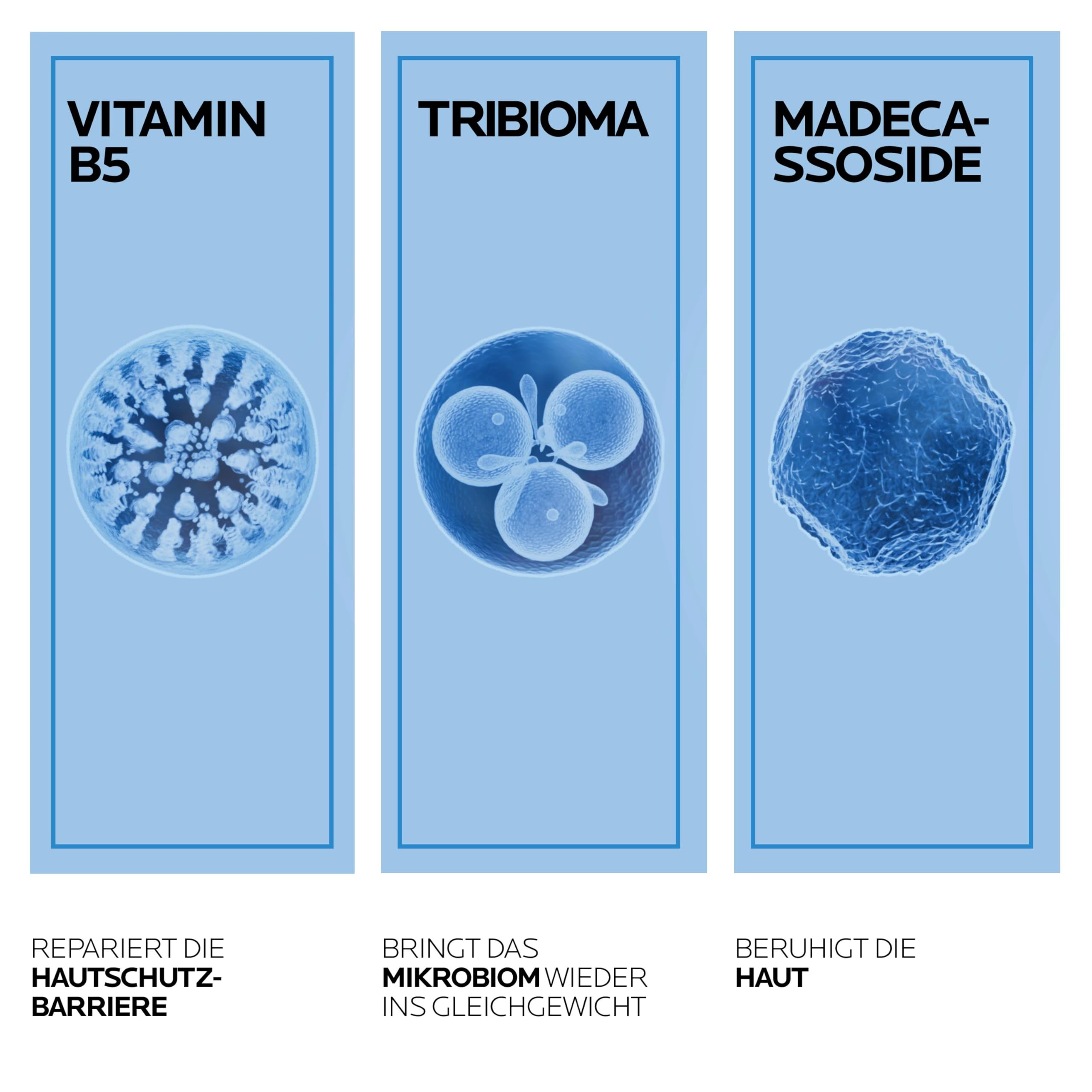 - Wirkstoffe: Panthenol (5%), Madecassoside, Procerad, Tribioma, Kupfer/Zink/Mangan