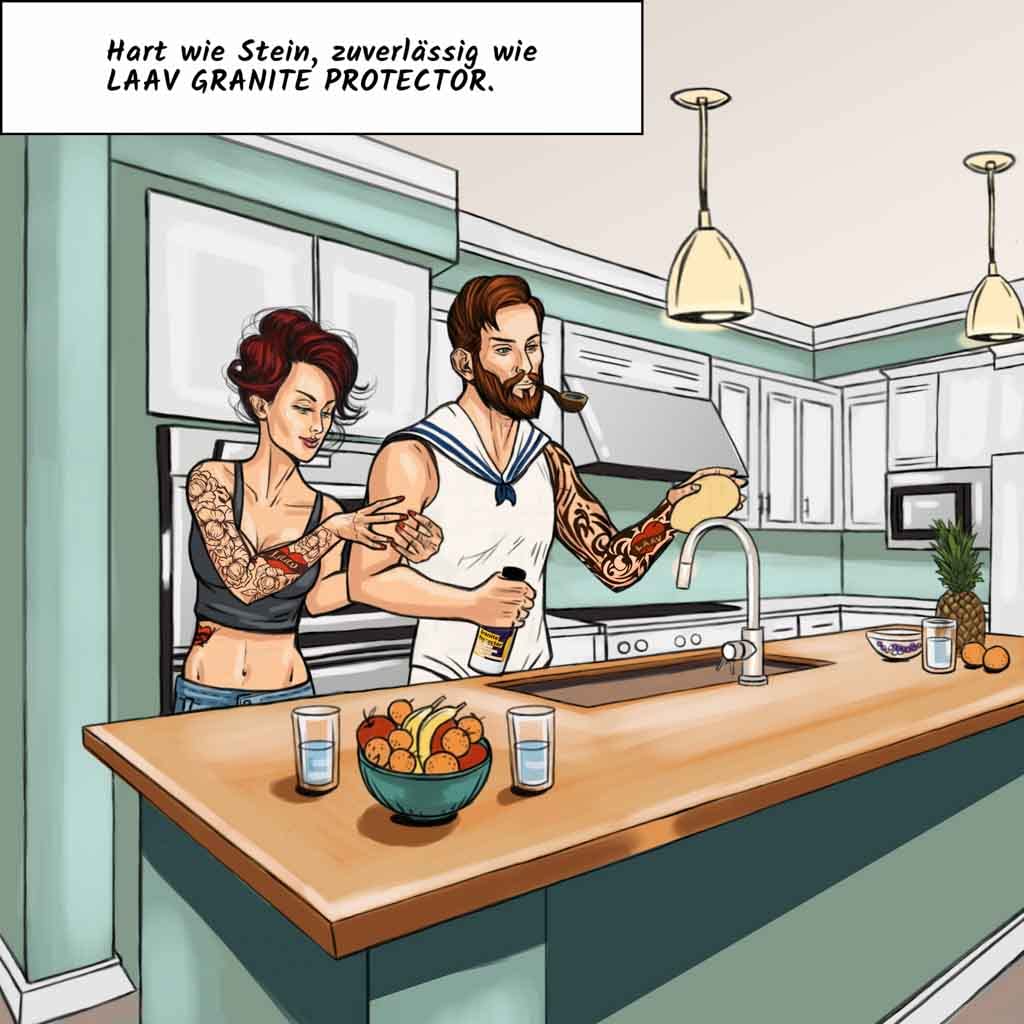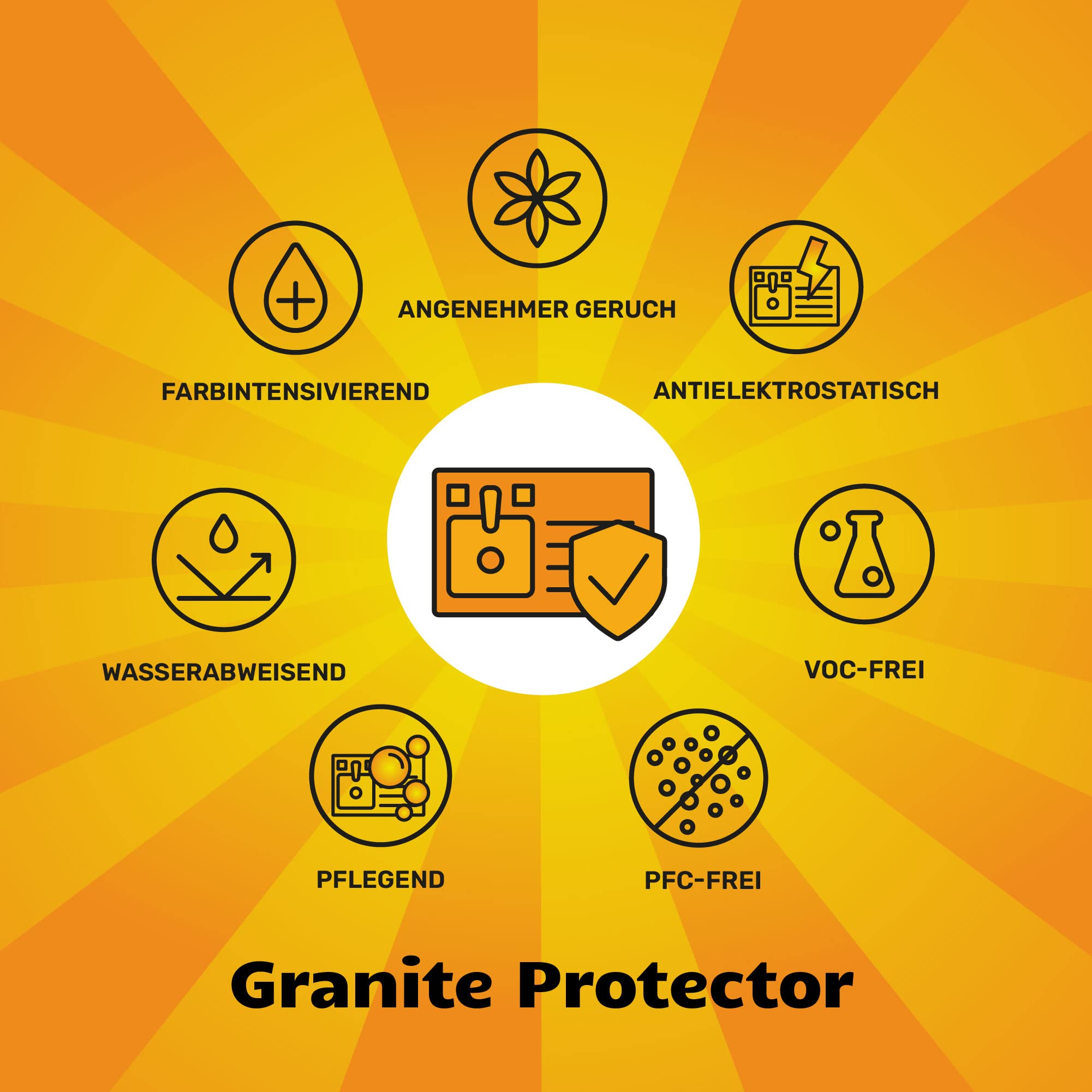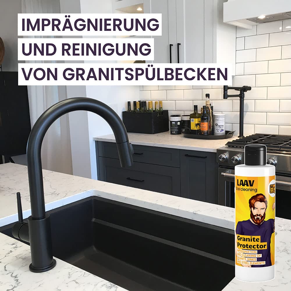 LAAV® GRANITE PROTECTOR ist ein hochprofessionelles Produkt zur Imprägnierung und Pflege von Granit- und Konglomeratspülen sowie zur Reinigung von Edelstahloberflächen. Das Produkt bildet einen unsichtbaren Film, der die Farbe hervorhebt und vor dem Verblassen schützt. All dies erleichtert die tägliche Reinigung. Wir können es zur Reinigung von Waschbecken, Arbeitsplatten aus poliertem Naturstein sowie zum Schutz und zur Reinigung von Edelstahlkomponenten wie Badezimmerarmaturen und Gaskochfeldern verwenden. Superkräfte: -bringt die Farbe zur Geltung und schützt vor dem Verblassen -verringert das Eindringen von Schmierfett -hat hydrophobe Eigenschaften, so dass Wasserablagerungen nicht auf der Oberfläche trocknen -entfernt Kalkablagerungen und andere Ablagerungen von verchromten Teilen -entfernt Kalk und andere Ablagerungen von verchromten Teilen -enthält Inhaltsstoffe pflanzlichen Ursprungs -antistatische Komponenten verhindern die Ablagerung von Staub -enthält keine schädlichen PFC-Verbindungen -hinterlässt einen frischen und angenehmen Duft Anwendung: Mit einem trockenen Mikrofasertuch auf eine getrocknete Oberfläche auftragen, einige Minuten chillen lassen und dann polieren. Das Produkt ist nach 12 Stunden vollständig aktiviert. Wenn die Oberflächen mit Lebensmitteln in Berührung kommen, spülen Sie sie 12 Stunden nach der Anwendung mit Wasser ab. Keine Probleme: Testen Sie das Produkt vor dem Auftragen an einer kleinen, unsichtbaren Stelle. Nicht auf Fussböden verwenden. Profi-Tipp: Sie können die Oberfläche von Geräten auch bei INOX-Oberflächen abwischen, dann verschwinden Fingerabdrücke.
