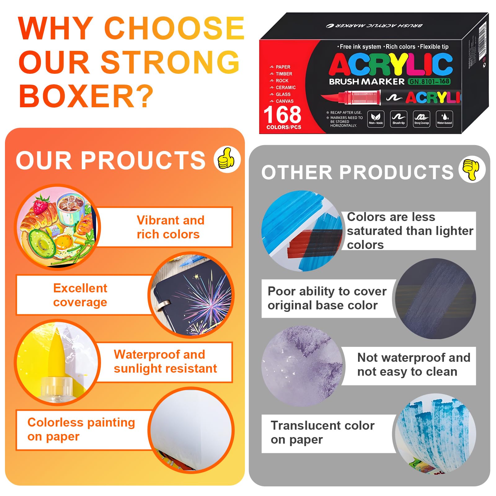 • 【Design-Merkmale】 Die ausziehbare Box erleichtert die Farbauswahl und die Entnahme der Acrylstifte. Der transparente Korpus zeigt an, wie viel Tinte sich im Stift befindet.Warme Tipps: Schütteln Sie den Acrylstift vor dem Gebrauch mit aufgesetzter Kappe, damit das Bild glatter und die Farbe gleichmässiger wird!