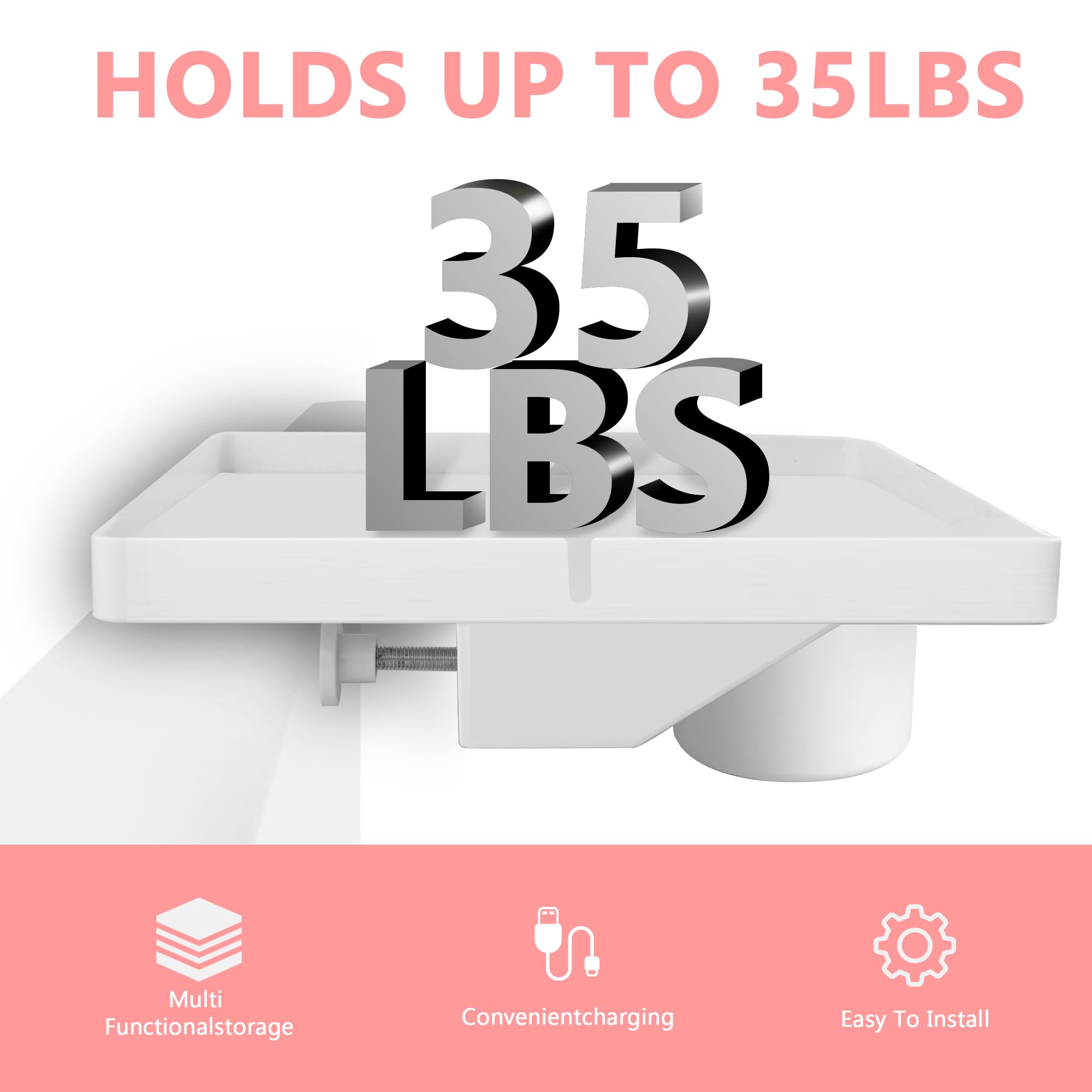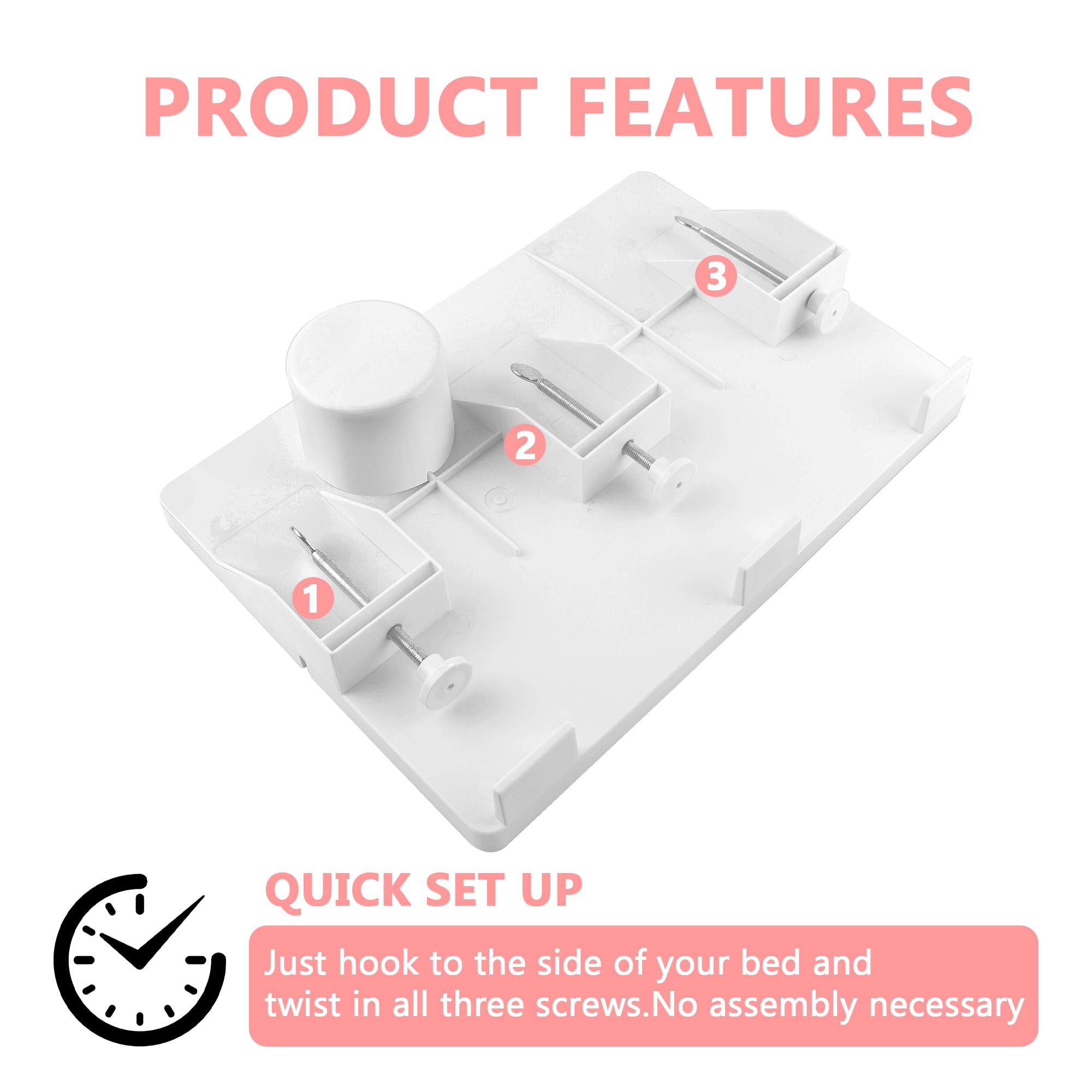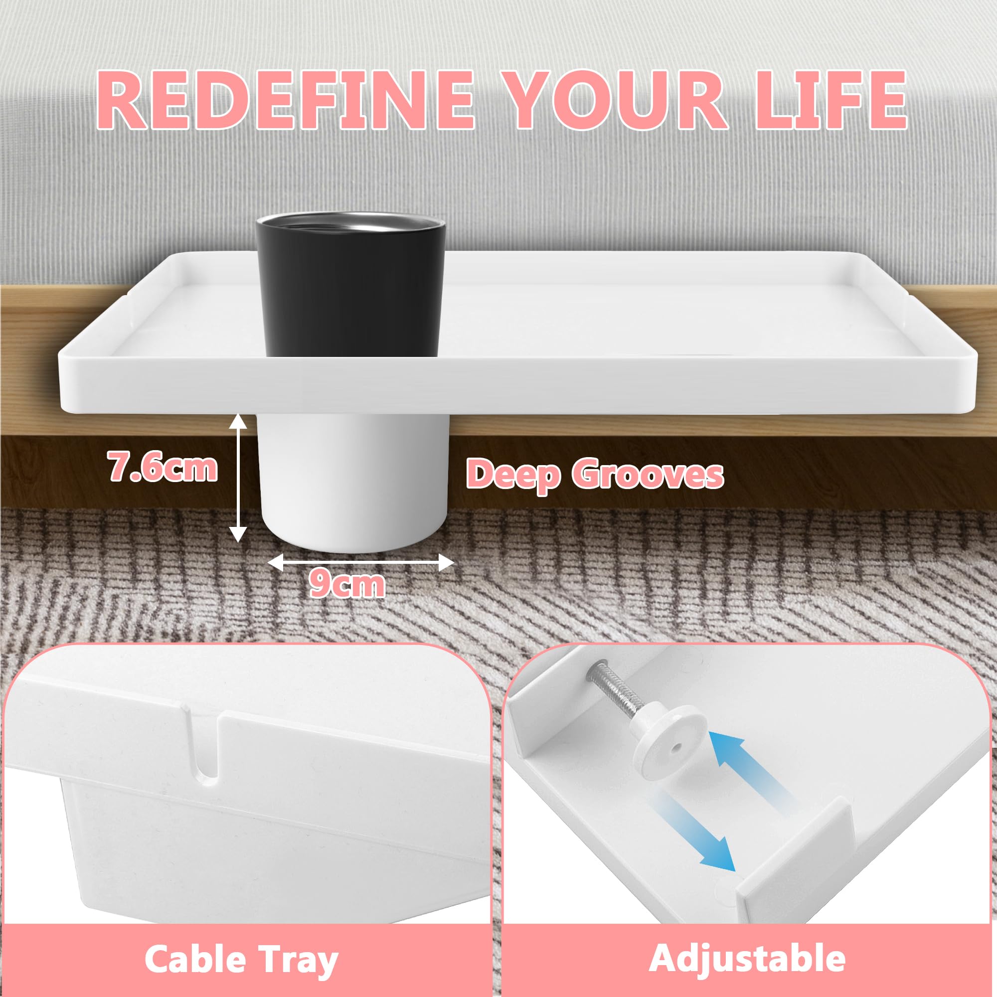 Lacusmall Nachttischregal Regal, Tablett Nachttisch Regal Bettablage zum Einhängen für Bett mit Kabelführung, Clip-On-Nachttisch, Tablett-Organizer ca.: 43 * 30cm, Weiss