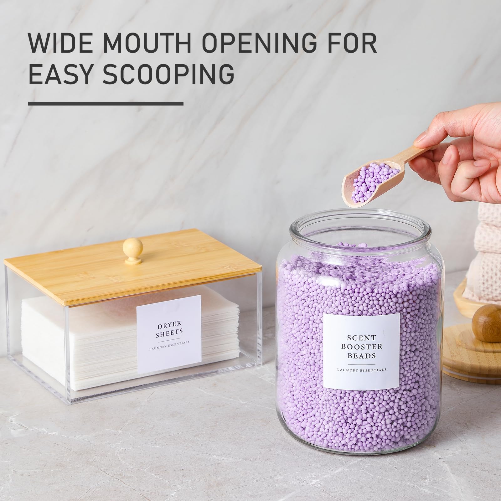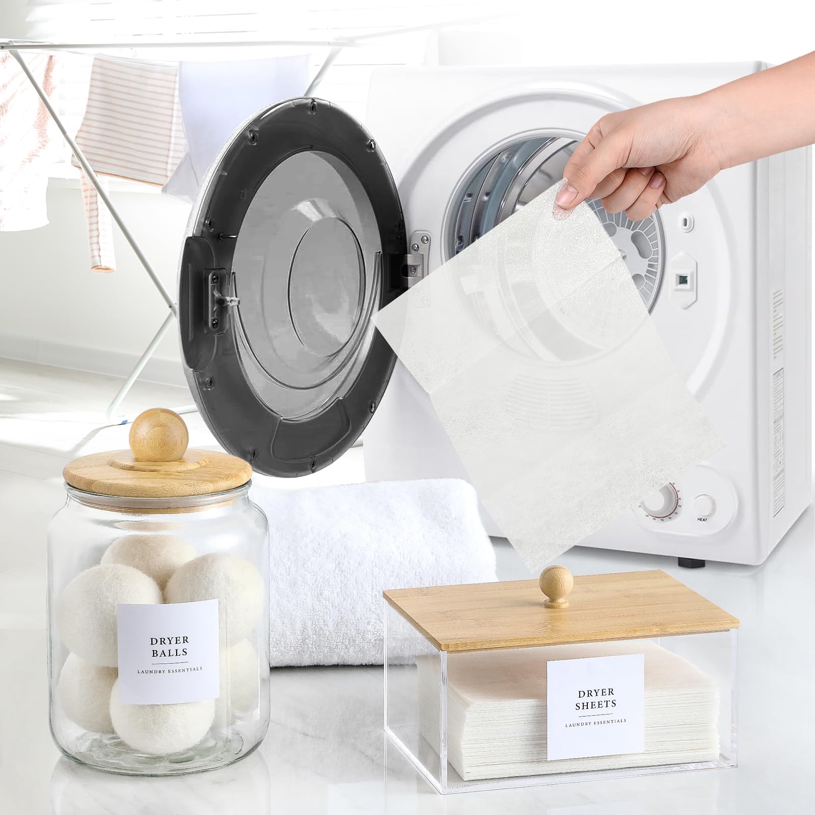 Glasbehälter und Trocknerblatthalter mit Bambusdeckel, Spender-Set und Etiketten, Behälter für die Organisation und Aufbewahrung von Waschküchen, luftdichte Gläser, Acryl-Aufbewahrungsbox für