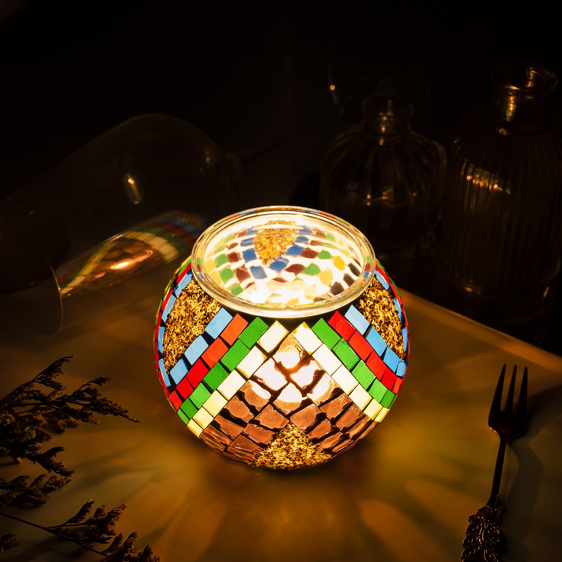 Zünden Sie morgens eine Duftkerze an und stellen Sie sie in den Teelichthalter, zusammen mit ein wenig Weihrauch und Licht, um zu meditieren und in Ihre eigene Welt einzutauchen.Nachts enthüllt das bunte Glas im Kerzenlicht verschiedene Lichter und geometrische Formen, die den Blickwinkel verändern und eine andere Landschaft offenbaren, wie ein Traum aus Neonlicht, der Ihnen jede schlaflose Nacht verschönert.Es kann Ihrer Hochzeit, Party oder Ihrem Geburtstagstisch Eleganz und Romantik verleihen. Eine perfekte Szene für einen perfekten Tag!Wenn Sie noch nicht wissen, was Sie Ihrem Freund schenken sollen, zögern Sie nicht, denn diese langlebigen, charmanten und preisgünstigen Kerzenhalter sind Ihre beste Wahl.