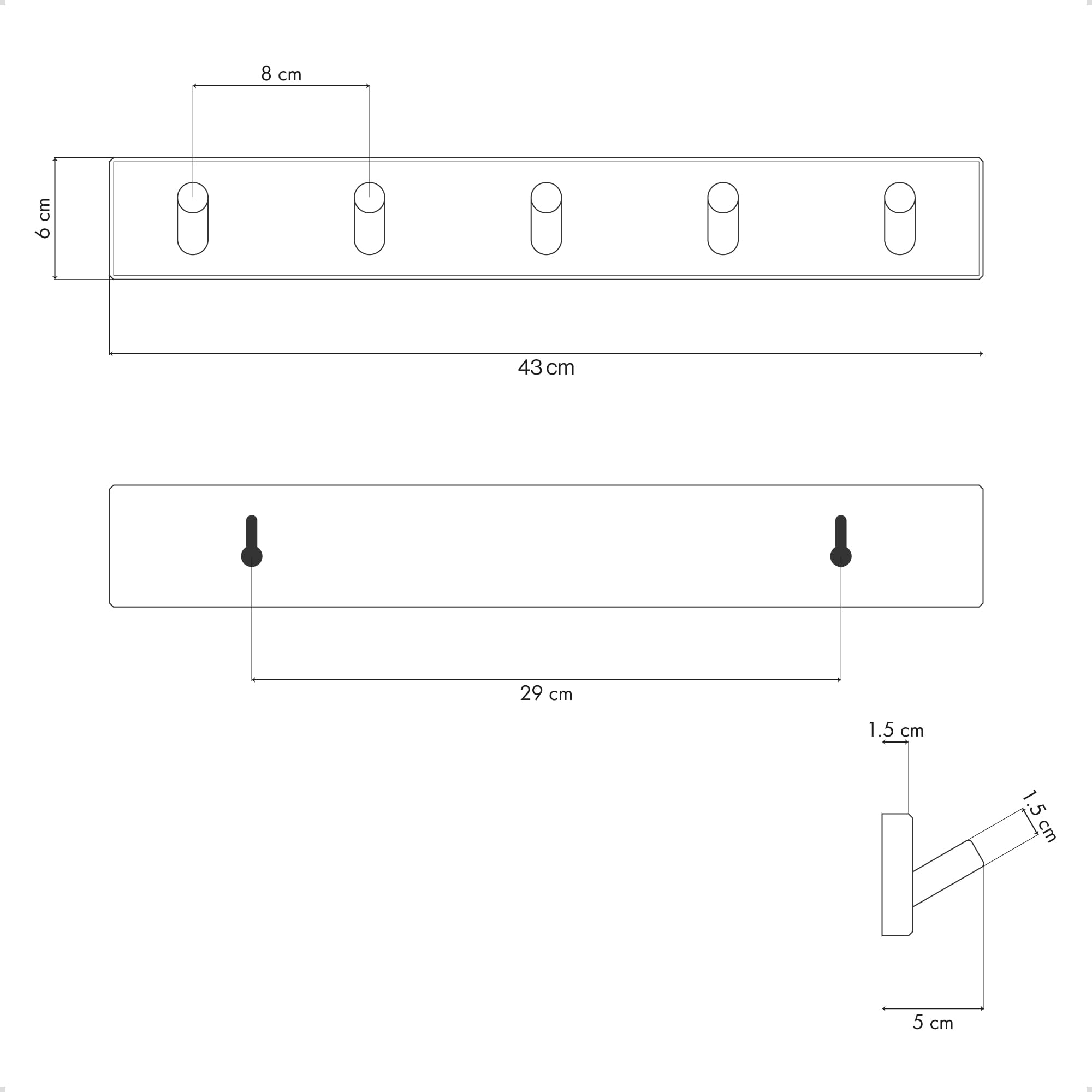 LARHN Garderobenhaken Holz (2 Stück) - Garderobenleiste Holz mit 5 Haken - 43 cm - Kleiderhaken Wand - Wandgarderobe für Flure, Garderoben, Schlafzimmer und Badezimmer