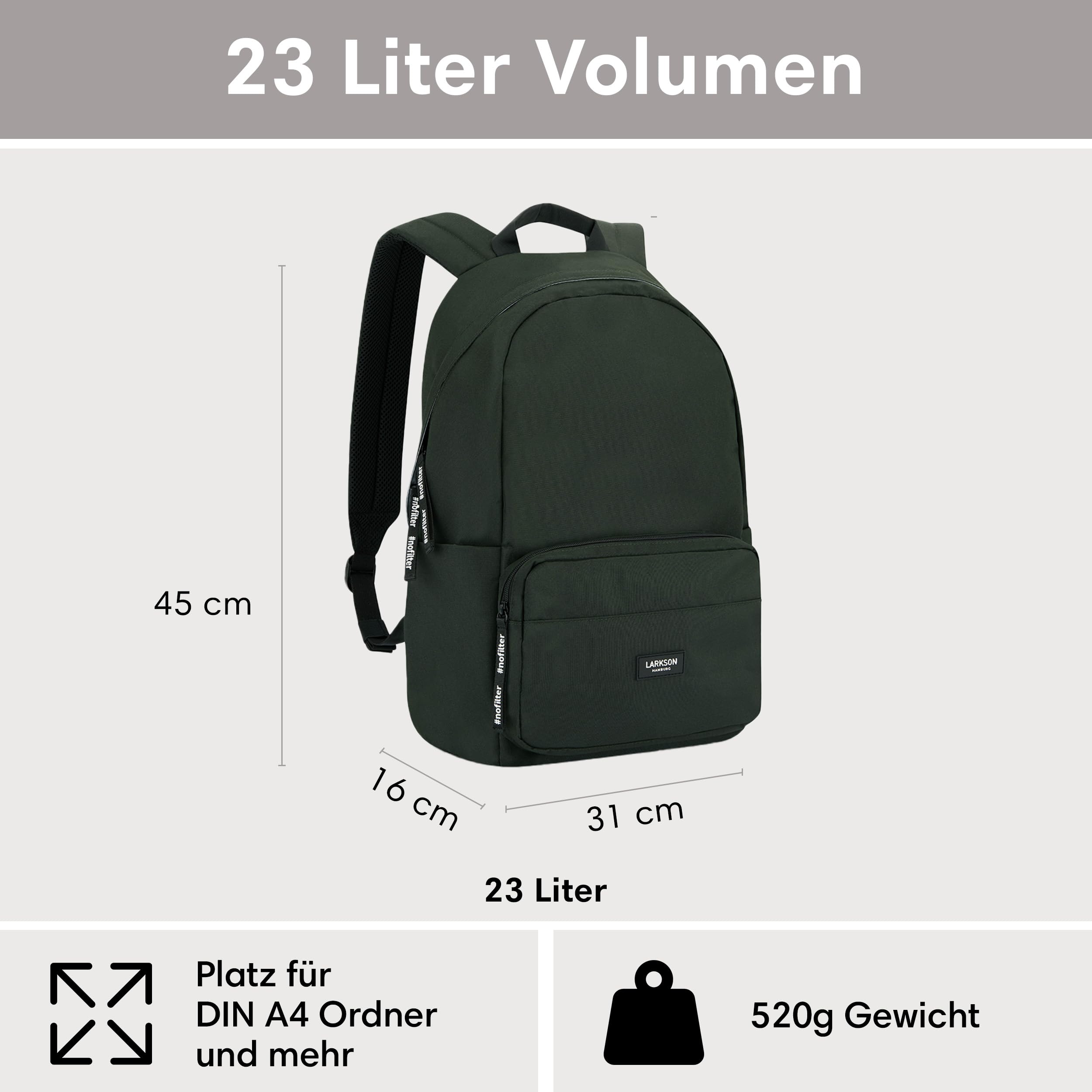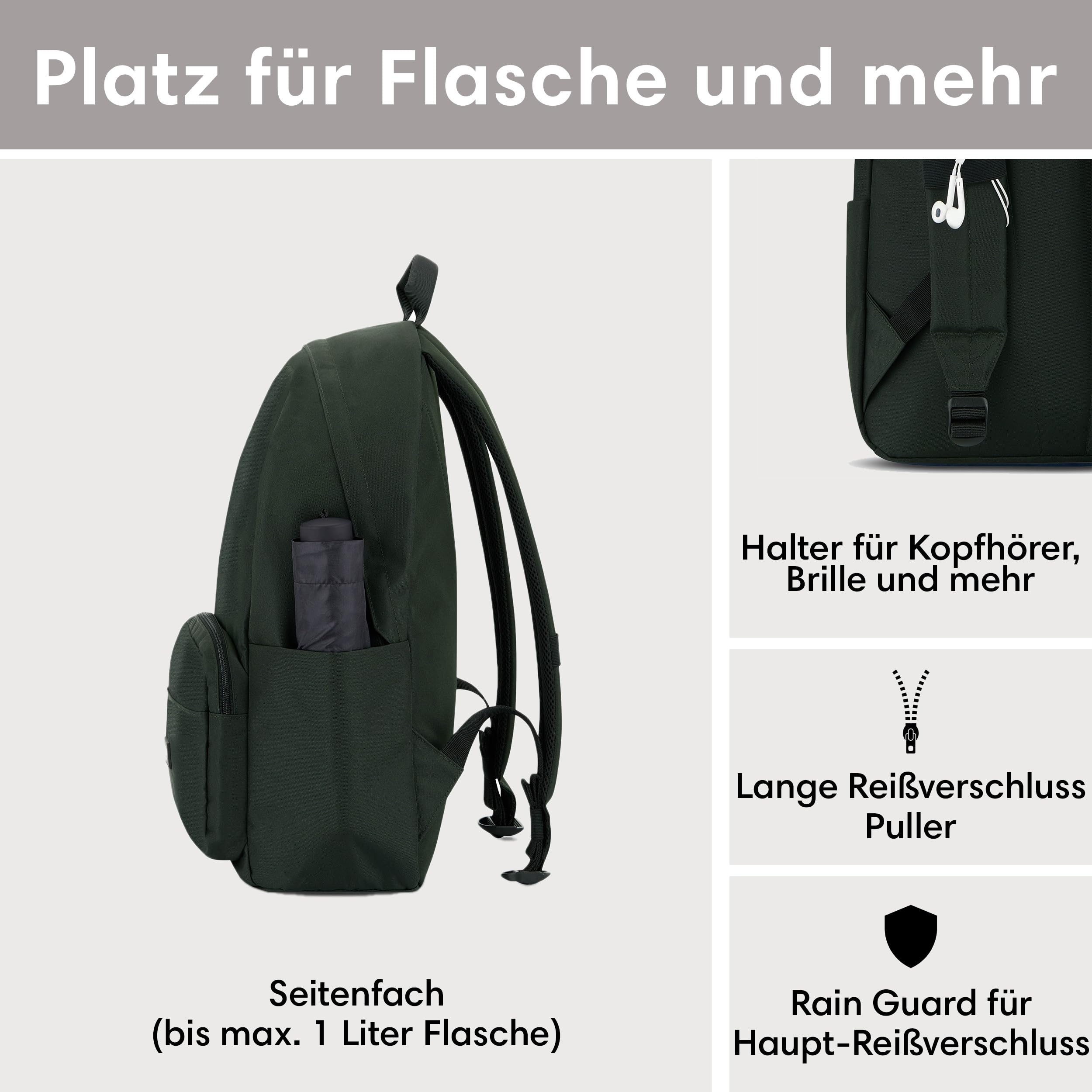 LARKSON Schulrucksack Mädchen & Jungen Teenager Dunkelgrün - No 3 - Rucksack Damen & Herren für Schule - 16" Laptopfach - Aus Recyceltem PET - Wasserabweisend