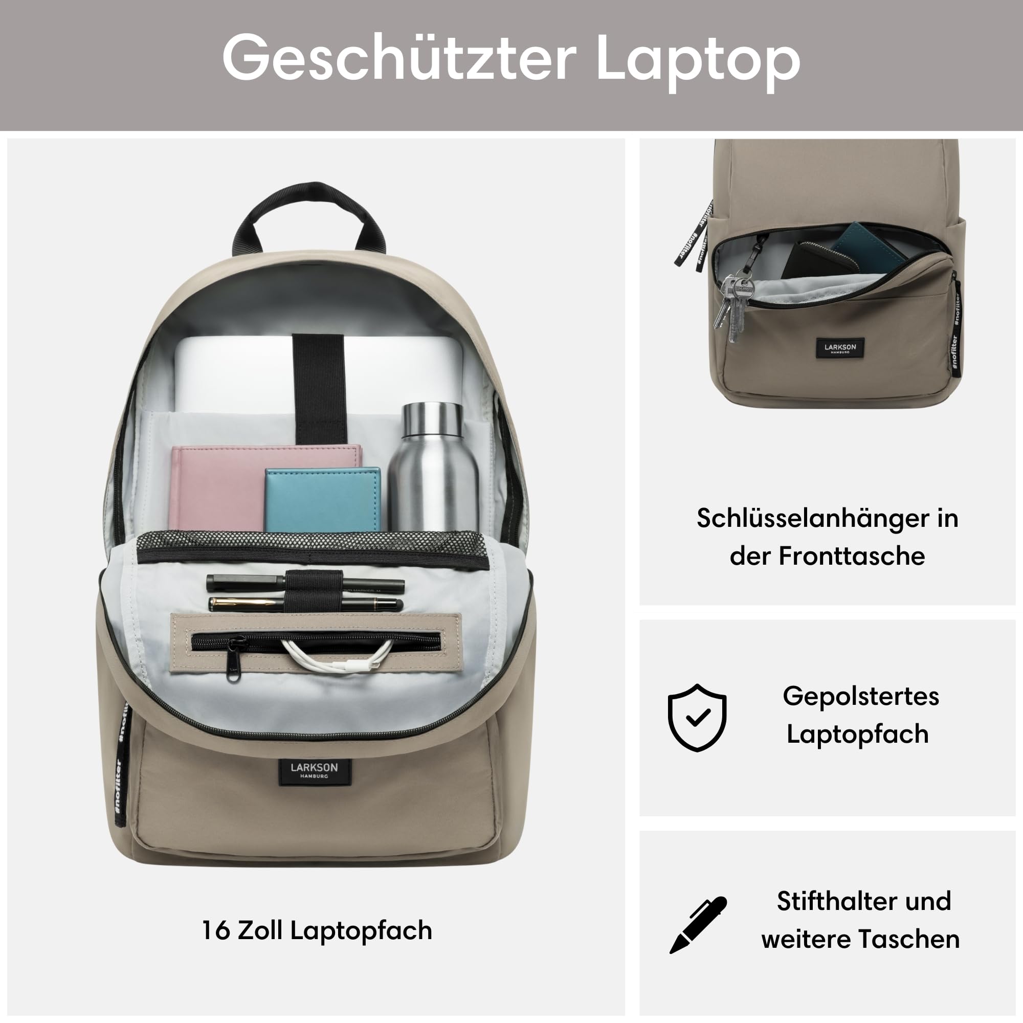 Moderner LARKSON Rucksack für die Schule, Uni und FreizeitDer LARKSON Tagesrucksack ist mit seinem modernen Look und angesagtem Printdesign ein idealer Begleiter für Mädchen und Jungen.Im grossen Hauptfach des Rucksacks befindet sich ein gepolstertes Laptopfach für Geräte bis 16 Zoll und zwei Fächer für Kleinigkeiten. An den Aussenseiten sind Einsteckfächer für eine Trinkflasche, Regenschirm etc. vorhanden. Zusätzlich gibt es noch ein Reissverschlussfach mit Schlüsselbefestigungshaken auf der Vorderseite. Die Träger sind weich gepolstert und haben an einer Seite ein Gummiband zur Befestigung von Kopfhörern oder Sonnenbrille. Der Aussenstoff sowie das Innenfutter des LARKSON Rucksacks bestehen aus Polyester, das aus recycelten PET-Flaschen hergestellt wurde. Eine TPE-Beschichtung auf der Rückseite des Aussenstoffs sorgt für zusätzliche Stabilität. Zum Imprägnieren wird ein PFC-freies Mittel genutzt, damit keine Schadstoffe in die Umwelt gelangen.HighlightsModernes & praktisches Design