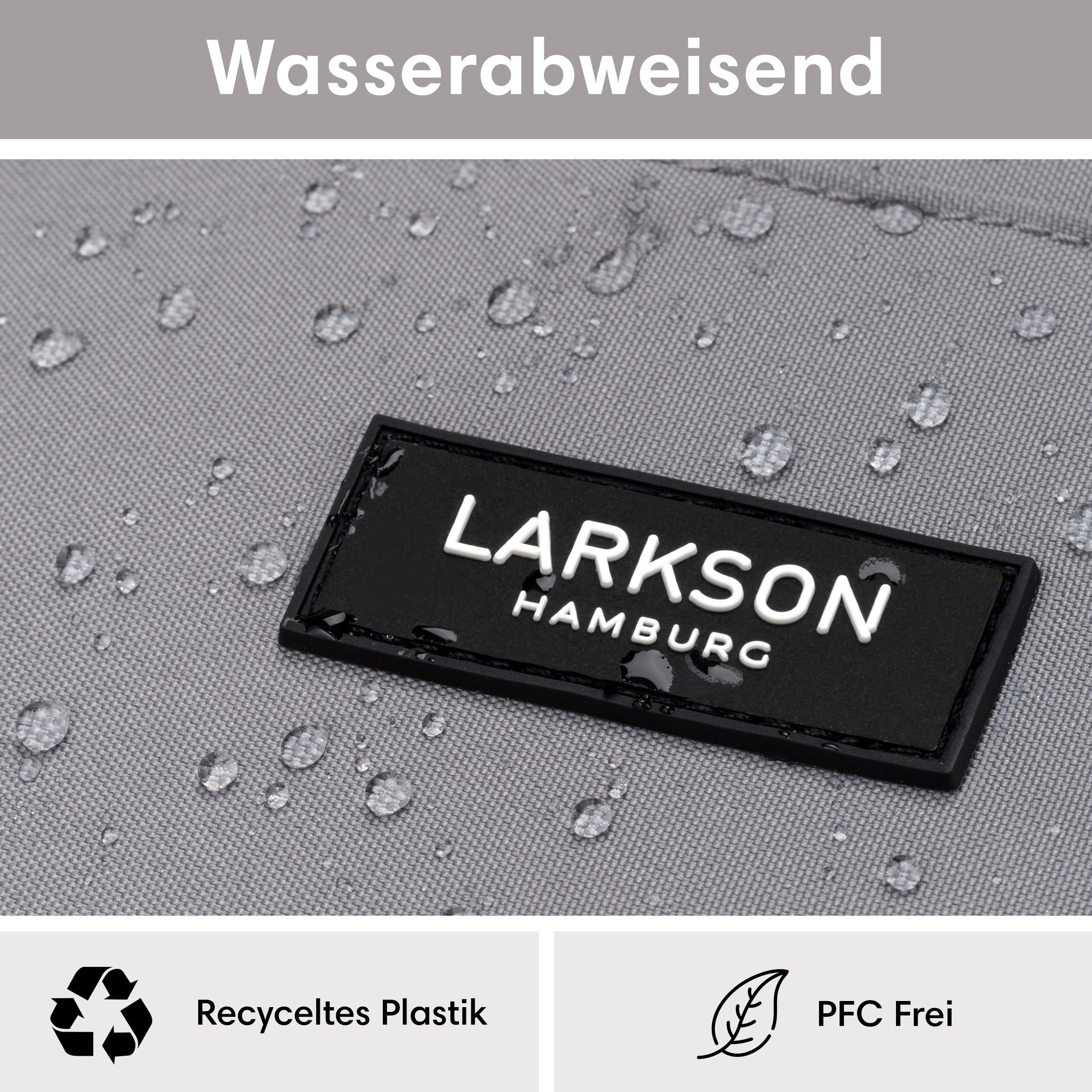 Moderner LARKSON Rucksack für die Schule, Uni und FreizeitDer LARKSON Tagesrucksack ist mit seinem modernen Look und angesagtem Printdesign ein idealer Begleiter für Mädchen und Jungen.Im grossen Hauptfach des Rucksacks befindet sich ein gepolstertes Laptopfach für Geräte bis 16 Zoll und zwei Fächer für Kleinigkeiten. An den Aussenseiten sind Einsteckfächer für eine Trinkflasche, Regenschirm etc. vorhanden. Zusätzlich gibt es noch ein Reissverschlussfach mit Schlüsselbefestigungshaken auf der Vorderseite. Die Träger sind weich gepolstert und haben an einer Seite ein Gummiband zur Befestigung von Kopfhörern oder Sonnenbrille. Der Aussenstoff sowie das Innenfutter des LARKSON Rucksacks bestehen aus Polyester, das aus recycelten PET-Flaschen hergestellt wurde. Eine TPE-Beschichtung auf der Rückseite des Aussenstoffs sorgt für zusätzliche Stabilität. Zum Imprägnieren wird ein PFC-freies Mittel genutzt, damit keine Schadstoffe in die Umwelt gelangen.HighlightsModernes & praktisches Design