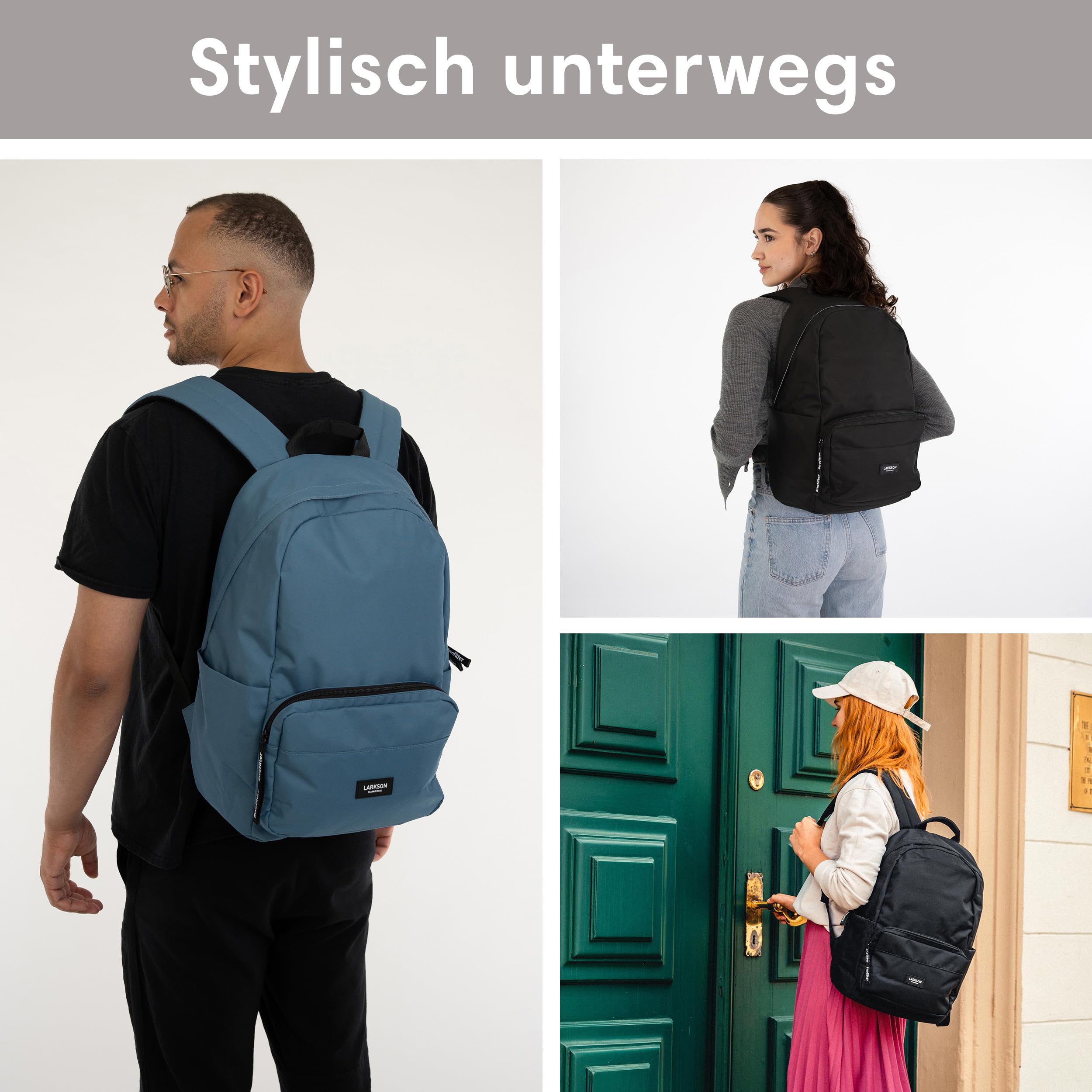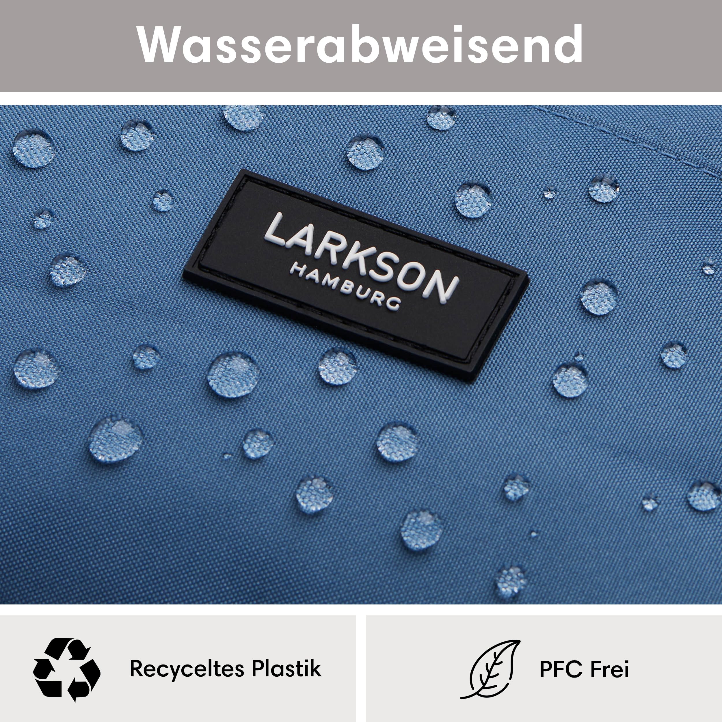 Moderner LARKSON Rucksack für die Schule, Uni und FreizeitDer LARKSON Tagesrucksack ist mit seinem modernen Look und angesagtem Printdesign ein idealer Begleiter für Mädchen und Jungen.Im grossen Hauptfach des Rucksacks befindet sich ein gepolstertes Laptopfach für Geräte bis 16 Zoll und zwei Fächer für Kleinigkeiten. An den Aussenseiten sind Einsteckfächer für eine Trinkflasche, Regenschirm etc. vorhanden. Zusätzlich gibt es noch ein Reissverschlussfach mit Schlüsselbefestigungshaken auf der Vorderseite. Die Träger sind weich gepolstert und haben an einer Seite ein Gummiband zur Befestigung von Kopfhörern oder Sonnenbrille. Der Aussenstoff sowie das Innenfutter des LARKSON Rucksacks bestehen aus Polyester, das aus recycelten PET-Flaschen hergestellt wurde. Eine TPE-Beschichtung auf der Rückseite des Aussenstoffs sorgt für zusätzliche Stabilität. Zum Imprägnieren wird ein PFC-freies Mittel genutzt, damit keine Schadstoffe in die Umwelt gelangen.HighlightsModernes & praktisches Design