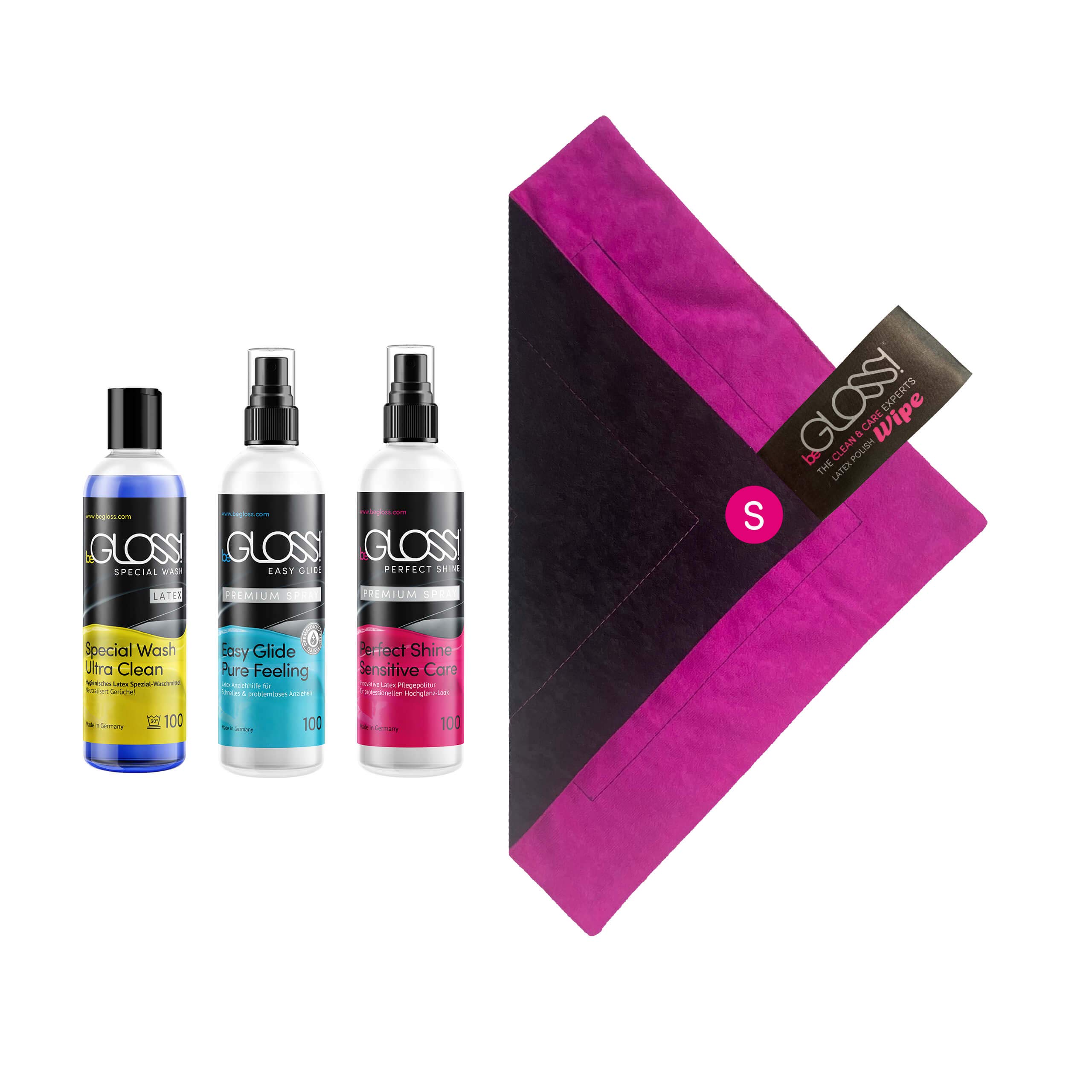 beGLOSS PERFECT SHINE PREMIUM SPRAY 100 ML - Perfect Shine & Sensitive Care + Latex Polier Tuch Wipe Small + Special WASH LATEX + Latexanziehhilfe EASY GLIDE PREMIUM SPRAY