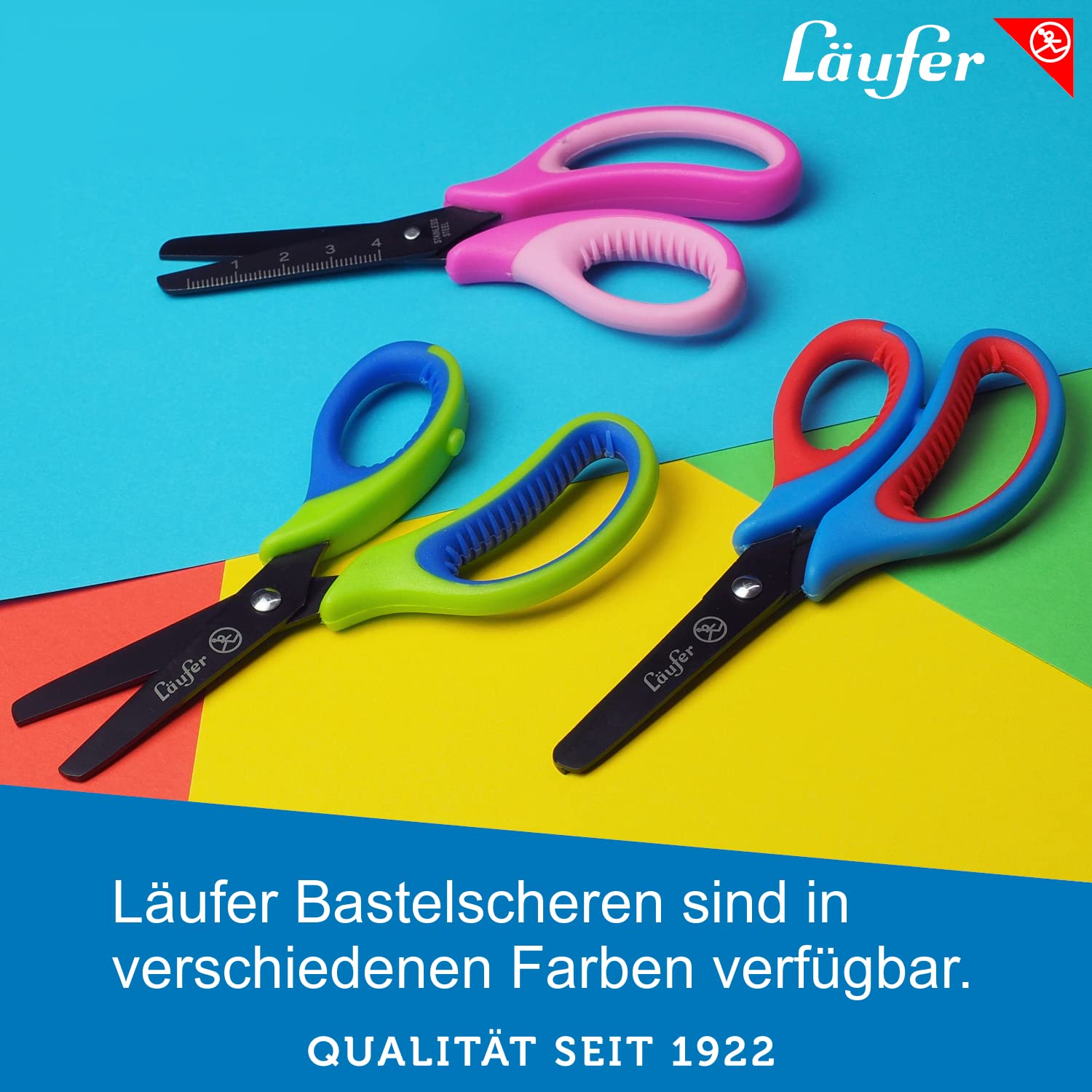 Die hochwertige Läufer Bastelschere hat eine weiche comfort Griffzone. Sie liegt angenehm in der Hand. Die Griffform ermöglicht verschiedene ergonomische Griffhaltungen. Die rostfreien Klingen sind von höchster Qualität. Abgerundete Spitzen bieten mehr Sicherheit. Klingen mit Titanbeschichtung für eine hohe Schneidleistung bei geringem Kraftaufwand. 13 cm lange Schulschere mit ca. 5 cm langer Klinge. Der rostfreie Stahl und die Titanbeschichtung sorgen für eine lange Haltbarkeit. Die cm-Rasterung auf der Klinge unterstützt beim Basteln.