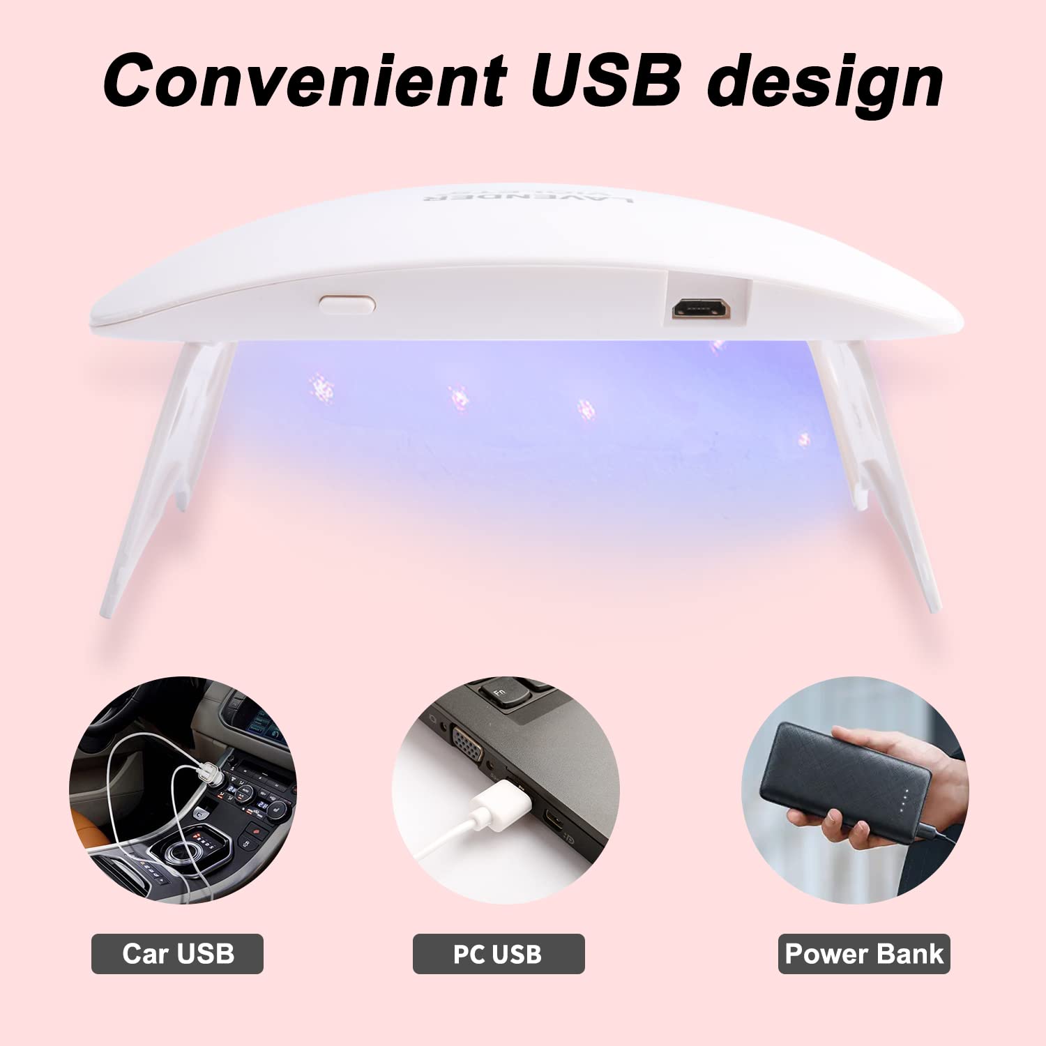 • Praktische LED Nagellampe mit USB Die faltbare UV LED Lampe mit 6 LEDs haertet beide Haende gleichzeitig aus. 60 Sekunden per Tastendruck oder 120 Sekunden per langem Druecken. USB Anschluss geeignet fuer Laptop, Powerbank oder Netzadapter.