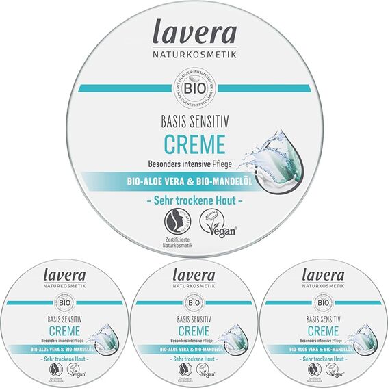 lavera Basis Sensitiv Allzweckcreme 4er Pack (4 x 150ml) – Intensive Pflege mit Bio-Aloe Vera & Mandelöl – Reichhaltige Feuchtigkeitscreme für Gesicht & Körper – Vegan