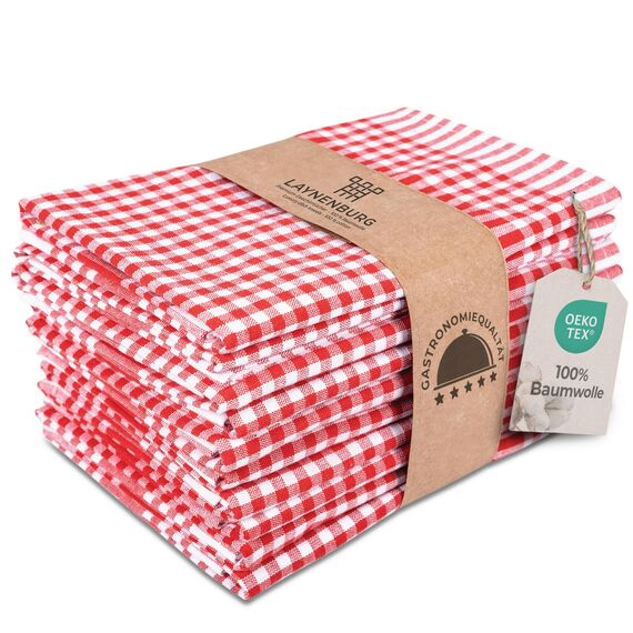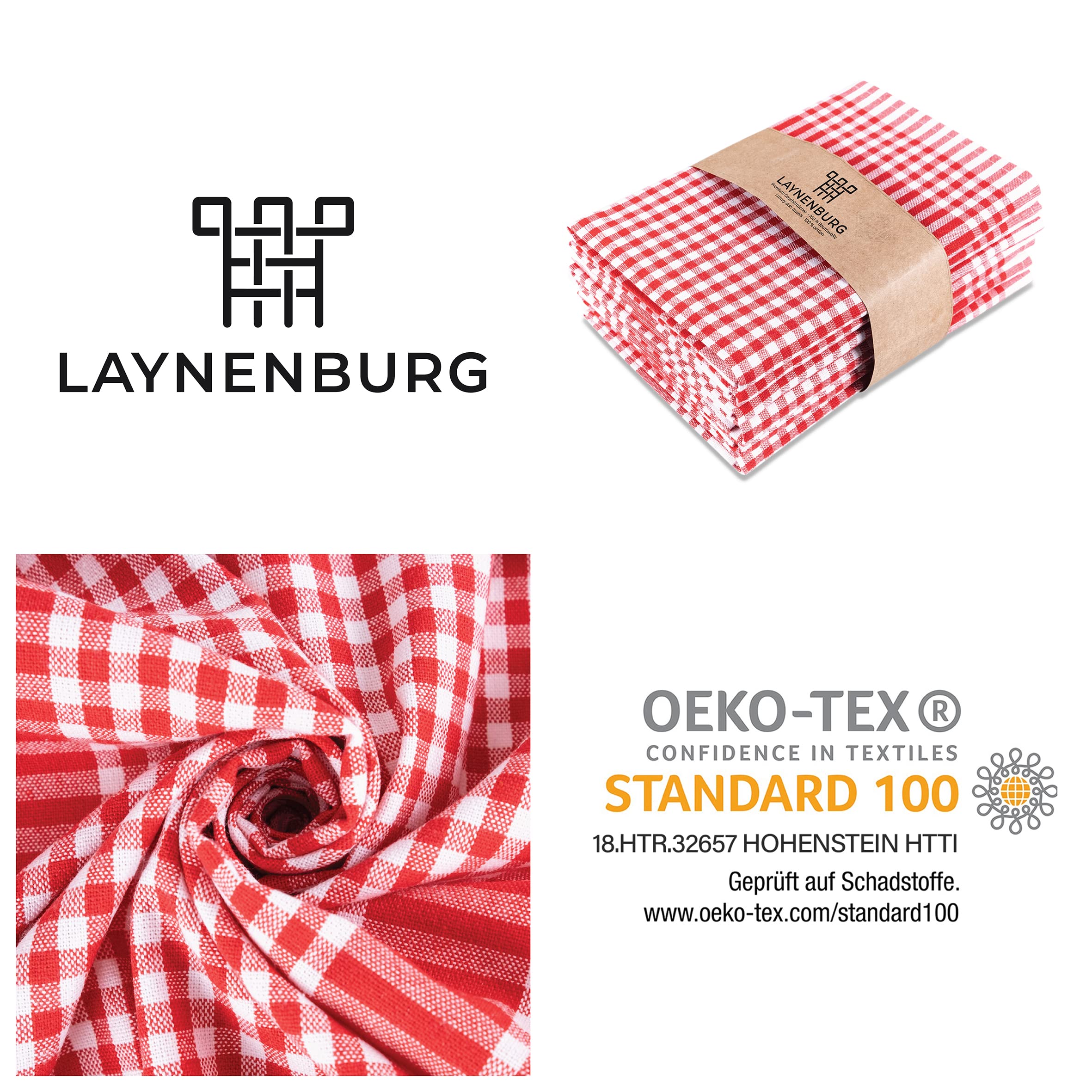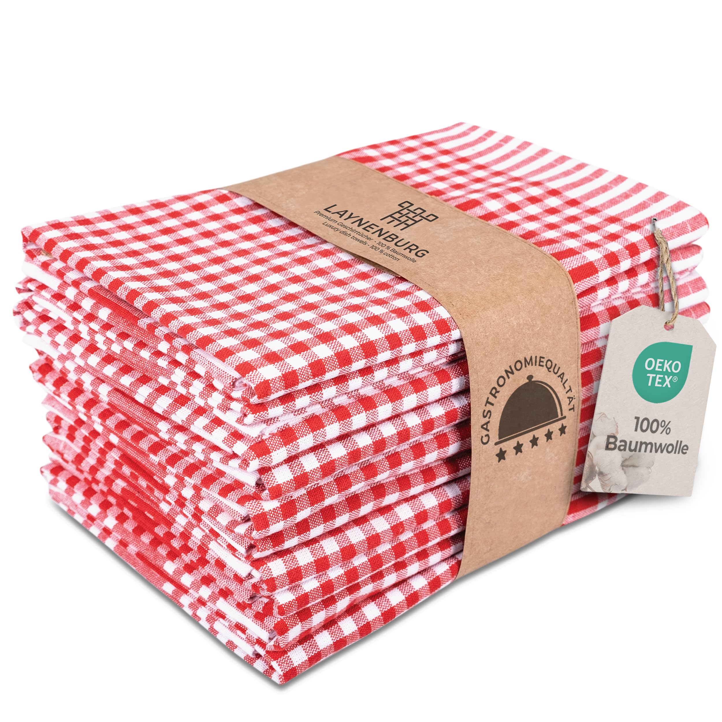 LAYNENBURG 10er-Set Premium Geschirrtücher kariert - 100% Baumwolle - OEKO TEX Standard 100 - 45x65 cm & Aufhänger - Küchentücher fusselfrei & modern - Vintage Küchenhandtücher ÖKOTEX ZERTIFIZIERT: -Unsere Baumwolltücher sind mit dem ÖKO-TEX Siegel STANDARD 100 - Geprüftes Vertrauen - (18.HTR.32657) ausgezeichnet. Über 100 Prüfkriterien gewährleisten die gesundheitliche Unbedenklichkeit der Materialien PREMIUM QUALITÄT: -Unser klassisches Geschirrtuch im zeitlosen Landhaus Design hat das optimale Materialgewicht von 180g/m², wodurch unsere Küchentücher besonders leicht in der Handhabung, enorm saugstark, schnelltrocknend & widerstandsfähig sind PRAKTISCH FUSSELFREI: -Geschirrhandtücher aus 100% hochwertiger, natürlicher Baumwollfaser! Profi-Qualität, um mühelos selbst Gläser & Besteck steifen / fusselfrei auf Hochglanz zu polieren ERSTKLASSIGE VERARBEITUNG: -Jede Naht dort, wo sie hingehört! Mehrfach abgesteppte Ecken, sowie optimal platzierte Aufhänger, garantieren Ihnen langlebige Freude in der Küche oder Gastro! REINIGUNG & PLFEGE: -Unsere Trockentücher sind bei 60 Grad waschbar und trocknergeeignet
