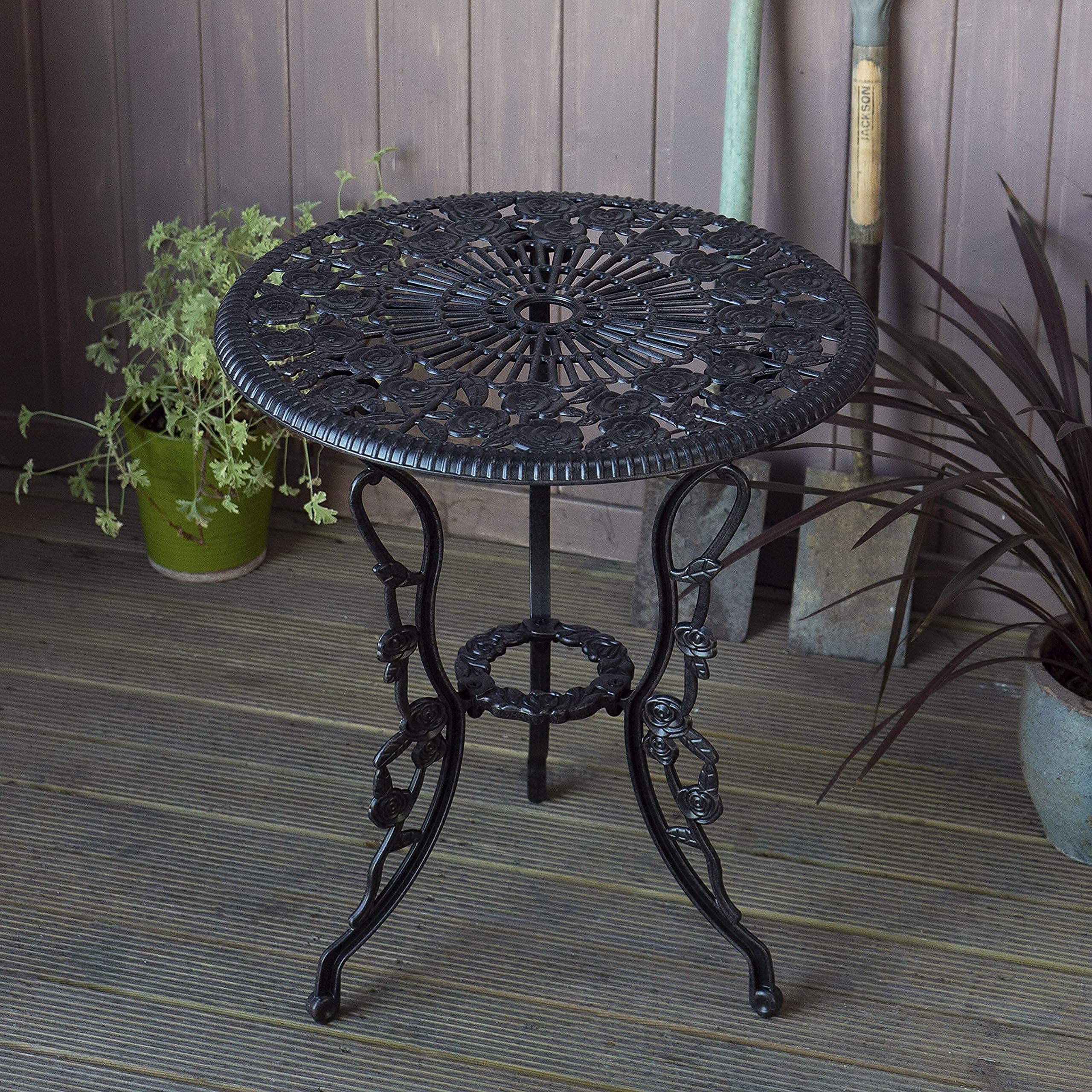 London Rose Bistro-Set in antiker Bronze, 60 cm, rund, Aluminium, für den Garten, Bistrotisch und Stuhl Das London Rose 2-Sitzer-Bistro-Set ist eine wunderschöne Ergänzung zu unserem Sortiment. Die Tischplatte selbst ist mit schönen englischen Rosen umrandet, die jedem Garten oder jeder Terrasse das typische britische Gefühl verleihen. Die London Rose ist aus robustem Aluminiumguss gefertigt, was bedeutet, dass sie nicht nur niemals rosten oder verrotten, sondern auch leicht genug ist, um sich leicht in Ihrem Garten zu bewegen, bis Sie den perfekten Platz finden. Suchen Sie sich einen sonnigen Platz in Ihrem Garten oder sogar auf einem Balkonplatz und geniessen Sie viele romantische Mahlzeiten und ungezwungene Getränke. Strapazierfähiger, langlebiger Aluminiumguss Schöne Metallverarbeitung