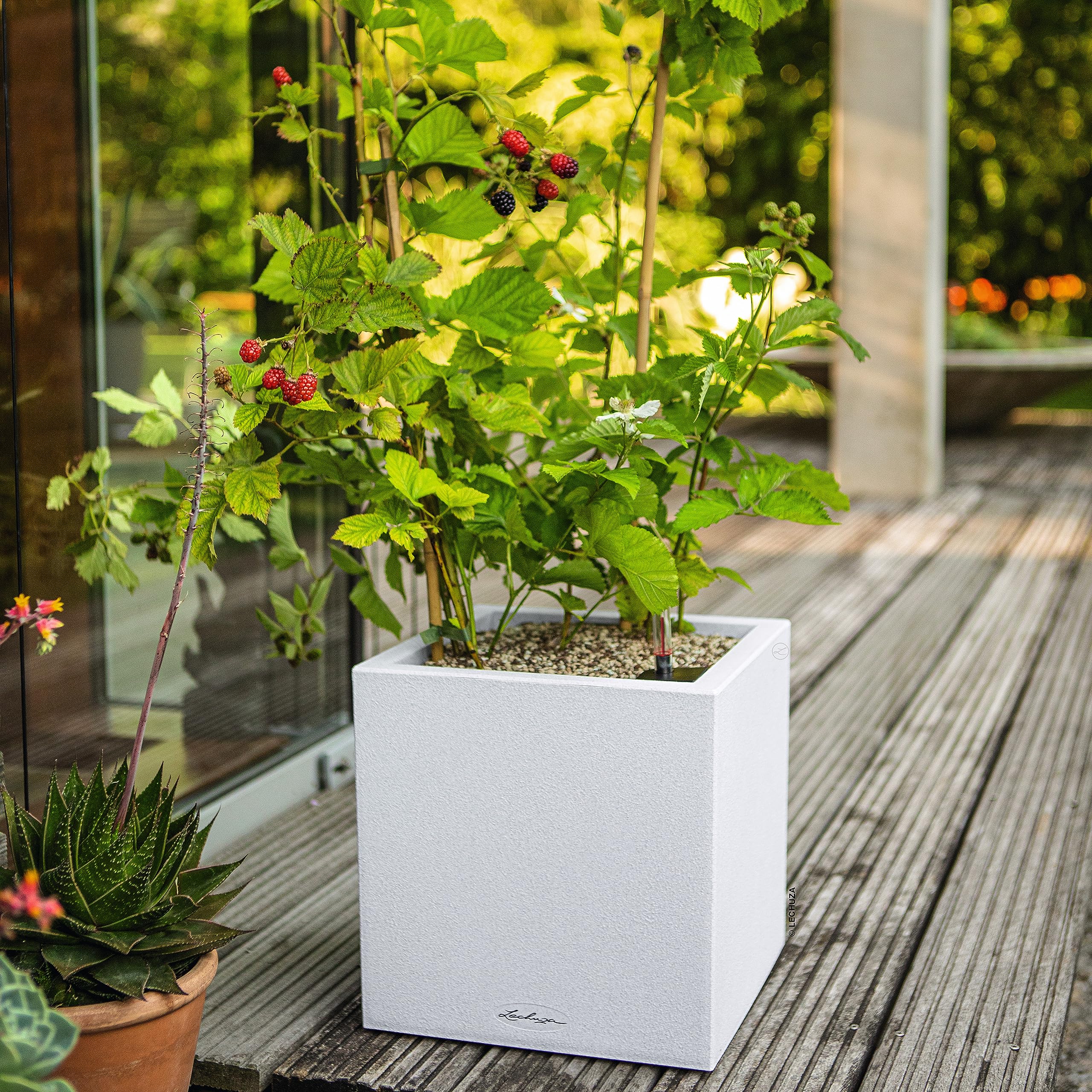 Wer klare Linien schätzt, wird CANTO Stone lieben. Die raue Natursteinoptik in drei Farbtönen bildet einen wunderbaren Kontrast zu sattem Grün und bunten Blüten. Dank gleicher Abmessungen kann der CANTO Pflanzeinsatz zwischen den beiden Modellen Würfel und Säule problemlos getauscht werden. CANTO Stone ist Gewinner des Red Dot Awards 2017, spiegelt Kernelemente zeitgemässer Architektur wider und setzt Pflanzen attraktiv in Szene. Zarte Frühblüher, üppige Sommerblüten, herbstliche Arrangements oder winterliche Bepflanzungen – die Gefässe in Naturstein-Optik bieten zu jeder Jahreszeit einen stimmungsvollen Kontrast zu den Pflanzen. Die Gefässe, die sich wie rauer, massiver Stein anfühlen, sind aus hochwertigem, wetterfestem Kunststoff und daher leicht zu transportieren. Und das LECHUZA-Bewässerungssystem übernimmt wie gewohnt die optimale Wasserversorgung der Pflanzen. Einfacher kann Pflanzenpflege nicht sein! CANTO Stone Pflanzeinsatz Wechselbarer Pflanzeinsatz – geschlossen, mit Rahmen in Gefässfarbe und Griffmulden Leichtes Transportieren, selbst von hohen Bepflanzungen Schnelles Ein- und Auswechseln der Bepflanzung Einfaches Überwintern Ihrer Bepflanzung Für die Innen- und Aussenbepflanzung, mit Bodenschraube