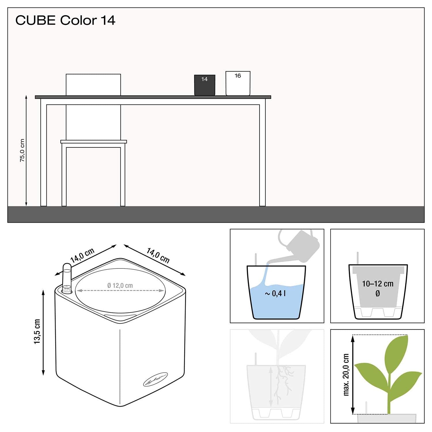 Immer griffbereit - immer frischArtikel Nr. 13478Ob Basilikum, Rosmarin, Thymian oder Schnittlauch - nicht alle Kräuter lassen sich zu Hause sofort verarbeiten. Dank Docht-Bewässerungssystem erhalten sie genau die richtige Menge an Wasser und bleiben so lange frisch.Kräuterfans aufgepasst: Mit LECHUZA gedeiht würziges Grün das ganze Jahr über problemlos auf der Fensterbank. Nach dem grossen Erfolg des CUBE Color 14 mit Stick-Bewässerungssystem, ist der dekorative Kräuterwürfel in zarter Gewebe-Optik auch eine Nummer grösser erhältlich. Im CUBE Color 16 haben Kulturtöpfe mit einem Durchmesser von 13 bis 15 Zentimetern Platz – ganz ohne Umtopfen – perfekt für die beliebten italienischen Küchenkräuter.Ob Basilikum, Thymian oder Rosmarin – nicht alle Kräuter im Kulturtopf lassen sich sofort komplett verarbeiten. Im LECHUZA CUBE Color können sie in Ruhe nachwachsen, so dass der Vorrat an frischen Kräutern nicht zur Neige geht.Dafür müssen die Kräuter nicht einmal umgetopft werden, denn das LECHUZA Stick-Bewässerungsset versorgt die Kräuter im Kulturtopf zuverlässig mit Feuchtigkeit. Dazu wird der Stick einfach von unten in den Kräutertopf gesteckt, dieser dann in den CUBE Color gesetzt und gegossen. Fertig.Über das Wasserreservoir werden die Pflanzen zuverlässig und individuell mit Feuchtigkeit versorgt. Ob mit 14 oder mit 17 Zentimetern Kantenlänge – in den Farbtönen weiss, schiefergrau und limettengrün lässt sich mit dem CUBE Color jede Fensterbank in einen kleinen Kräutergarten verwandeln. Der CUBE Color 14 ist ideal für alle Standard-Kräutertöpfe (10-12 cm Durchmesser).