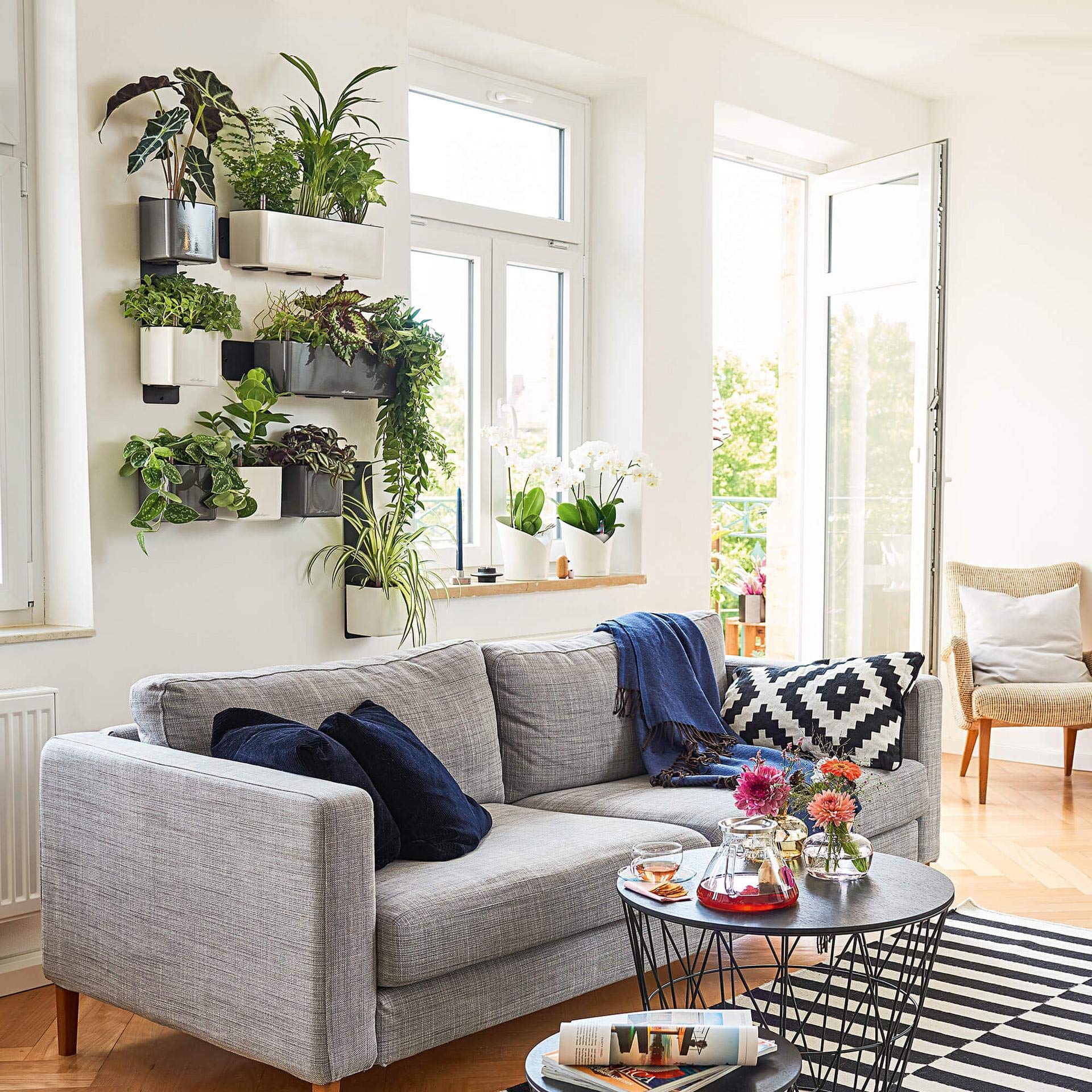 Eine grüne Wand in der Küche - mit dem Green Wall Home Kit. Das All-In-One Set mit praktischem Magnethalter und drei CUBE Color Pflanzgefässen ist der ideale, platzsparende Kräutergarten für die Küche. In die drei Pflanzgefässen passen herkömmliche Kräutertöpfe perfekt und versorgen sich mit dem integrierten Stick-Bewässerungssystems wie von selbst. Hierfür muss lediglich der mitgelieferte Stick in eines der Löcher des Growpots gesteckt werden bevor die Pflanze in das Gefäss eingesetzt wird. Damit können die einzelnen Pflanzen individuell bewässert und gepflegt werden. Die Pflanzgefässe werden mit einem Metallhalter ausgestattet und können anschliessen an der zugehörigen Metallleiste an der Wand befestigt werden. Stilvoll reihen sich die drei Pflanzgefässe nebeneinander ein und werden dank der feinen Webstruktur-Optik zum aussergewöhnlichen Blickfang. Das CUBE Color Starter-Set inklusive magnetischen Haltern mit Metallleiste bringt Kräuter und Pflanzen platzsparend an die Wand und sorgt stets für frische Kräuter in den Gerichten. Das Green Wall Kit des CUBE Colors ist in den Farben Schiefergrau und Weiss erhältlich. Für eine dauerhafte Bepflanzung von CUBE 14, 16 und Triple ist optional eine Pflanzplatte erhältlich. Alle LECHUZA-Pflanzgefässe werden in Deutschland unter höchsten Produktionsstandards hergestellt. Die langlebigen Kunststoffgefässe sind bruchsicher, witterungsbeständig und vollständig recycelbar. Alle schwarzen Pflanzeinsätze sind aus 100% recyceltem Kunststoff hergestellt. Lieferumfang: 1x LECHUZA CUBE Color Triple Kräutertopf, Inkl. 3x Stick-Bewässerungssystem, 1x Metalleiste und drei magnetische Halterungen