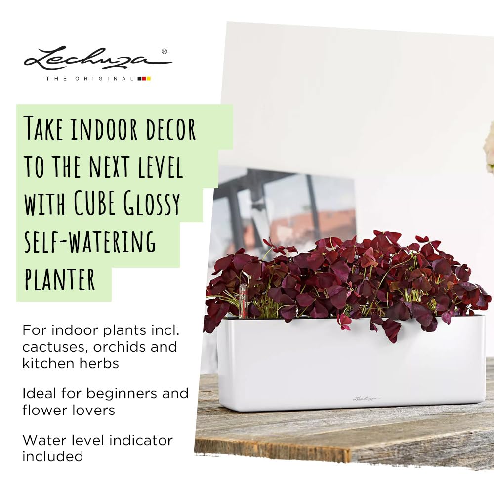 Das Pflanzgefäss CUBE Glossy Triple bietet viel Platz für Blumen, Kräuter oder Grünpflanzen und setzt edle Akzente für ein glänzendes Wohnfeeling. Mit seiner länglichen Form überzeugt das neue Gefäss als Kräutergarten auf der Fensterbank, als Sukkulenten-Garten auf dem Wohnzimmerregal oder mit Blühpflanzen bestückt als ausgefallene Tischdekoration. Insgesamt drei Pflanzen finden im CUBE Triple ihren Platz und können individuell kombiniert werden. Um das Wohlergehen der Pflanzen kümmert sich das im Gefäss integrierte Stick-Bewässerungssystem, welches ganz unkompliziert ohne Umtopfen funktioniert. Hierfür wird in jeden der drei Kulturtöpfe der mitgelieferte Stick in eines der Bodenlöcher gesteckt und anschliessend in das Gefäss eingesetzt. Die Pflanzen versorgen sich von nun an wie von selbst mit genau der Menge an Wasser, die sie benötigen. Die Hochglanz-Oberfläche ist ein moderner Kontrast zu grünen Zimmerpflanzen oder grazilen Blüten und macht CUBE Glossy Triple zu einem Pflanzgefäss, das die Blicke auf sich zieht. Erhältlich in vielen verschiedenen Farben. Für eine dauerhafte Bepflanzung von CUBE 14, 16 und Triple ist optional eine Pflanzplatte erhältlich. Alle LECHUZA-Pflanzgefässe werden in Deutschland unter höchsten Produktionsstandards hergestellt. Die langlebigen Kunststoffgefässe sind bruchsicher, witterungsbeständig und vollständig recycelbar. Alle schwarzen Pflanzeinsätze sind aus 100% recyceltem Kunststoff hergestellt. Lieferumfang: 1x LECHUZA CUBE Glossy Triple mit Pflanzeinsatz, inkl. Bewässerungssystem mit 3x Bewässerungssticks