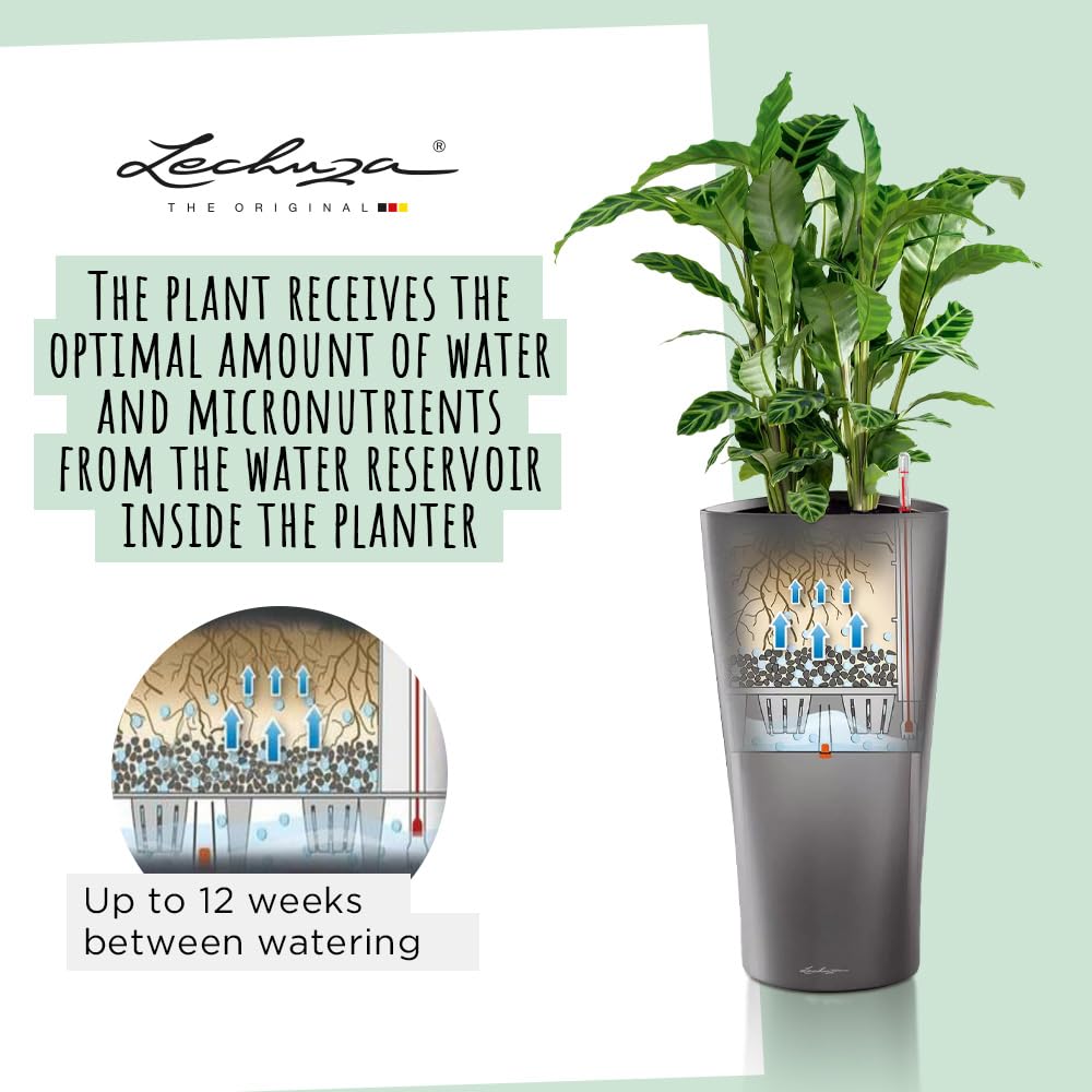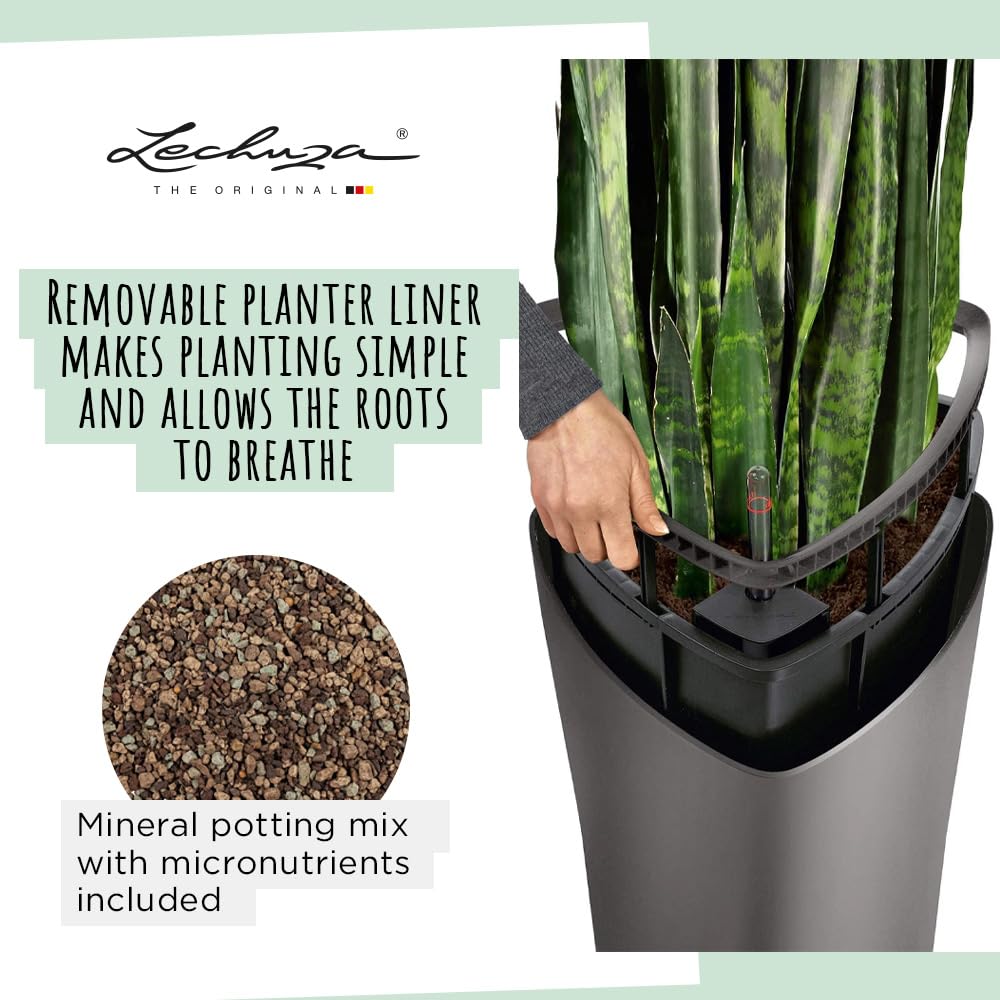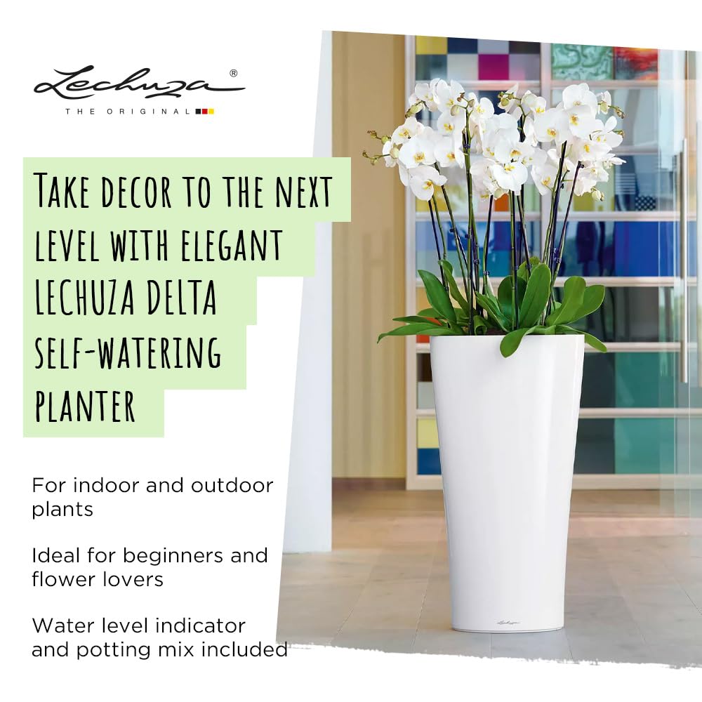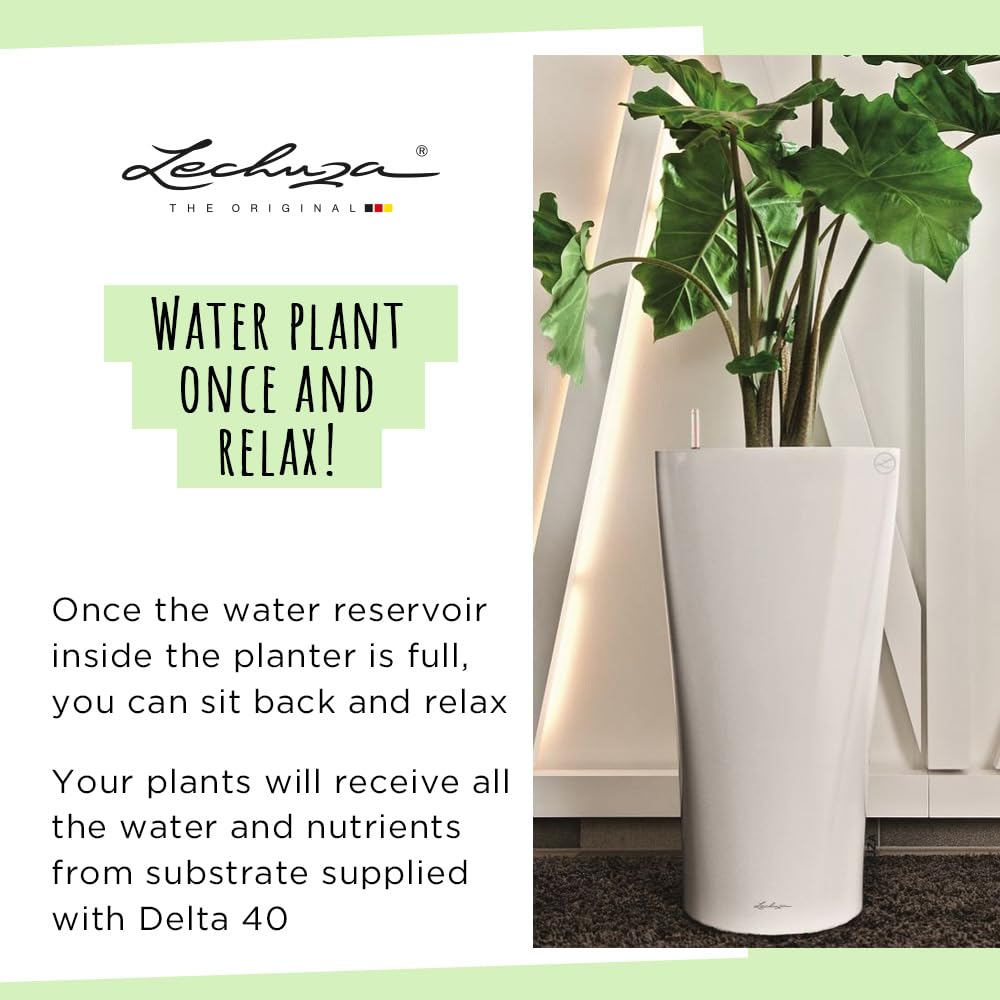 Funktion und Design in einer einzigartigen Dreiecksform vereint – DELTA Premium ist unaufdringlich und dabei ausserordentlich ästhetisch. Die fliessenden, weichen Kanten umrunden das mit Designpreisen ausgezeihnete Pflanzgefäss und werden so zu einem aussergewöhnlichem Deko-Element. Besonders Zimmerpflanzen wie Palmen, Ficus oder Strelizien fühlen sich in der aufregenden Pflanzsäule wohl. Denn im Pflanzgefäss ist das Original LECHUZA-Bewässerungssystem integriert, welches dank grossem Wasserreservoir die Pflanzen stets mit der ausreichenden Menge an Wasser versorgt. Am Wasserstandsanzeiger lässt sich ablesen, wann das Reservoir wieder zu befüllen ist - nie wieder Unter- oder Überwassern der Pflanzen! Das Bepflanzen fällt dank des integrierten Pflanzeisatzes mit versenkbaren Griffrahmen komfortabel einfach aus und erleichtert zudem die Pflanzenpflege. Da der Griffrahmen des Pflanzeinsatzes in Gefässfarbe gehalten ist, fällt er nicht auf und gibt eine harmonische Linie mit dem Gefässrand ab. Damit kombiniert das LECHUZA Pflanzgefäss "DELTA Premium" volle Funktionalität mit hohem Designanspruch. DELTA Premium ist in den Grössen 30 und 40 sowie den hochglänzenden Premium Farben Weiss, Scrarlet Rot und anthrazit metallic erhältlich. Alle LECHUZA-Pflanzgefässe werden in Deutschland unter höchsten Produktionsstandards hergestellt. Die langlebigen Kunststoffgefässe sind bruchsicher, witterungsbeständig und vollständig recycelbar. Alle schwarzen Pflanzeinsätze sind aus 100% recyceltem Kunststoff hergestellt. Lieferumfang: 1x LECHUZA DELTA Premium, inkl. Bewässerungssystem, Pflanzsubstrat LECHUZA-PON als Drainageschicht und wechselbarem Pflanzeinsatz versenkbarem Griffrahmen in Gefässfarbe