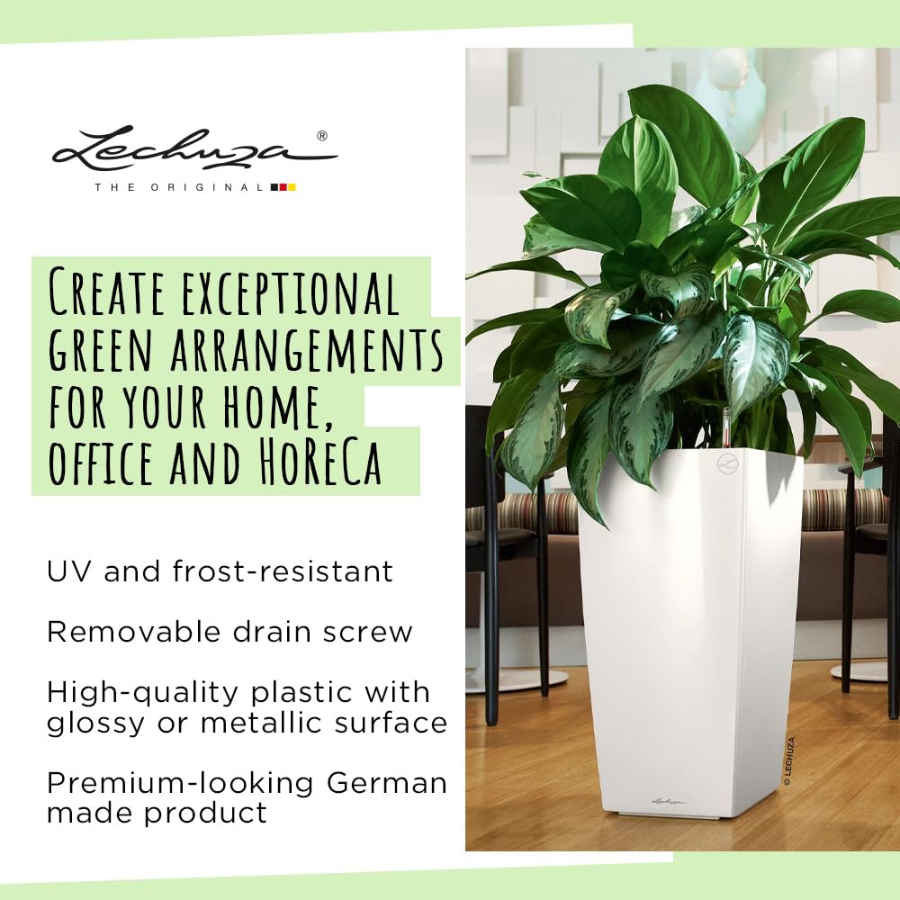 Kleine Gefässe, grosse Pflanzenfreude: Die minimalistischen Tischgefässe MAXI-CUBI und MINI-CUBI setzen mit ihren klaren Linien stilvolle Akzente und werden zum Blickfang auf jeder Stellfläche. Kleine Blumen-Arragement oder Zimmerpflanzen kommen in den Pflanzgefässen sehr gut zur Geltung und bringen frisches Grün auf den Tisch. Sowohl die Hochglanz- als auch die Metallic-Oberfläche strahlt Eleganz und Wertigkeit aus, womit die Pflanzgefässe die ideale Geschenkidee für Geburtstag, Jubiläum oder zur Hochzeit sind. Dabei kümmert sich das integrierte Docht-Bewässerungssystem um das Wohlergehen der Pflanzen und versorgt sie zuverlässig mit der ausreichenden Wassermenge. Im Lieferumfang ist bereits eine ausreichende Menge des Substrats "LECHUZA PON" enthalten, womit das gesamte Gefäss bepflanzt werden kann. Noch ein weiterer Pluspunkt ist der herausnehmbare Pflanzeinsatz, mit welchem sich das Bepflanzen, die Pflanzenpflege und der Wurzelbeschnitt komfortabel einfach gestaltet. Die breite Palette an Grössen, Farben und Zubehör macht MINI-CUBI und MAXI-CUBI vielfältig einsetzbar und bereitet stets grosse Freude. Alle LECHUZA-Pflanzgefässe werden in Deutschland unter höchsten Produktionsstandards hergestellt. Die langlebigen Kunststoffgefässe sind bruchsicher, witterungsbeständig und vollständig recycelbar. Alle schwarzen Pflanzeinsätze sind aus 100% recyceltem Kunststoff hergestellt. Lieferumfang: 1x LECHUZA MAXI-CUBI, inkl. Bewässerungssystem, Pflanzsubstrat LECHUZA-PON und Pflanzeinsatz mit Wasserstandsanzeiger