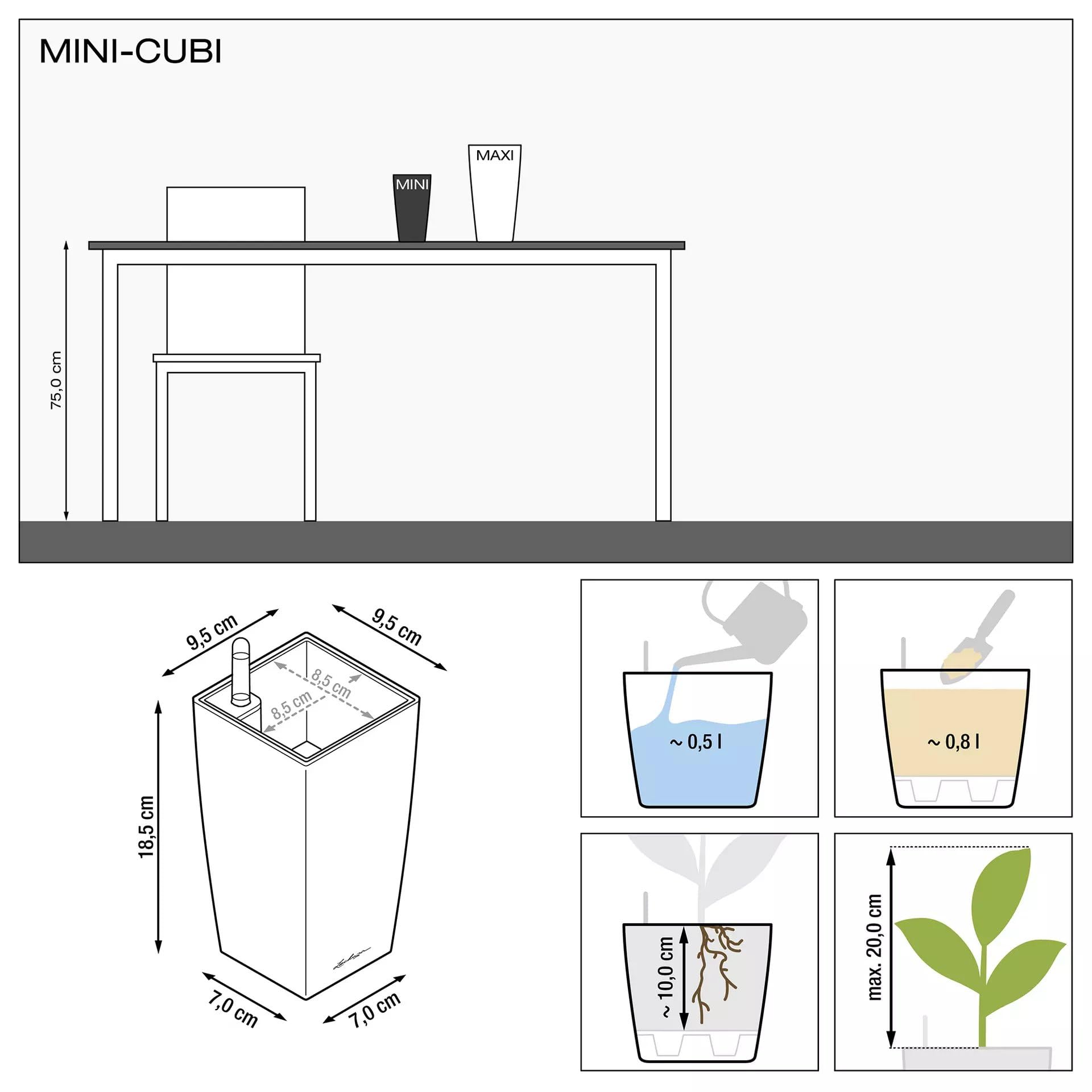 Kleine Gefässe, grosse Pflanzenfreude: Die minimalistischen Tischgefässe MAXI-CUBI und MINI-CUBI setzen mit ihren klaren Linien stilvolle Akzente und werden zum Blickfang auf jeder Stellfläche. Kleine Blumen-Arragement oder Zimmerpflanzen kommen in den Pflanzgefässen sehr gut zur Geltung und bringen frisches Grün auf den Tisch. Sowohl die Hochglanz- als auch die Metallic-Oberfläche strahlt Eleganz und Wertigkeit aus, womit die Pflanzgefässe die ideale Geschenkidee für Geburtstag, Jubiläum oder zur Hochzeit sind. Dabei kümmert sich das integrierte Docht-Bewässerungssystem um das Wohlergehen der Pflanzen und versorgt sie zuverlässig mit der ausreichenden Wassermenge. Im Lieferumfang ist bereits eine ausreichende Menge des Substrats "LECHUZA PON" enthalten, womit das gesamte Gefäss bepflanzt werden kann. Noch ein weiterer Pluspunkt ist der herausnehmbare Pflanzeinsatz, mit welchem sich das Bepflanzen, die Pflanzenpflege und der Wurzelbeschnitt komfortabel einfach gestaltet. Die breite Palette an Grössen, Farben und Zubehör macht MINI-CUBI und MAXI-CUBI vielfältig einsetzbar und bereitet stets grosse Freude. Alle LECHUZA-Pflanzgefässe werden in Deutschland unter höchsten Produktionsstandards hergestellt. Die langlebigen Kunststoffgefässe sind bruchsicher, witterungsbeständig und vollständig recycelbar. Alle schwarzen Pflanzeinsätze sind aus 100% recyceltem Kunststoff hergestellt. Lieferumfang: 1x LECHUZA MAXI-CUBI, inkl. Bewässerungssystem, Pflanzsubstrat LECHUZA-PON und Pflanzeinsatz mit Wasserstandsanzeiger