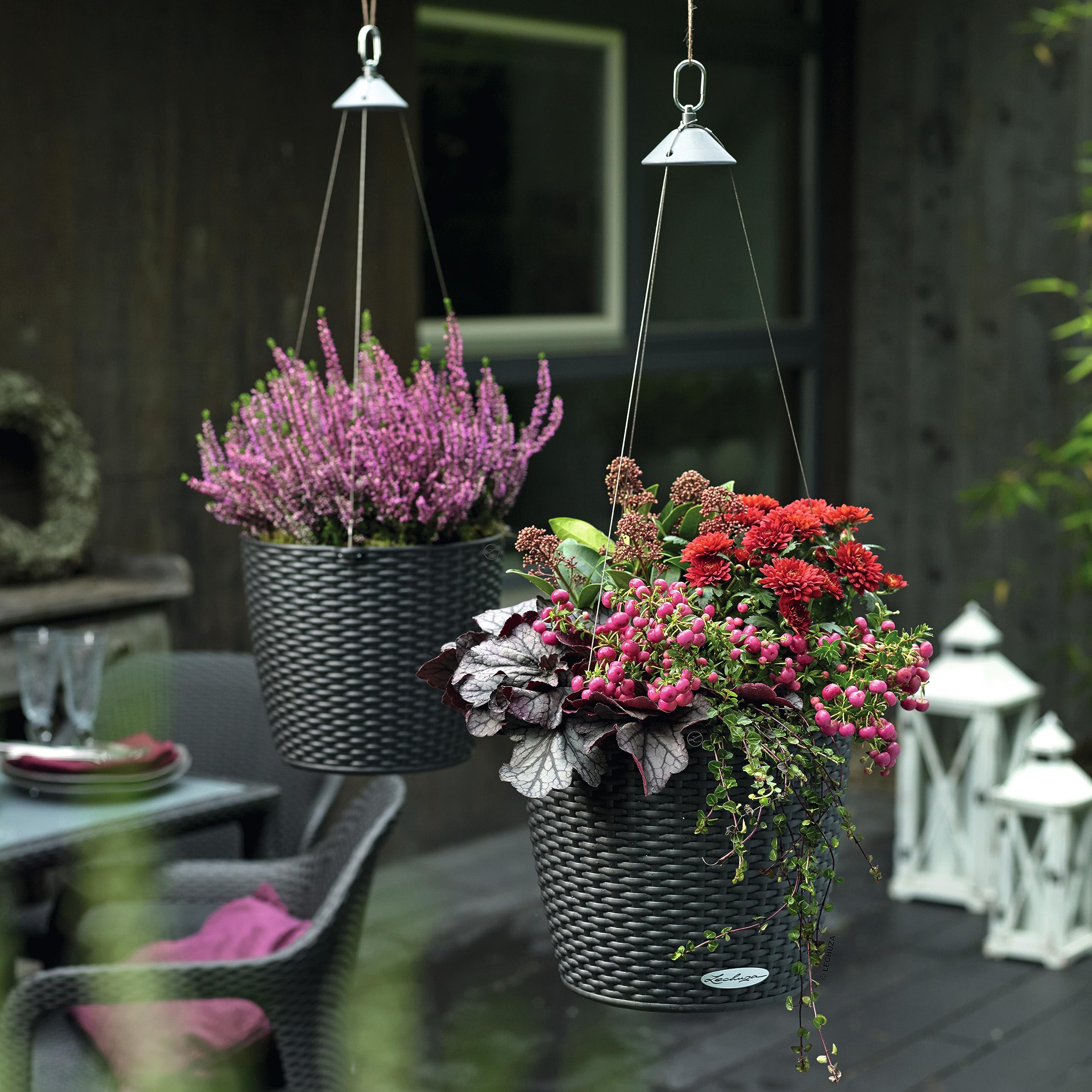 Die Blumenampel NIDO Cottage ist mit der täuschend echten Flechtoptik-Optik ein echter Hingucker und verleiht jedem Ambiente eine natürlich, rustikale Atmosphäre. Dank der bruchsicheren und witterungsbeständigen Oberfläche, sowie der rostfreien Edelstahl-Aufhängung eignet sich NIDO hervorragend für den Aussenbereich und begrünt Gärten, Balkone und Terassen in luftiger Höhe. So kommt der romantische Landhausstil auf Augenhöhe! Im Pflanzgefäss selbst ist das Original LECHUZA-Bewässerungssystem integriert, welches sich zuverlässig um das Wohlergehen der Pflanzen kümmert und sie danke grossem Wasserreservoir auch an heissen Tagen mit Wasser versorgt. Überschüssiges Regenwasser kann über den intelligent versteckten Regenablauf an der Gefässunterseite abfliessen, wodurch Staunässe vermieden wird. Die Hängeampel kann dank des herausnehmbaren Pflanzeinsatzes ganz komfortabel auf dem Tisch oder dem Boden bepflanzt werden, wodurch auch die Pflanzenpflege einfach und schnell erfolgen kann. Ein wahrer Hingucker für den all diejenigen, welche die natürliche Flecht-Optik lieben. Tipp: Die Edelstahl-Aufhängung kann nach Belieben entfernt werden, sodass sich NIDO auch als Tischgefäss eignet. Die Blumenampel ist in zwei Grössen und vielen verschiedenen Farben wie beispielsweise Flieder, Lichtgrau, Sandbraun, Anthrazit oder Weiss erhältlich und lässt sich perfekt mit anderen Gefässen der LECHUA Cottage-Familie kombinieren. Alle LECHUZA-Pflanzgefässe werden in Deutschland unter höchsten Produktionsstandards hergestellt. Die langlebigen Kunststoffgefässe sind bruchsicher, witterungsbeständig und vollständig recycelbar. Alle schwarzen Pflanzeinsätze sind aus 100% recyceltem Kunststoff hergestellt. Lieferumfang: 1x LECHUZA NIDO Cottage, Inkl. Bewässerungssystem, LECHUZA-PON als Drainageschicht, herausnehmbarem Pflanzeinsatz und Edelstahl-Aufhängung