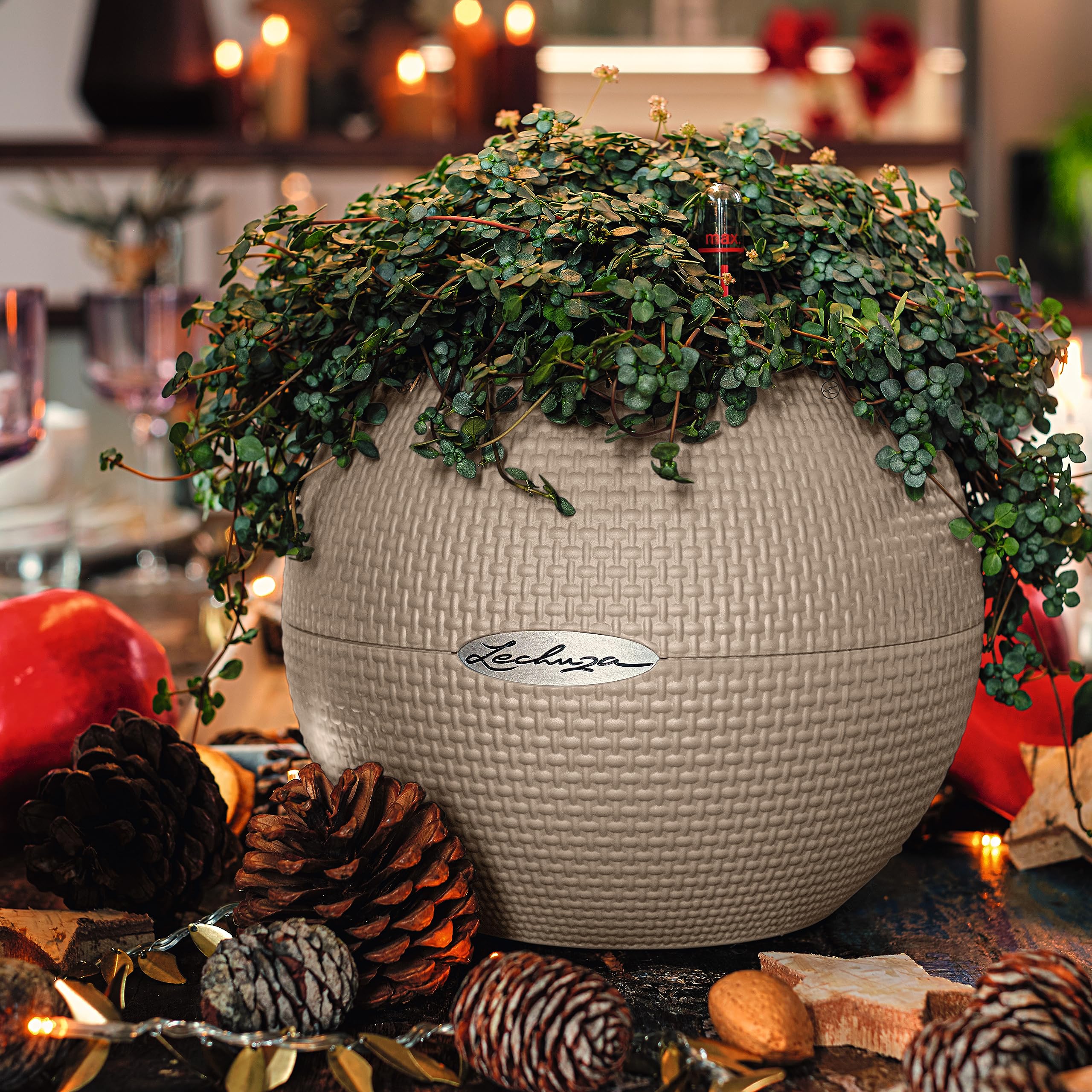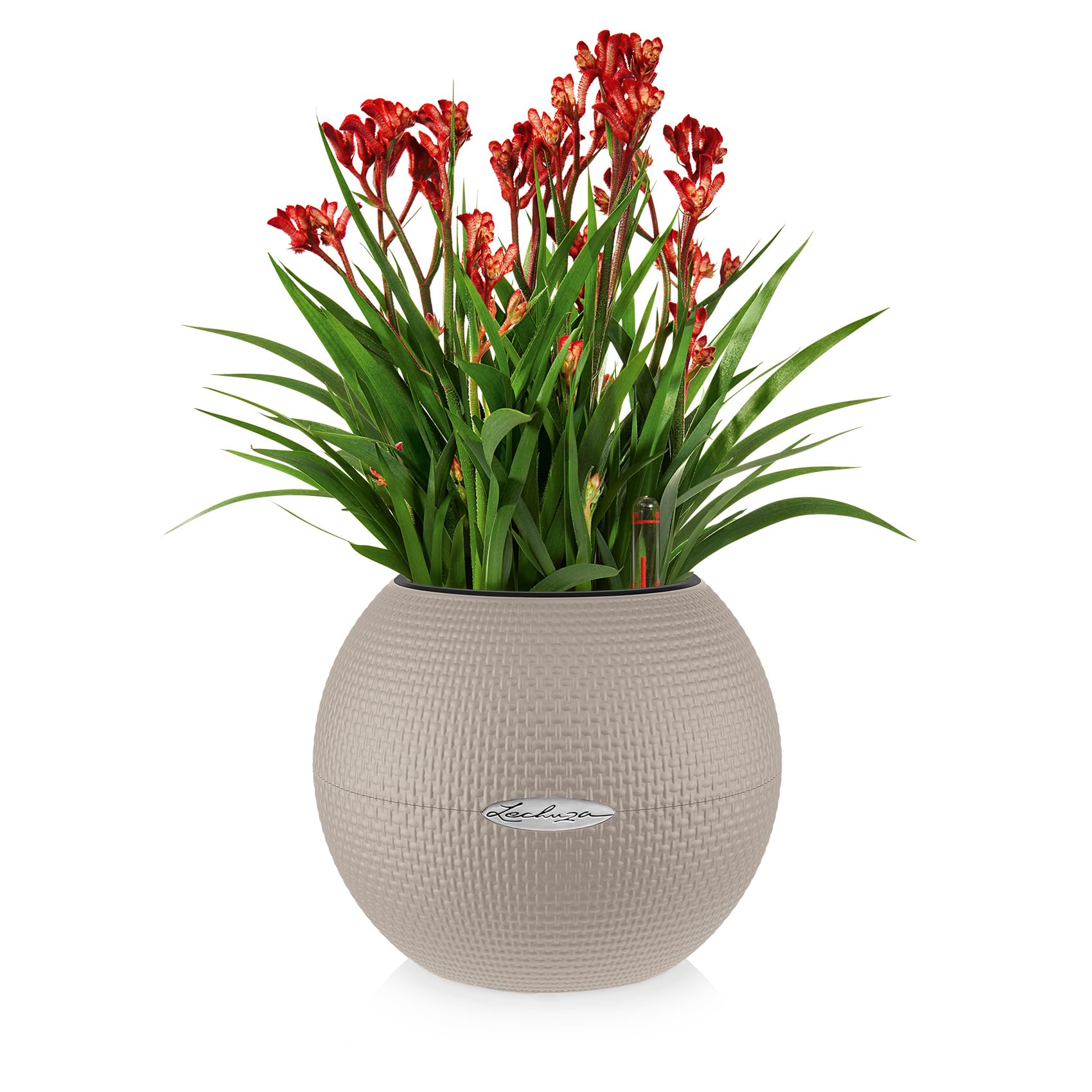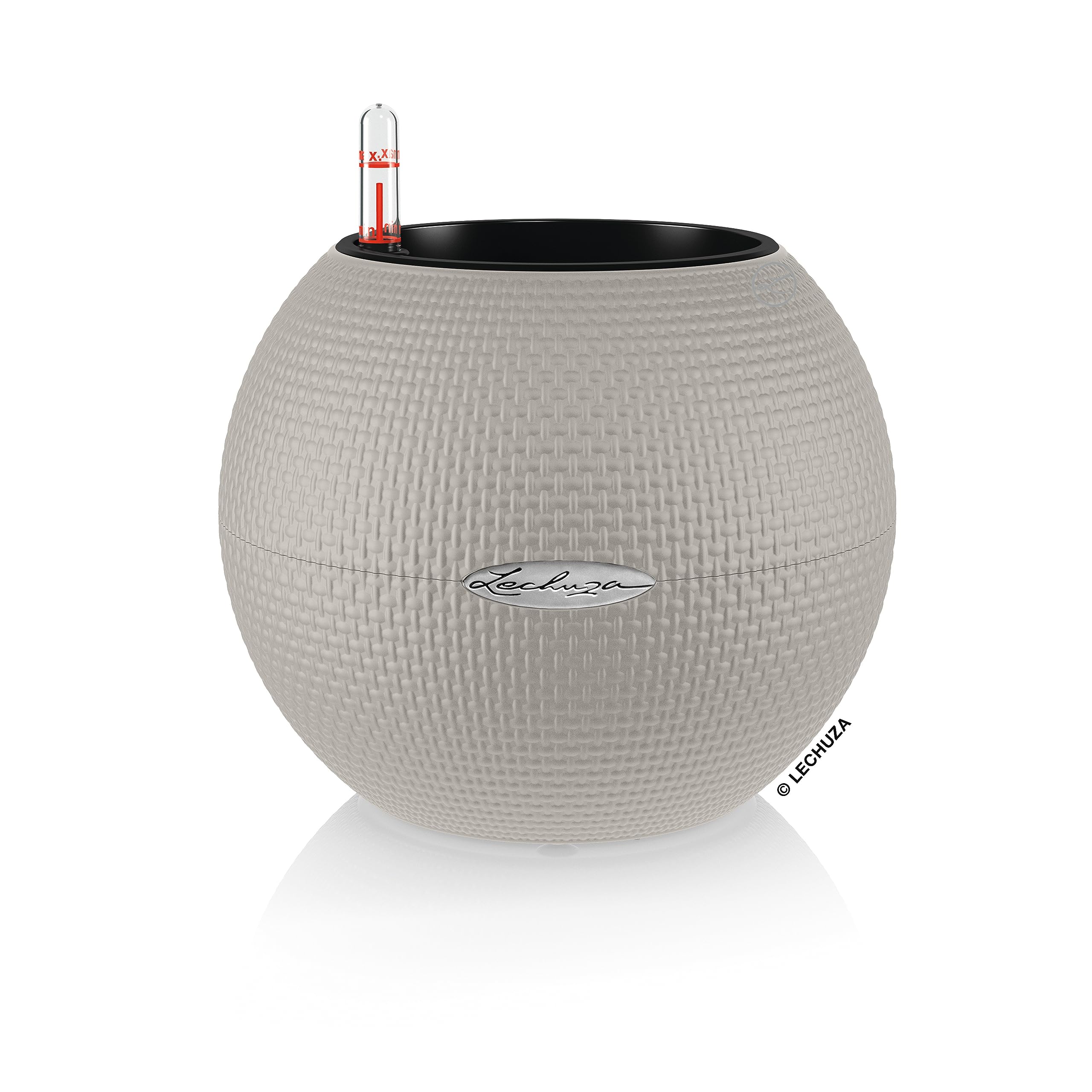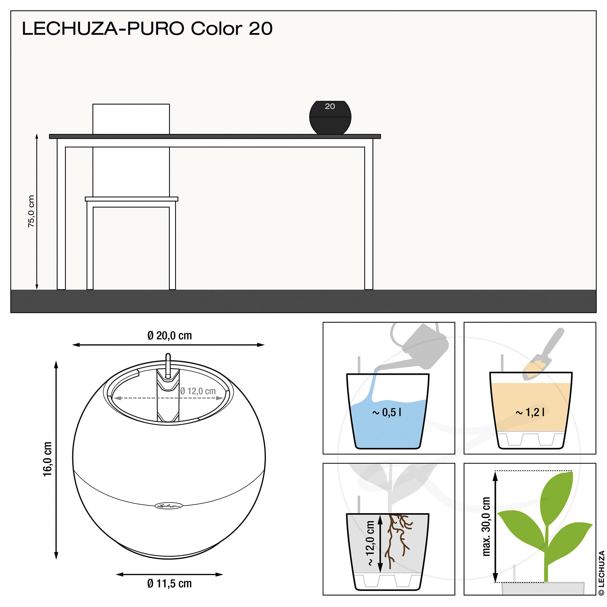 Grünpflanzen, Hängepflanzen und bunte Blumen werden mit dem Pflanzgefäss PURO 20 perfekt abgerundet! Das kugelförmige Pflanzgefäss umschmeichelt mit der feinen Webstruktur die Pflanzen geradezu und setzt sie gekonnt in Szene. Der moderne, auffällige Look und die zeitlosen Farben passen hervorragend in jedes Ambiente - sei es auf den Tisch, der Kommode oder hängend im Makramee. Bepflanzt werden kann das Pflanzgefäss PURO 20 ganz komfortabel über den herausnehmbaren Pflanzeinsatz, welcher mit dem Docht-Bewässerungssystem ausgestattet ist. Mit diesem Bewässerungssystem versorgt sich die Pflanze wie von selbst mit der ausreichenden Menge an Wasser. Am bestens funktioniert dieses System mit der ausschliesslichen Verwendung des Substrats "LECHUZA-PON", welches bereits in ausreichender Menge im Lieferumfang enthalten ist. Für die Bepflanzung wird kein weiteres Substrat oder Erde benötigt und PURO kann sofort dort eingesetzt werden, wo Pflanzen noch fehlen. Das Pflanzgefäss PURO ist in vielen verschiedenen Farben erhältlich, sodass es sich auch als ideales Geschenk eignet. Alle LECHUZA-Pflanzgefässe werden in Deutschland unter höchsten Produktionsstandards hergestellt. Die langlebigen Kunststoffgefässe sind bruchsicher, witterungsbeständig und vollständig recycelbar. Alle schwarzen Pflanzeinsätze sind aus 100% recyceltem Kunststoff hergestellt. Lieferumfang: 1x LECHUZA PURO 20, inkl. Bewässerungssystem, Pflanzsubstrat LECHUZA-PON und Pflanzeinsatz