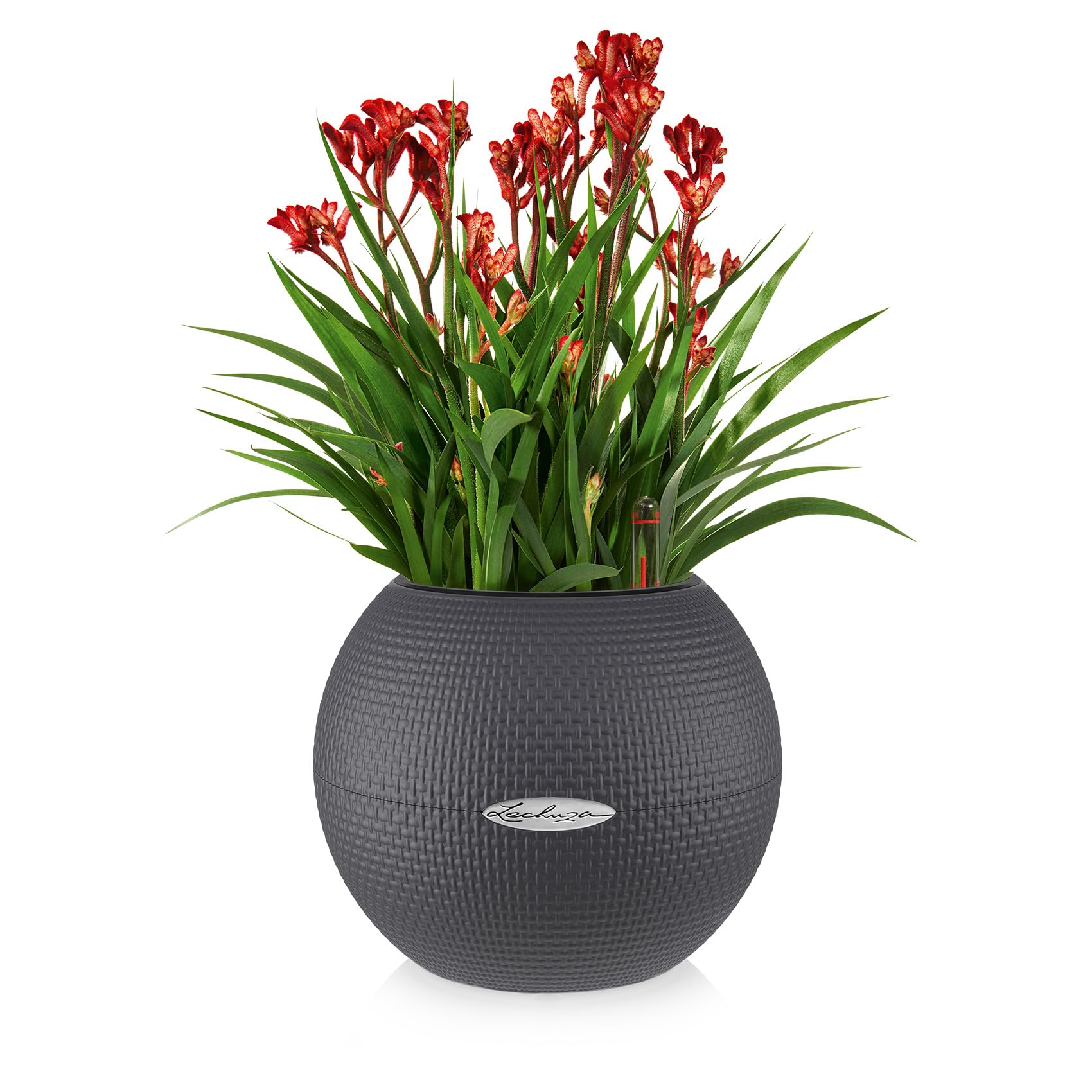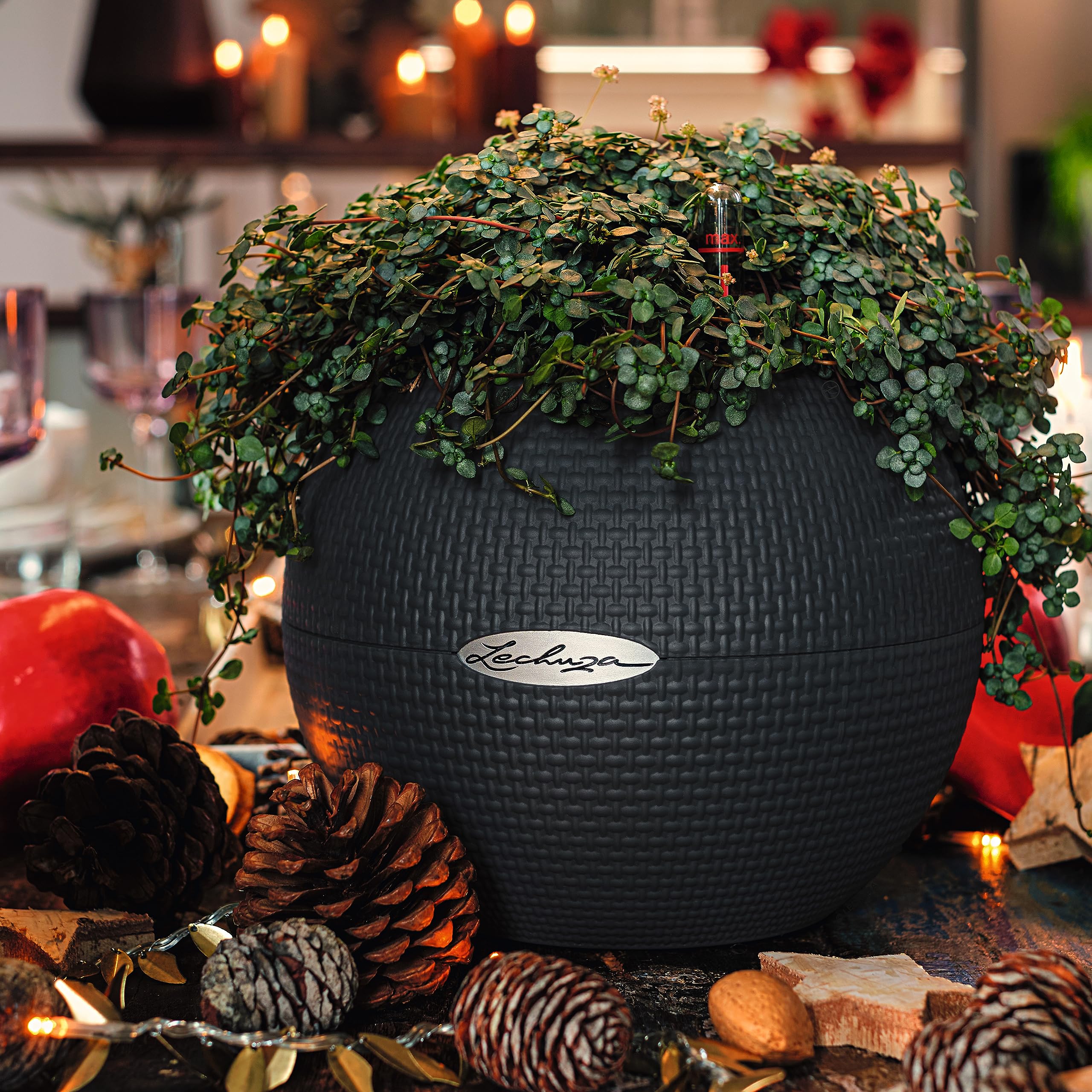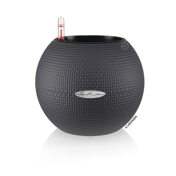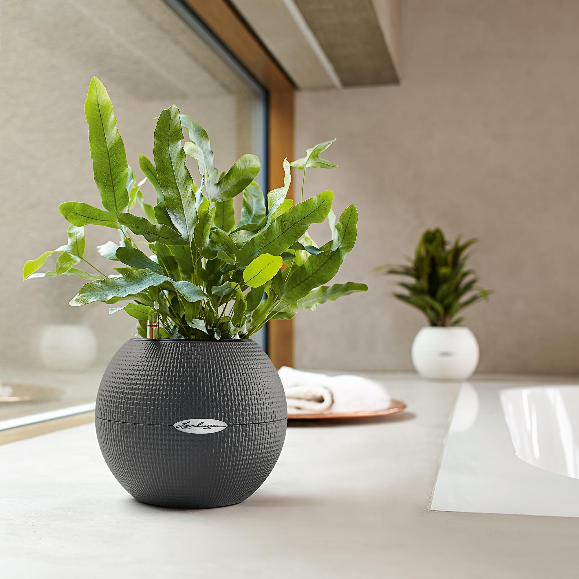 Grünpflanzen, Hängepflanzen und bunte Blumen werden mit dem Pflanzgefäss PURO 20 perfekt abgerundet! Das kugelförmige Pflanzgefäss umschmeichelt mit der feinen Webstruktur die Pflanzen geradezu und setzt sie gekonnt in Szene. Der moderne, auffällige Look und die zeitlosen Farben passen hervorragend in jedes Ambiente - sei es auf den Tisch, der Kommode oder hängend im Makramee. Bepflanzt werden kann das Pflanzgefäss PURO 20 ganz komfortabel über den herausnehmbaren Pflanzeinsatz, welcher mit dem Docht-Bewässerungssystem ausgestattet ist. Mit diesem Bewässerungssystem versorgt sich die Pflanze wie von selbst mit der ausreichenden Menge an Wasser. Am bestens funktioniert dieses System mit der ausschliesslichen Verwendung des Substrats "LECHUZA-PON", welches bereits in ausreichender Menge im Lieferumfang enthalten ist. Für die Bepflanzung wird kein weiteres Substrat oder Erde benötigt und PURO kann sofort dort eingesetzt werden, wo Pflanzen noch fehlen. Das Pflanzgefäss PURO ist in vielen verschiedenen Farben erhältlich, sodass es sich auch als ideales Geschenk eignet. Alle LECHUZA-Pflanzgefässe werden in Deutschland unter höchsten Produktionsstandards hergestellt. Die langlebigen Kunststoffgefässe sind bruchsicher, witterungsbeständig und vollständig recycelbar. Alle schwarzen Pflanzeinsätze sind aus 100% recyceltem Kunststoff hergestellt. Lieferumfang: 1x LECHUZA PURO 20, inkl. Bewässerungssystem, Pflanzsubstrat LECHUZA-PON und Pflanzeinsatz