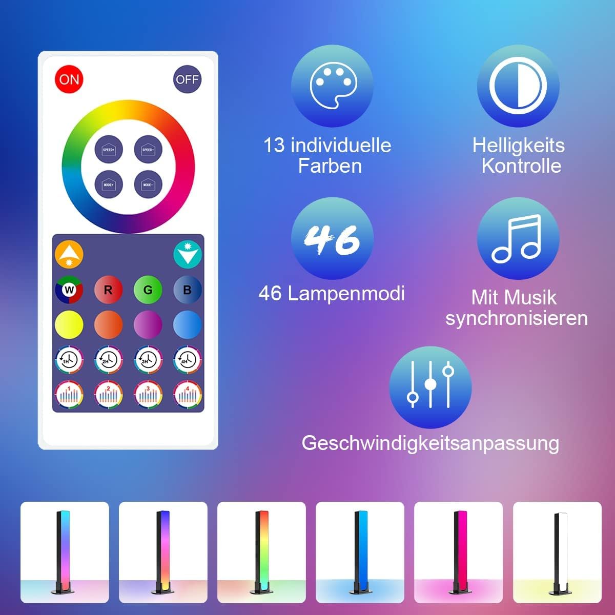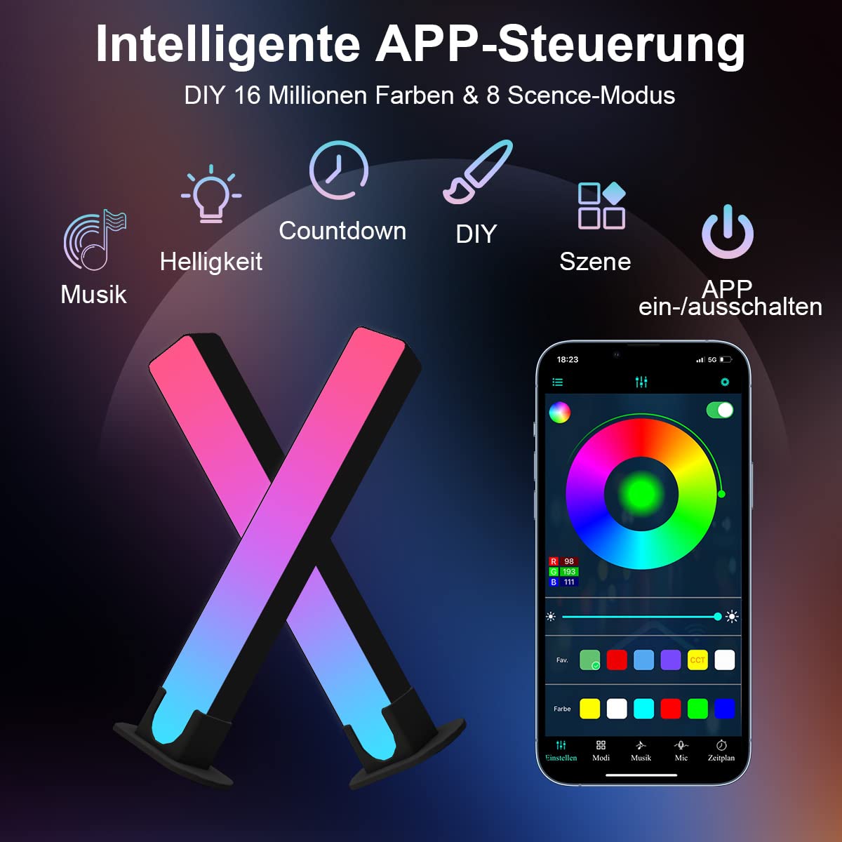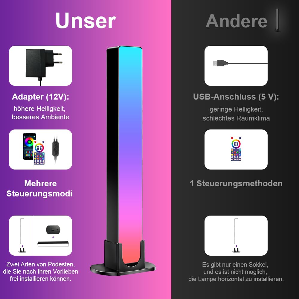Die LED-Leuchte verfügt über ein integriertes hochempfindliches Mikrofon, das nicht nur den Musikplayer, sondern auch die Umgebungsgeräusche synchronisiert. Sie kann auf den Takt von Musik, Film und Spielen reagieren und sich im Takt bewegen, um ein unvergleichliches Klang- und Lichterlebnis zu erreichen. Ideal für Videospiele, Filme, Geburtstagsfeiern, Innendekoration oder andere Anlässe wie Kindertag, Weihchten, Valentinstag und Jahrestage. Funktion : Unterhaltungs beleuchtung hinzufügen Timer-Einstellungen Musik-Synchronisation Farboptionen Szene-Modi Intelligente App 16 Millionen Farben Einfach zu installieren