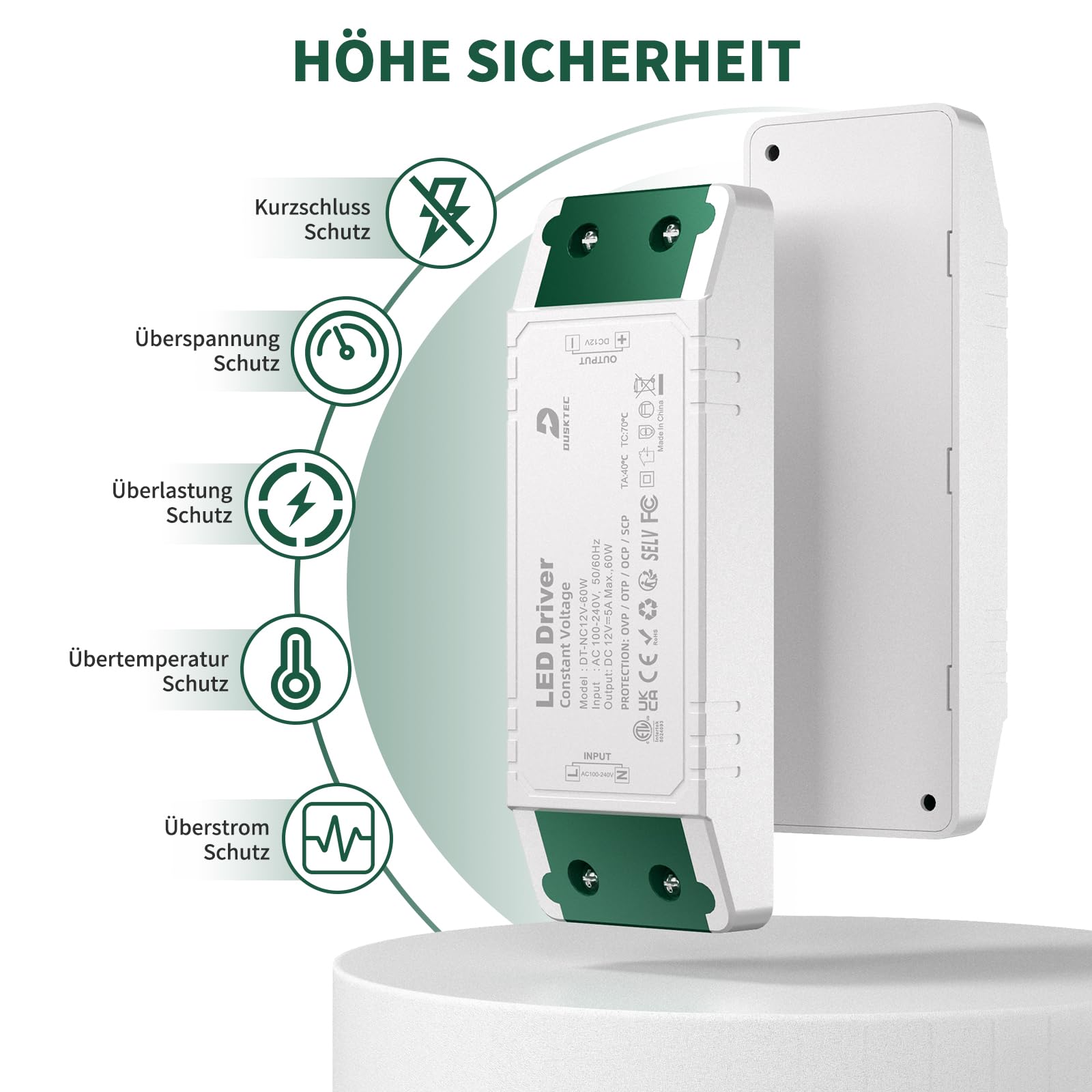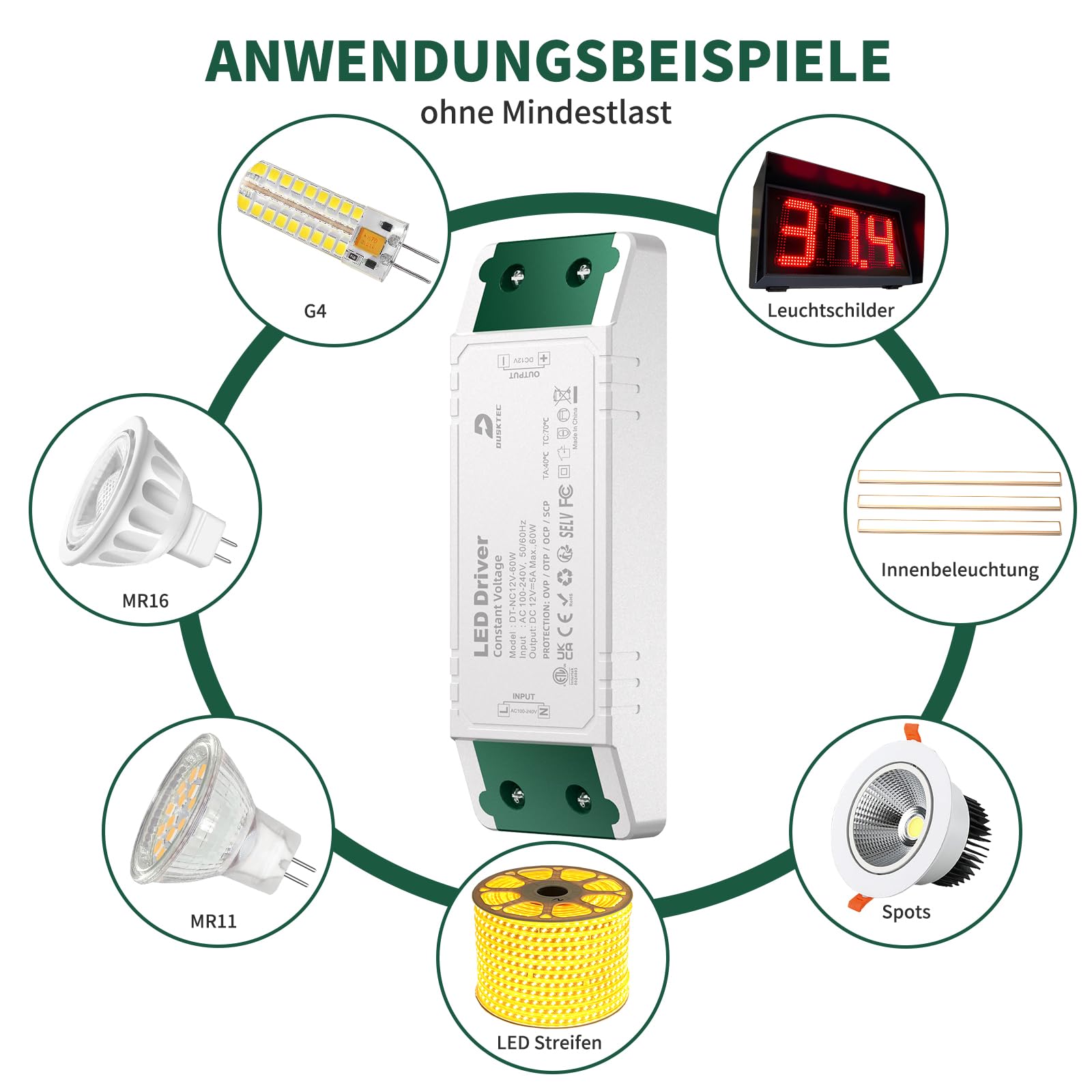 LED Trafo 230V auf 12V 60W, 5A LED Transformator Treiber Netzteil AC/DC Konstantspannungs, Niedervolttrafo Schaltnetzteil LED Driver Power Supply für MR16 GU5.3 MR11 G4 Lampen Strip, DUSKTEC