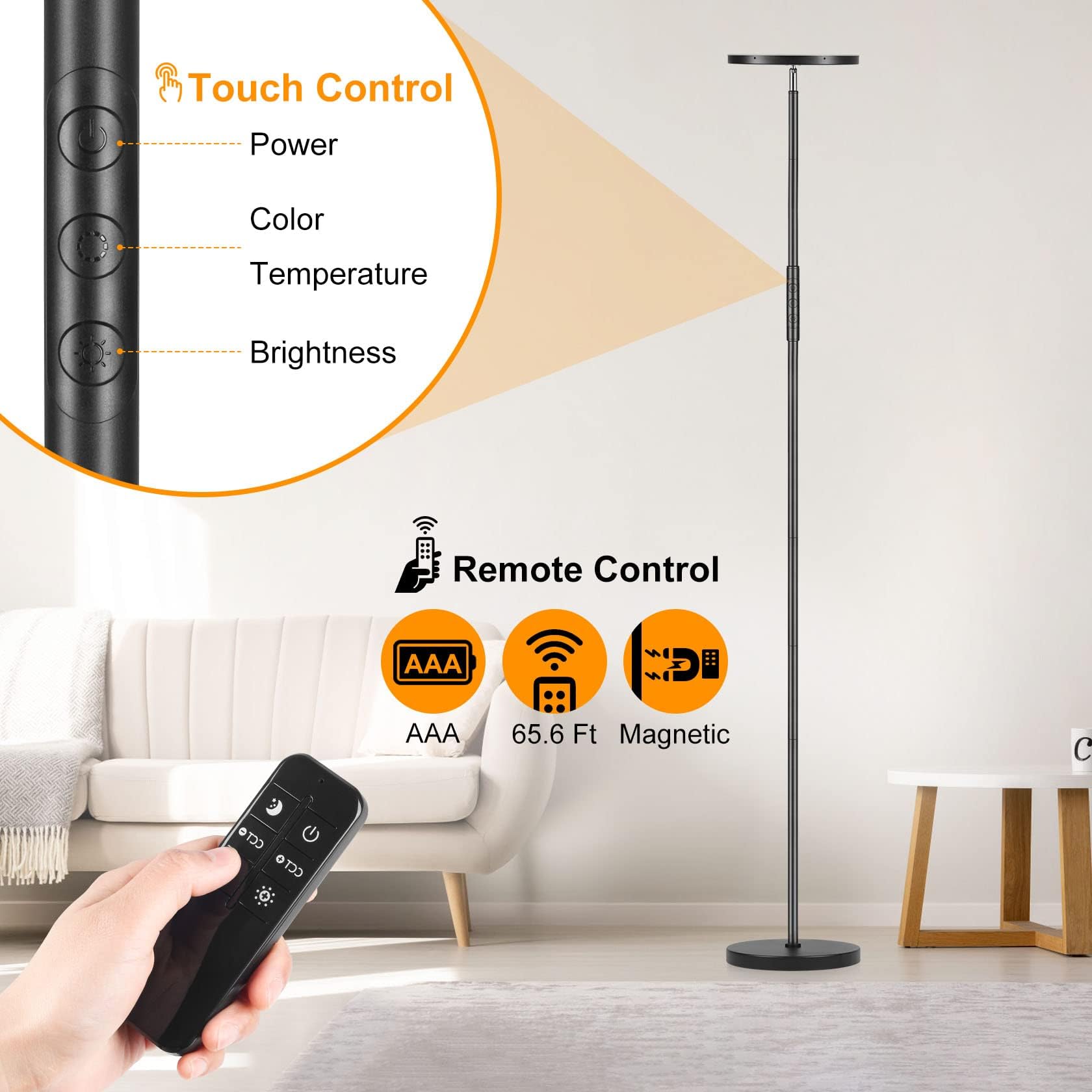 LED Stehlampe Wohnzimmer Dimmbar, 36W 3600LM Deckenfluter mit Fernbedienung & Touchsteuerung, 1-Minuten-Installation, Augenschonende Stehlampe Modern für Wohnzimmer,Büro,Esszimmer,Schlafzimmer(Schwarz