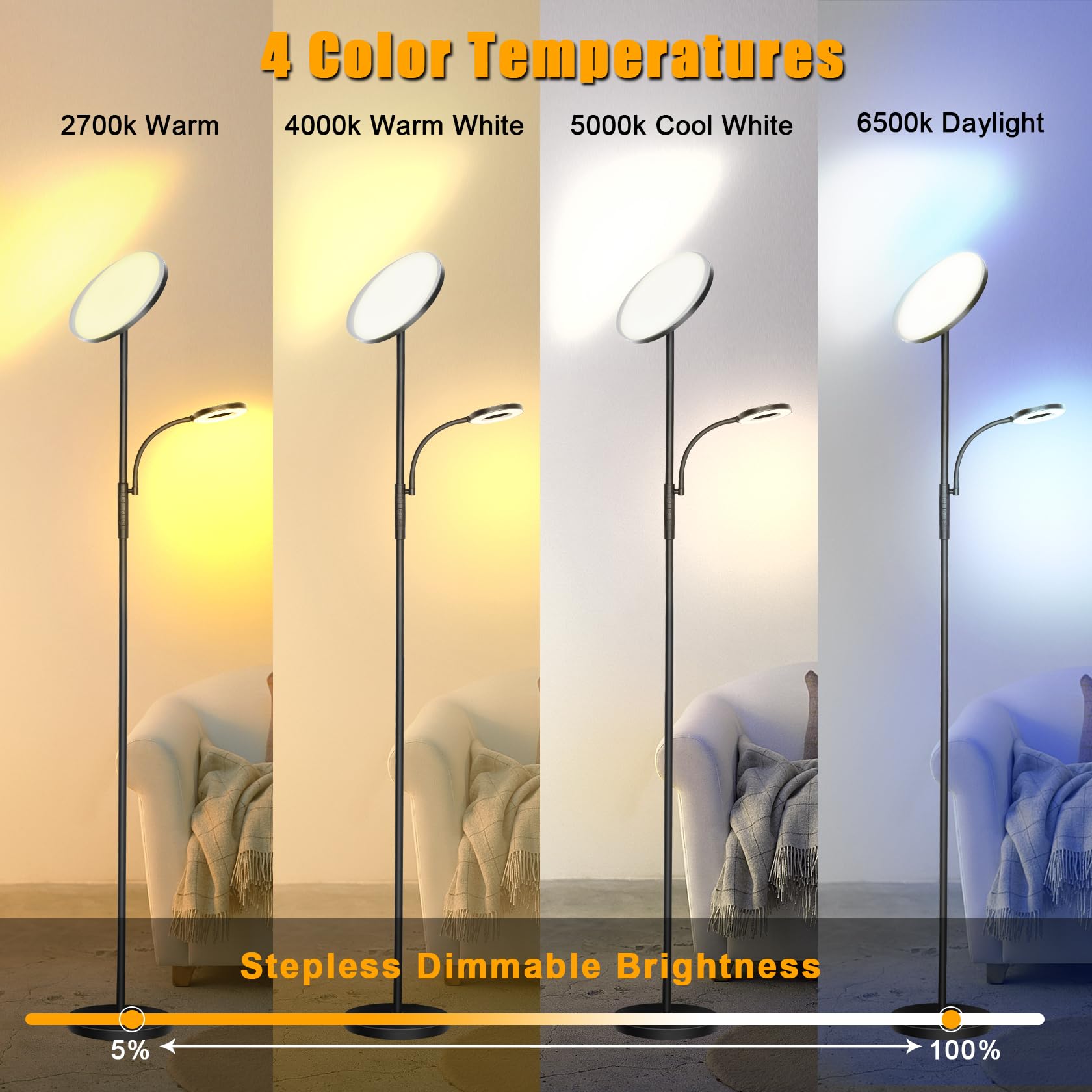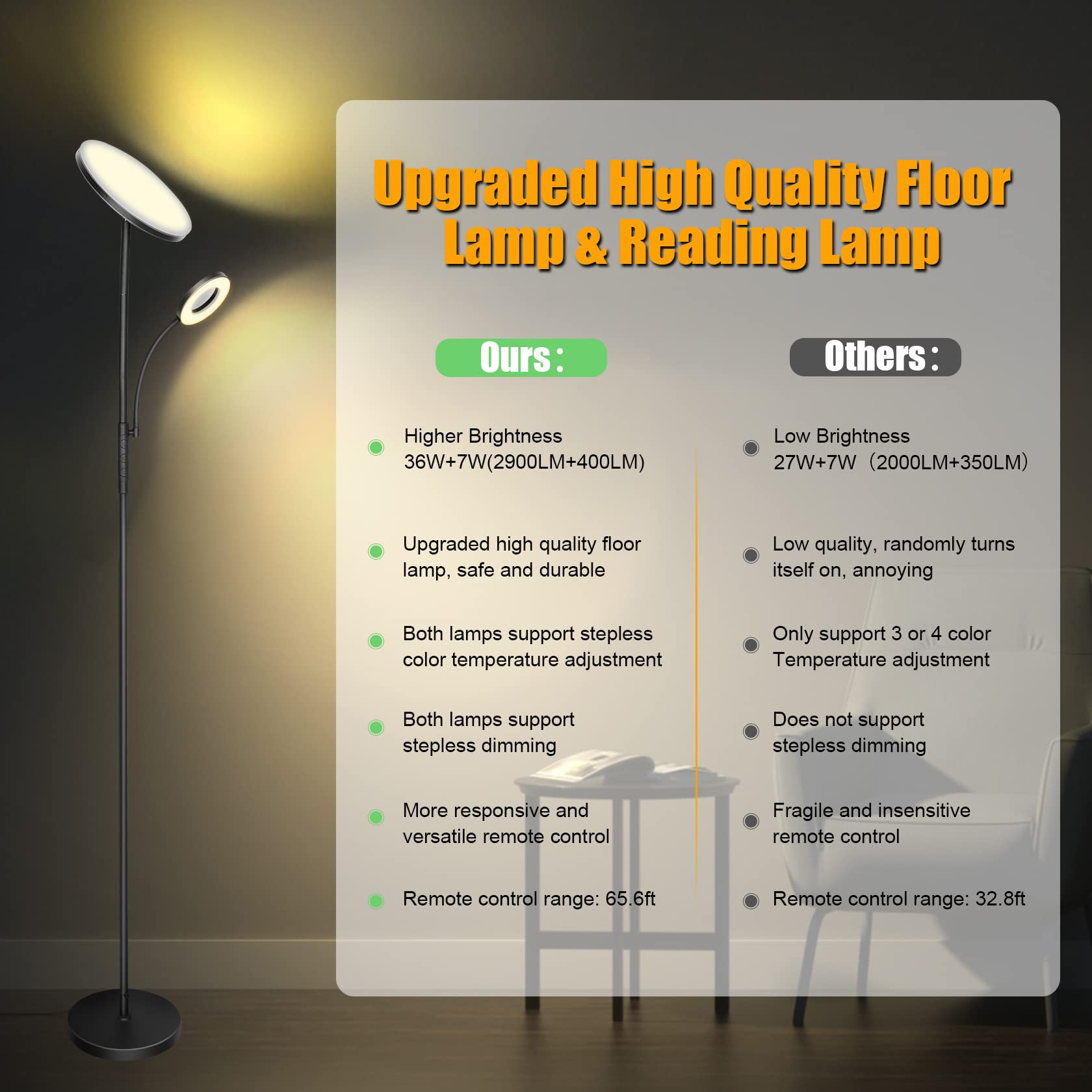 ???3000LM Superhelle Stehlampe?Die Hauptfackel Stehlampe besteht aus 36W LED-Lampe einschliesslich 132PCS Lampenperlen, die einer 300W Glühbirne entsprechen, was Ihre Stromrechnungen erheblich spart. Das zeitlose, minimalistische Design bringt Raffinesse in Ihr Wohnzimmer, Schlafzimmer und Büro.;???600LM Einstellbare Leselampe?Die 7W einstellbare Schwanenhals Sub-Lampe macht die Mängel der Hauptlampe, die nicht nach unten beleuchtet werden kann, seine Farbtemperaturen und Helligkeit Arten, Kontrollmethoden, etc., im Allgemeinen im Einklang mit der Hauptlampe, ideal zum Lesen, Arbeiten, Krankenpflege, etc.;???Fernbedienung & Touch-Steuerung?Beide Steuerungsmethoden ermöglichen alle Operationen. Inklusive 4 Farbtemperaturen: 2700K, 4000K, 5000K und 6500K, und 10-fache Helligkeit. Sie können es auch stufenlos von warmem Weiss zu kühlem Weiss dimmen, oder die Helligkeit von 5% bis 100% stufenlos dimmen, und alle Ihre Einstellungen können gespeichert werden. Wir haben auch einen "Nachtmodus" und einen "Lesemodus" in die Fernbedienung integriert, um Ihre Beleuchtungsbedürfnisse bequemer zu erfüllen.;???Verstellbarer Lampenkopf & Sicherer Sockel?Die Stehlampe kann um 350° horizontal gedreht und um 180° vertikal geschwenkt werden, so dass Sie fast jede Ecke Ihres Zimmers beleuchten können. Der 2,5kg schwere Lampenfuss hält die Stehlampe stabil und sicher genug, um nicht um Ihre Kinder oder Haustiere zu kippen.;???Hochwertiges Material & Einfache Montage?Das Lampengehäuse ist aus hochwertigem Acryl gefertigt, um weiches Licht und Augenschutz zu emittieren, und der robuste Metallstab macht die Lampe haltbarer. Es ist einfach zu montieren, es dauert weniger als 5 Minuten und alle Lampenteile können zusammengebaut werden. Wenn Sie irgendwelche Fragen haben, kontaktieren Sie uns bitte