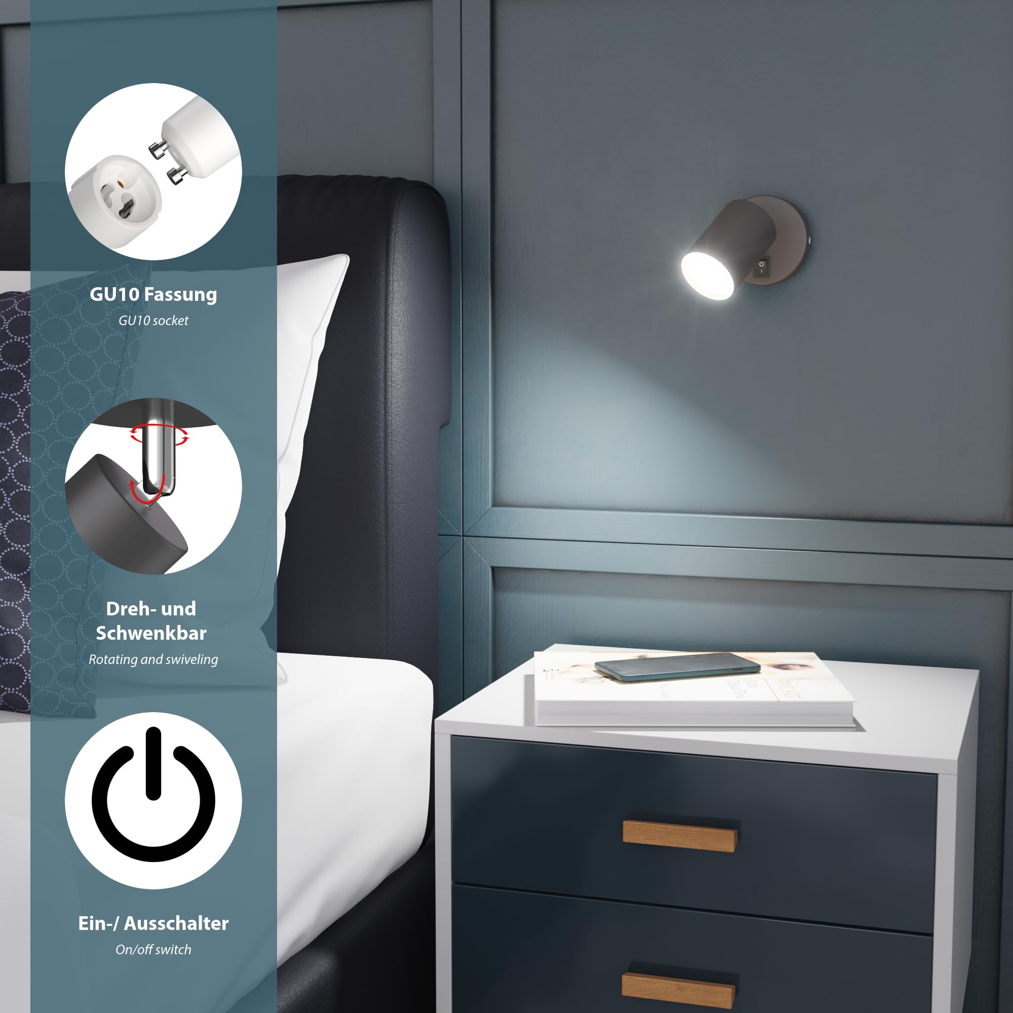 Die Wandlampe verfügt über eine GU10-Fassung, die es Ihnen ermöglicht, ein passendes Leuchtmittel nach Ihrem Belieben zu wählen. Schaffen Sie Ihr individuelles und für jede Umgebung passendes Lichtkonzept.