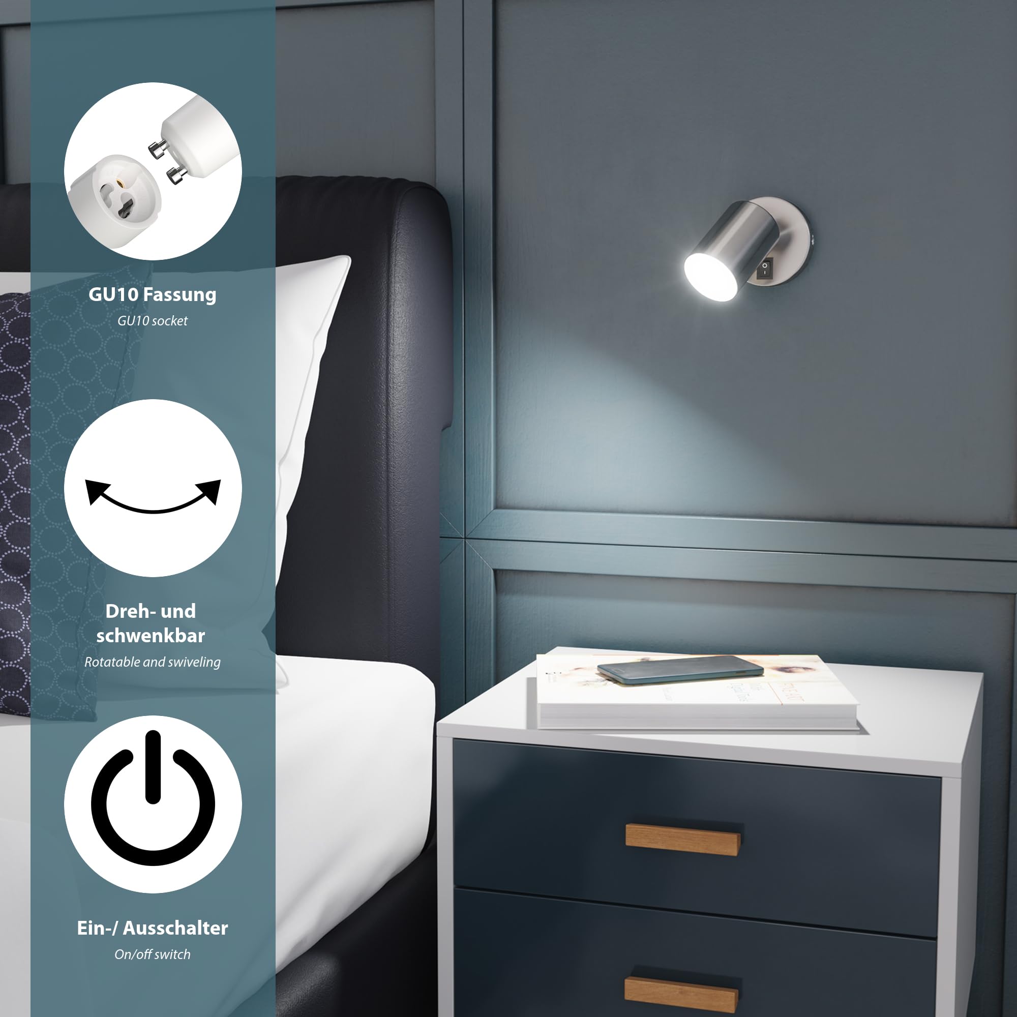 Die Wandlampe verfügt über eine GU10-Fassung, die es Ihnen ermöglicht, ein passendes Leuchtmittel nach Ihrem Belieben zu wählen. Schaffen Sie Ihr individuelles und für jede Umgebung passendes Lichtkonzept.