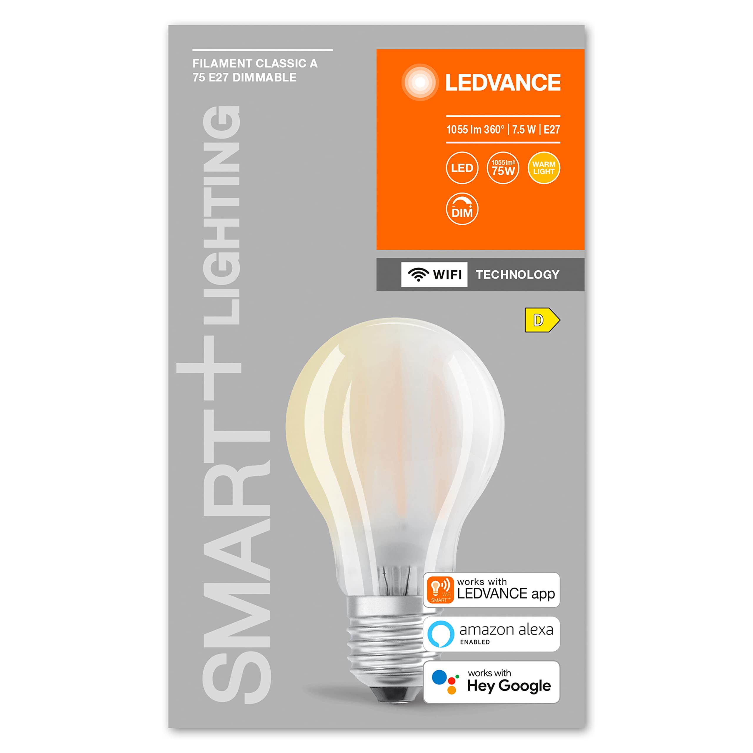 Klassische Kolbenform mit Glühwendel-Design mit WiFi-Technologie. Produkteigenschaften. Steuerbar über LEDVANCE SMART+ WiFi App (mit mindestens Android 4.4 oder iOS 9.0). Steuerung über Google Assistant oder Amazon Alexa möglich. Netzwerkprotokoll: WiFi. Dimmbar. Lebensdauer: bis zu 15.000 hProduktvorteile. Drahtlose Steuerung über App. Einfache Installation und Nutzung. Enthält kein QuecksilberAnwendungsgebiete. Allgemeinbeleuchtung. Wohnräume. Gewerbe (Hotels, Bars, Boutiquen usw.). Aussenanwendungen nur in geeigneten Leuchten.